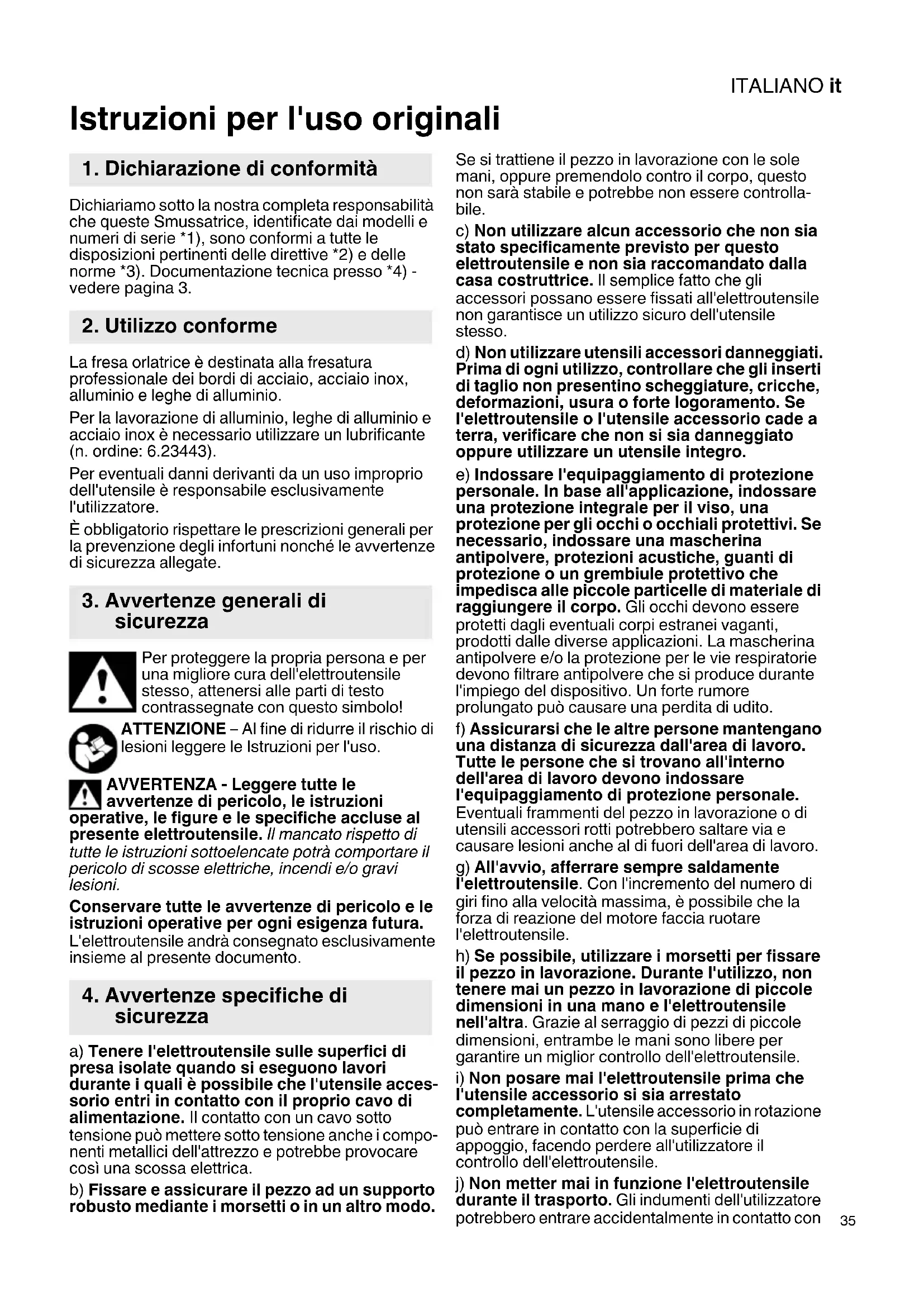Istruzioni per l'uso originali Dichiariamo sotto la nostra completa responsabilità che queste Smussatrice, identificate dai modelli e numeri di serie *1), sono conformi a tutte le disposizioni pertinenti delle direttive *2) e delle norme *3). Documentazione tecnica presso *4) - vedere pagina 3. La fresa orlatrice è destinata alla fresatura professionale dei bordi di acciaio, acciaio inox, alluminio e leghe di alluminio. Per la lavorazione di alluminio, leghe di alluminio e acciaio inox è necessario utilizzare un lubrificante (n. ordine: 6.23443). Per eventuali danni derivanti da un uso improprio dell'utensile è responsabile esclusivamente l'utilizzatore. È obbligatorio rispettare le prescrizioni generali per la prevenzione degli infortuni nonché le avvertenze di sicurezza allegate. Per proteggere la propria persona e per una migliore cura dell'elettroutensile stesso, attenersi alle parti di testo contrassegnate con questo simbolo! ATTENZIONE – Al fine di ridurre il rischio di lesioni leggere le Istruzioni per l'uso. AVVERTENZA - Leggere tutte le avvertenze di pericolo, le istruzioni operative, le figure e le specifiche accluse al presente elettroutensile. Il mancato rispetto di tutte le istruzioni sottoelencate potrà comportare il pericolo di scosse elettriche, incendi e/o gravi lesioni. Conservare tutte le avvertenze di pericolo e le istruzioni operative per ogni esigenza futura. L'elettroutensile andrà consegnato esclusivamente insieme al presente documento. a) Tenere l'elettroutensile sulle superfici di presa isolate quando si eseguono lavori durante i quali è possibile che l'utensile acces- sorio entri in contatto con il proprio cavo di alimentazione. Il contatto con un cavo sotto tensione può mettere sotto tensione anche i compo- nenti metallici dell'attrezzo e potrebbe provocare così una scossa elettrica. b) Fissare e assicurare il pezzo ad un supporto robusto mediante i morsetti o in un altro modo. Se si trattiene il pezzo in lavorazione con le sole mani, oppure premendolo contro il corpo, questo non sarà stabile e potrebbe non essere controlla- bile. c) Non utilizzare alcun accessorio che non sia stato specificamente previsto per questo elettroutensile e non sia raccomandato dalla casa costruttrice. Il semplice fatto che gli accessori possano essere fissati all'elettroutensile non garantisce un utilizzo sicuro dell'utensile stesso. d) Non utilizzare utensili accessori danneggiati. Prima di ogni utilizzo, controllare che gli inserti di taglio non presentino scheggiature, cricche, deformazioni, usura o forte logoramento. Se l'elettroutensile o l'utensile accessorio cade a terra, verificare che non si sia danneggiato oppure utilizzare un utensile integro. e) Indossare l'equipaggiamento di protezione personale. In base all'applicazione, indossare una protezione integrale per il viso, una protezione per gli occhi o occhiali protettivi. Se necessario, indossare una mascherina antipolvere, protezioni acustiche, guanti di protezione o un grembiule protettivo che impedisca alle piccole particelle di materiale di raggiungere il corpo. Gli occhi devono essere protetti dagli eventuali corpi estranei vaganti, prodotti dalle diverse applicazioni. La mascherina antipolvere e/o la protezione per le vie respiratorie devono filtrare antipolvere che si produce durante l'impiego del dispositivo. Un forte rumore prolungato può causare una perdita di udito. f) Assicurarsi che le altre persone mantengano una distanza di sicurezza dall'area di lavoro. Tutte le persone che si trovano all'interno dell'area di lavoro devono indossare l'equipaggiamento di protezione personale. Eventuali frammenti del pezzo in lavorazione o di utensili accessori rotti potrebbero saltare via e causare lesioni anche al di fuori dell'area di lavoro. g) All'avvio, afferrare sempre saldamente l'elettroutensile. Con l'incremento del numero di giri fino alla velocità massima, è possibile che la forza di reazione del motore faccia ruotare l'elettroutensile. h) Se possibile, utilizzare i morsetti per fissare il pezzo in lavorazione. Durante l'utilizzo, non tenere mai un pezzo in lavorazione di piccole dimensioni in una mano e l'elettroutensile nell'altra. Grazie al serraggio di pezzi di piccole dimensioni, entrambe le mani sono libere per garantire un miglior controllo dell'elettroutensile.
