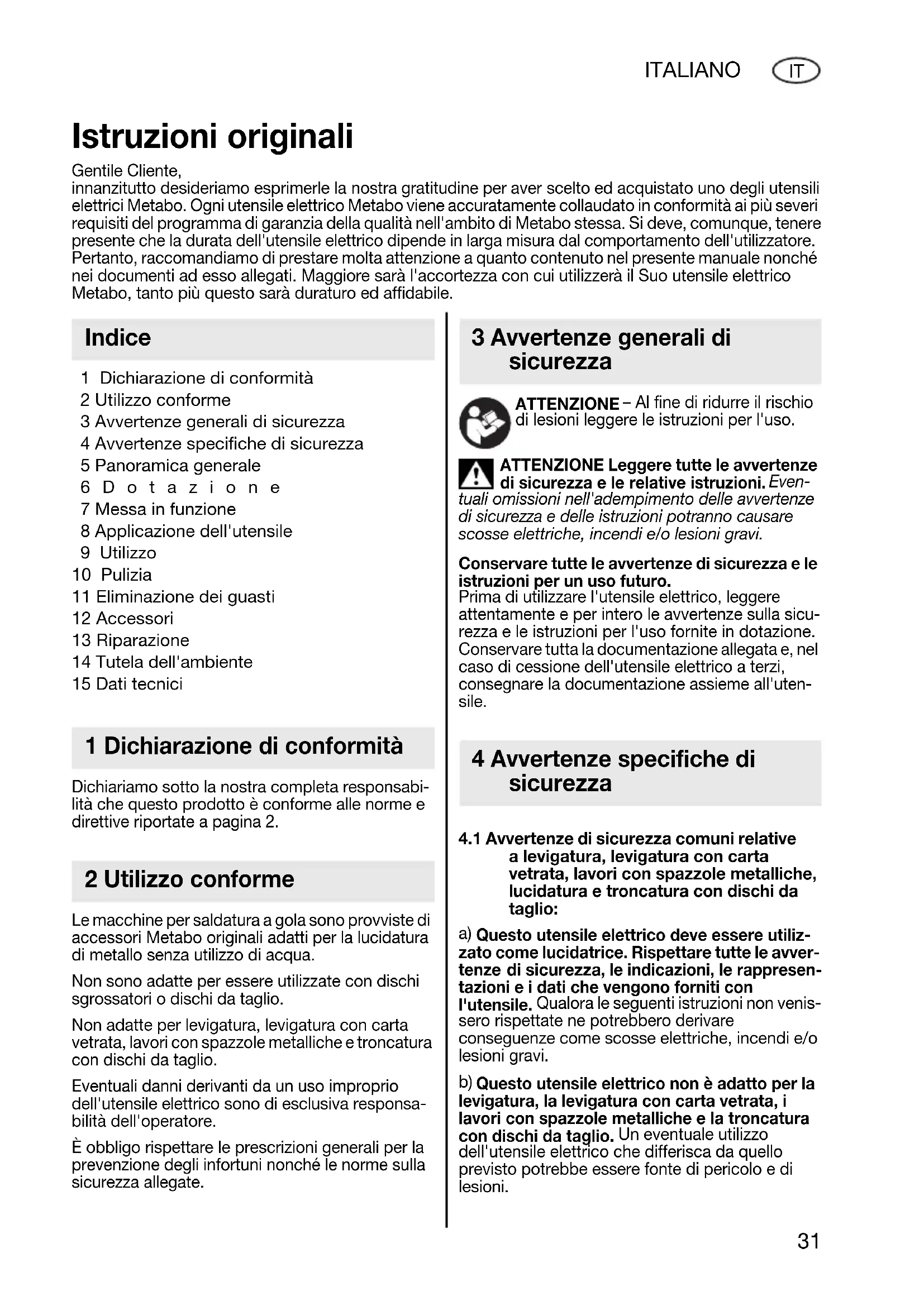 1 Dichiarazione di conformità 2 Utilizzo conforme 3 Avvertenze generali di sicurezza 4 Avvertenze specifiche di sicurezza 5 Panoramica generale 6Dotazione 7 Messa in funzione 8 Applicazione dell'utensile 9 Utilizzo 10 Pulizia 11 Eliminazione dei guasti 12 Accessori 13 Riparazione 14 Tutela dell'ambiente 15 Dati tecnici Dichiariamo sotto la nostra completa responsabi- lità che questo prodotto è conforme alle norme e direttive riportate a pagina 2. Le macchine per saldatura a gola sono provviste di accessori Metabo originali adatti per la lucidatura di metallo senza utilizzo di acqua. Non sono adatte per essere utilizzate con dischi sgrossatori o dischi da taglio. Non adatte per levigatura, levigatura con carta vetrata, lavori con spazzole metalliche e troncatura con dischi da taglio. Eventuali danni derivanti da un uso improprio dell'utensile elettrico sono di esclusiva responsa- bilità dell'operatore. È obbligo rispettare le prescrizioni generali per la prevenzione degli infortuni nonché le norme sulla sicurezza allegate. ATTENZIONE – Al fine di ridurre il rischio di lesioni leggere le istruzioni per l'uso. ATTENZIONE Leggere tutte le avvertenze di sicurezza e le relative istruzioni. Even- tuali omissioni nell'adempimento delle avvertenze di sicurezza e delle istruzioni potranno causare scosse elettriche, incendi e/o lesioni gravi. Conservare tutte le avvertenze di sicurezza e le istruzioni per un uso futuro. Prima di utilizzare l'utensile elettrico, leggere attentamente e per intero le avvertenze sulla sicu- rezza e le istruzioni per l'uso fornite in dotazione. Conservare tutta la documentazione allegata e, nel caso di cessione dell'utensile elettrico a terzi, consegnare la documentazione assieme all'uten- sile.