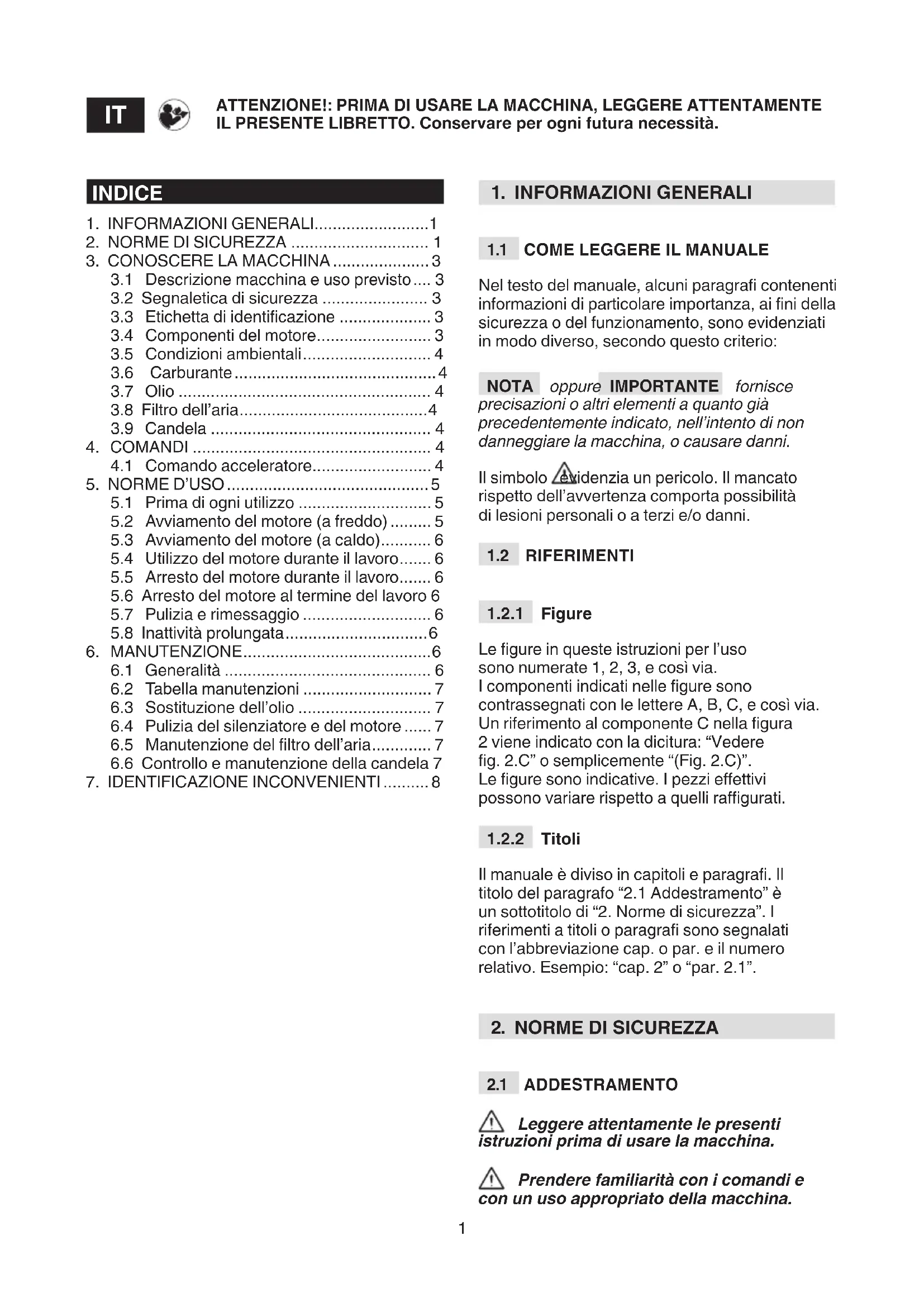 Questa macchina è un motore a scoppio. Il motore è un’apparecchiatura le cui prestazioni, regolarità di funzionamento e durata sono condizionati da molti fattori, alcuni esterni ed altri strettamente correlati alla qualità dei prodotti impiegati e alla regolarità della manutenzione. Qui di seguito sono riportate alcune informazioni aggiuntive che permettono un utilizzo più consapevole della vostra macchina. Qualsiasi altro impiego, diorme da quelli sopra citati, può rivelarsi pericoloso e causare danni a persone e/o cose. IMPORTANTE L’uso improprio della macchina comporta il decadimento della garanzia e il declino di ogni responsabilità del Costruttore, riversando sull’utilizzatore gli oneri derivanti da danni o lesioni proprie o a terzi.