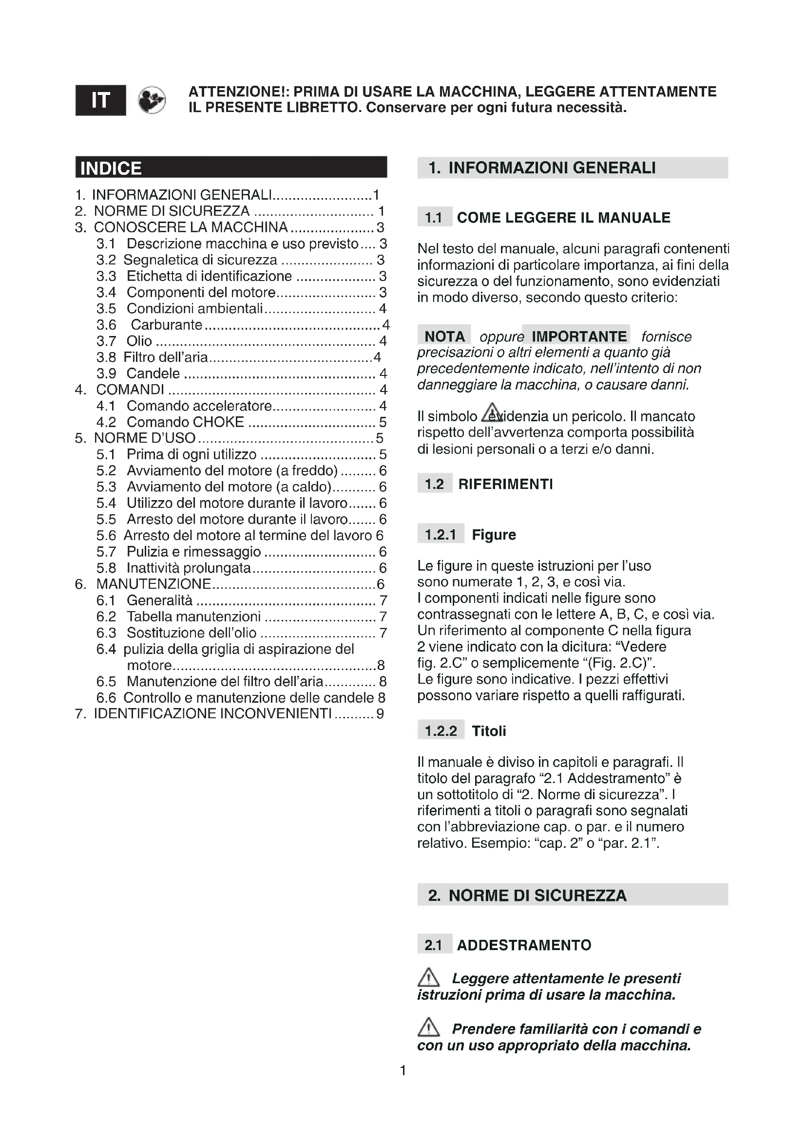 Questa macchina è un motore a scoppio. Il motore è un’apparecchiatura le cui prestazioni, regolarità di funzionamento e durata sono condizionati da molti fattori, alcuni esterni ed altri strettamente correlati alla qualità dei prodotti impiegati e alla regolarità della manutenzione. Qui di seguito sono riportate alcune informazioni aggiuntive che permettono un utilizzo più consapevole della vostra macchina. Qualsiasi altro impiego, diorme da quelli sopra citati, può rivelarsi pericoloso e causare danni a persone e/o cose. IMPORTANTE L’uso improprio della macchina comporta il decadimento della garanzia e il declino di ogni responsabilità del Costruttore, riversando sull’utilizzatore gli oneri derivanti da danni o lesioni proprie o a terzi.
