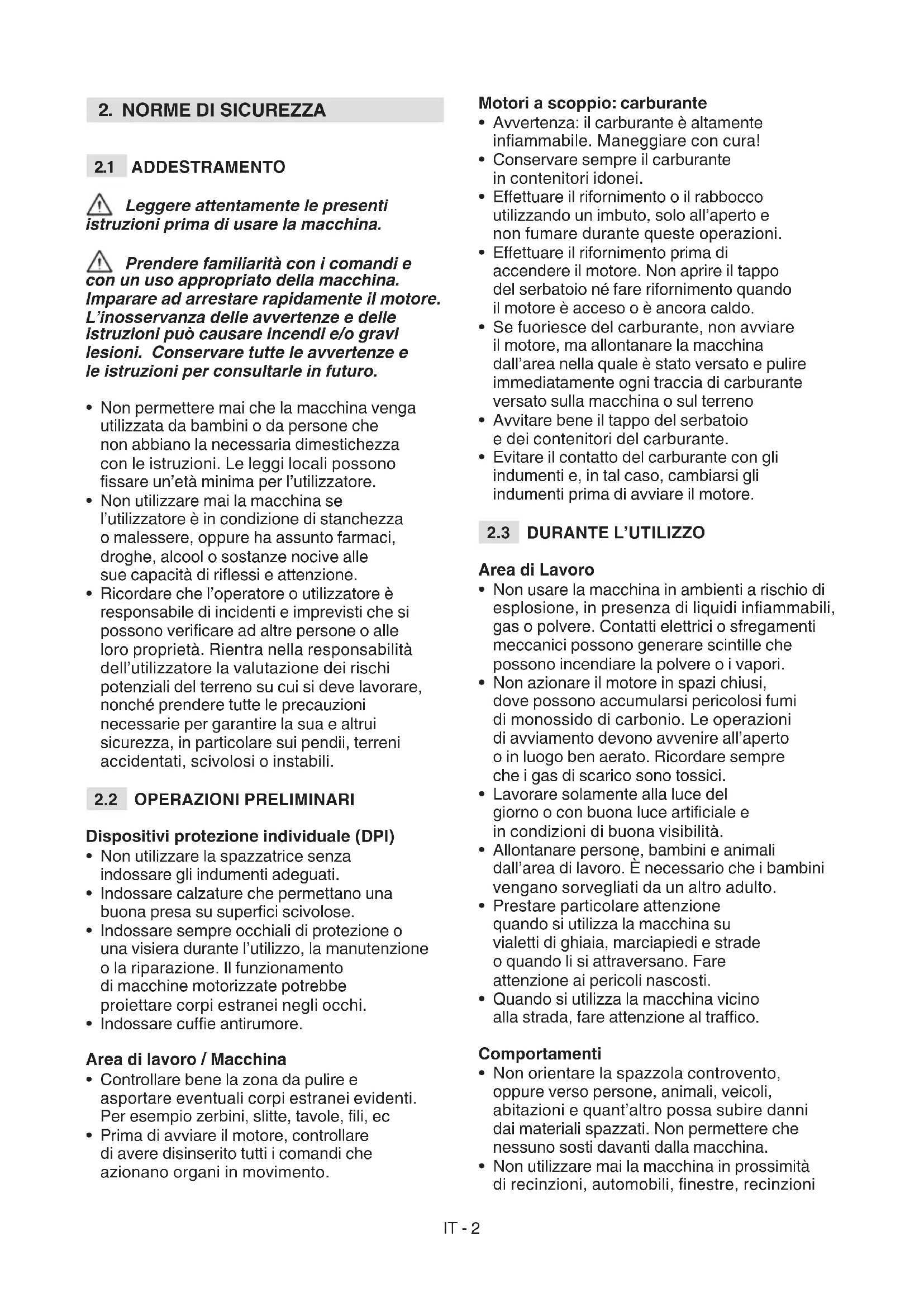 - Non utilizzare mai la macchina in prossimità di recinzioni, automobili, nestre, recinzioniIT - 3 di vetro, ecc. senza aver adeguatamente regolato la direzione della spazzola.