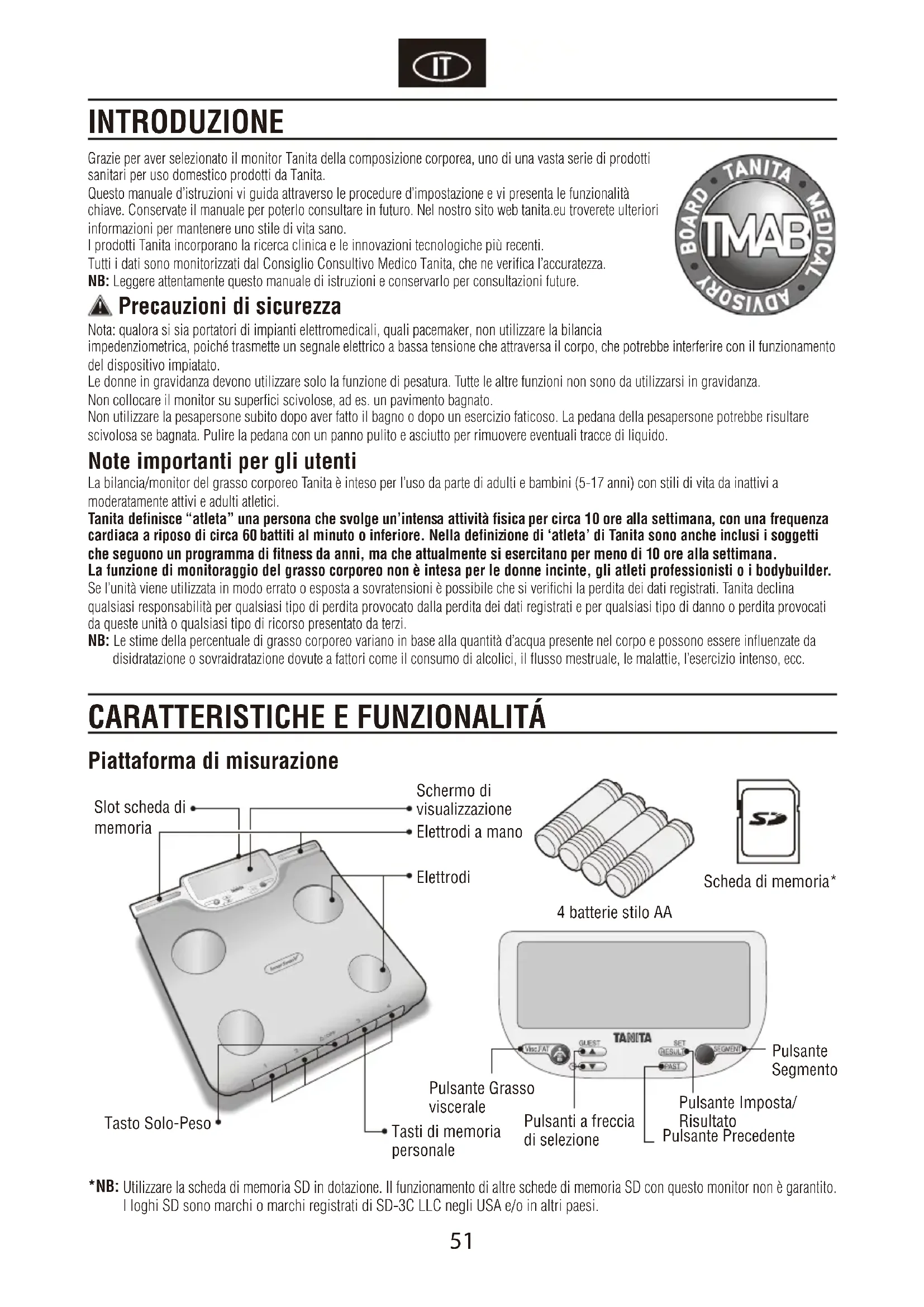 verschijnt tijdens het meten. Er kan geen uitlezing zijn als het weegvermogen wordt overschreden. SPECIFICATIES BC-601 / 602 / 613 Gewicht Capaciteit 150kg (330lb) (23st 8lb) Gewicht Increment 0.1kg (0.2lb) (0.2lb) Lichaamsvet Increment 0.1% Persoonlijke gegeven 4 geheugens Voeding Batterijmaat AA (4) batterijen (meegeleverd) Stroomverbruik 150 mA maximaal Meetstroom 50 kHz, 100 µA51 Grazie per aver selezionato il monitor Tanita della composizione corporea, uno di una vasta serie di prodotti sanitari per uso domestico prodotti da Tanita.Questo manuale d’istruzioni vi guida attraverso le procedure d’impostazione e vi presenta le funzionalità chiave. Conservate il manuale per poterlo consultare in futuro. Nel nostro sito web tanita.eu troverete ulteriori informazioni per mantenere uno stile di vita sano.I prodotti Tanita incorporano la ricerca clinica e le innovazioni tecnologiche più recenti.Tutti i dati sono monitorizzati dal Consiglio Consultivo Medico Tanita, che ne verifica l’accuratezza.NB: Leggere attentamente questo manuale di istruzioni e conservarlo per consultazioni future. Precauzioni di sicurezza Nota: qualora si sia portatori di impianti elettromedicali, quali pacemaker, non utilizzare la bilancia impedenziometrica, poiché trasmette un segnale elettrico a bassa tensione che attraversa il corpo, che potrebbe interferire con il funzionamento del dispositivo impiatato. Le donne in gravidanza devono utilizzare solo la funzione di pesatura. Tutte le altre funzioni non sono da utilizzarsi in gravidanza. Non collocare il monitor su superfici scivolose, ad es. un pavimento bagnato. Non utilizzare la pesapersone subito dopo aver fatto il bagno o dopo un esercizio faticoso. La pedana della pesapersone potrebbe risultare scivolosa se bagnata. Pulire la pedana con un panno pulito e asciutto per rimuovere eventuali tracce di liquido. Note importanti per gli utenti La bilancia/monitor del grasso corporeo Tanita è inteso per l’uso da parte di adulti e bambini (5-17 anni) con stili di vita da inattivi a moderatamente attivi e adulti atletici. Tanita definisce “atleta” una persona che svolge un’intensa attività fisica per circa 10 ore alla settimana, con una frequenza cardiaca a riposo di circa 60 battiti al minuto o inferiore. Nella definizione di ‘atleta’ di Tanita sono anche inclusi i soggetti che seguono un programma di fitness da anni, ma che attualmente si esercitano per meno di 10 ore alla settimana. La funzione di monitoraggio del grasso corporeo non è intesa per le donne incinte, gli atleti professionisti o i bodybuilder. Se l’unità viene utilizzata in modo errato o esposta a sovratensioni è possibile che si verifichi la perdita dei dati registrati. Tanita declina qualsiasi responsabilità per qualsiasi tipo di perdita provocato dalla perdita dei dati registrati e per qualsiasi tipo di danno o perdita provocati da queste unità o qualsiasi tipo di ricorso presentato da terzi. NB: Le stime della percentuale di grasso corporeo variano in base alla quantità d’acqua presente nel corpo e possono essere influenzate da disidratazione o sovraidratazione dovute a fattori come il consumo di alcolici, il flusso mestruale, le malattie, l’esercizio intenso, ecc. INTRODUZIONE