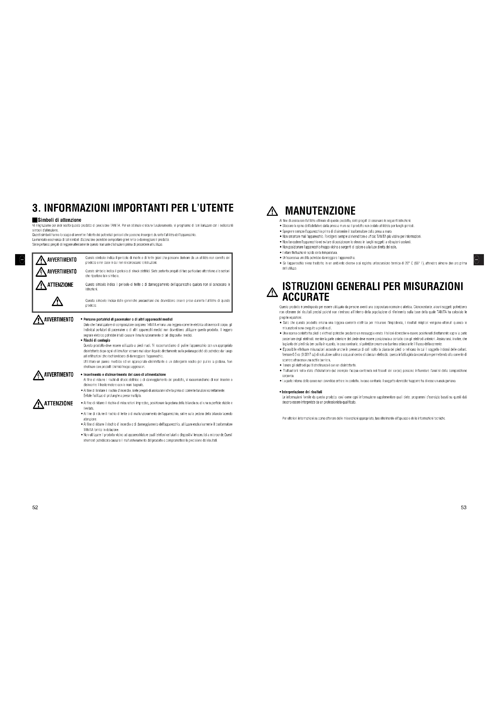 Simboli di attenzione Vi ringraziamo per aver scelto questo prodotto di precisione TANITA. Per un ottimale e sicuro funzionamento, vi preghiamo di familiarizzare con i sottostanti simboli d’attenzione. Questi simboli hanno lo scopo di avvertire l’utente dei potenziali pericoli che possono insorgere durante l’utilizzo dell’apparecchio. La mancata osservanza di tali simboli d’attenzione potrebbe comportare gravi ferite o danneggiare il prodotto.Siete pertanto pregati di leggere attentamente questo manuale d’istruzioni prima di procedere all’utilizzo.