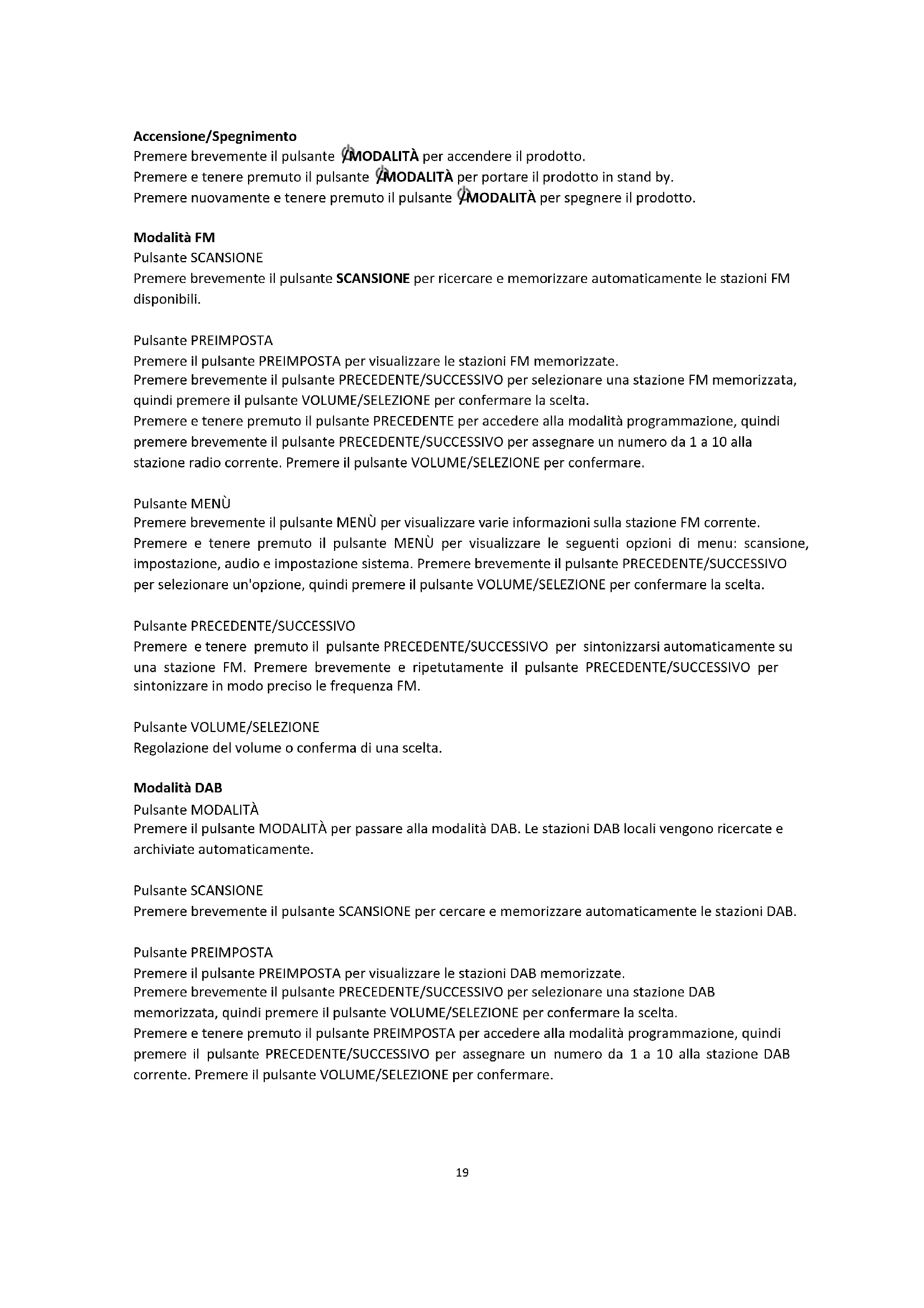 Accensione/Spegnimento Premere brevemente il pulsante /MODALITÀ per accendere il prodotto. Premere e tenere premuto il pulsante /MODALITÀ per portare il prodotto in stand by. Premere nuovamente e tenere premuto il pulsante /MODALITÀ per spegnere il prodotto. Modalità FM Pulsante SCANSIONE Premere brevemente il pulsante SCANSIONE per ricercare e memorizzare automaticamente le stazioni FM disponibili. Pulsante PREIMPOSTA Premere il pulsante PREIMPOSTA per visualizzare le stazioni FM memorizzate. Premere brevemente il pulsante PRECEDENTE/SUCCESSIVO per selezionare una stazione FM memorizzata, quindi premere il pulsante VOLUME/SELEZIONE per confermare la scelta. Premere e tenere premuto il pulsante PRECEDENTE per accedere alla modalità programmazione, quindi premere brevemente il pulsante PRECEDENTE/SUCCESSIVO per assegnare un numero da 1 a 10 alla stazione radio corrente. Premere il pulsante VOLUME/SELEZIONE per confermare. Pulsante MENÙ Premere brevemente il pulsante MENÙ per visualizzare varie informazioni sulla stazione FM corrente. Premere e tenere premuto il pulsante MENÙ per visualizzare le seguenti opzioni di menu: scansione, impostazione, audio e impostazione sistema. Premere brevemente il pulsante PRECEDENTE/SUCCESSIVO per selezionare un'opzione, quindi premere il pulsante VOLUME/SELEZIONE per confermare la scelta. Pulsante PRECEDENTE/SUCCESSIVO Premere e tenere premuto il pulsante PRECEDENTE/SUCCESSIVO per sintonizzarsi automaticamente su una stazione FM. Premere brevemente e ripetutamente il pulsante PRECEDENTE/SUCCESSIVO per sintonizzare in modo preciso le frequenza FM. Pulsante VOLUME/SELEZIONE Regolazione del volume o conferma di una scelta. Modalità DAB Pulsante MODALITÀ Premere il pulsante MODALITÀ per passare alla modalità DAB. Le stazioni DAB locali vengono ricercate e archiviate automaticamente. Pulsante SCANSIONE Premere brevemente il pulsante SCANSIONE per cercare e memorizzare automaticamente le stazioni DAB. Pulsante PREIMPOSTA Premere il pulsante PREIMPOSTA per visualizzare le stazioni DAB memorizzate. Premere brevemente il pulsante PRECEDENTE/SUCCESSIVO per selezionare una stazione DAB memorizzata, quindi premere il pulsante VOLUME/SELEZIONE per confermare la scelta. Premere e tenere premuto il pulsante PREIMPOSTA per accedere alla modalità programmazione, quindi premere il pulsante PRECEDENTE/SUCCESSIVO per assegnare un numero da 1 a 10 alla stazione DAB corrente. Premere il pulsante VOLUME/SELEZIONE per confermare.20 Pulsante MENÙ Premere brevemente il pulsante MENÙ per visualizzare varie informazioni sulla stazione DAB corrente. Premere e tenere premuto il pulsante MENÙ per visualizzare le seguenti opzioni di menu: Scansione completa, sintonizzazione manuale e sistema DRC Prune. Premere brevemente il pulsante PRECEDENTE/SUCCESSIVO per selezionare un'opzione, quindi premere il pulsante VOLUME/SELEZIONE per confermare la scelta. Pulsante SUCCESSIVO Premere brevemente il pulsante PRECEDENTE/SUCCESSIVO per selezionare una stazione DAB memorizzata, quindi premere il pulsante VOLUME/SELEZIONE per confermare la scelta. Pulsante VOLUME/SELEZIONE Regolazione del volume o conferma di una scelta. Modalità sveglia Pulsante SVEGLIA Premere brevemente il pulsante SVEGLIA per selezionare la sveglia 1. Premere nuovamente il pulsante SVEGLIA per selezionare la sveglia 2. Premere brevemente il pulsante PRECEDENTE/SUCCESSIVO per selezionare un'opzione di sveglia, quindi premere il pulsante VOLUME/SELEZIONE per confermare la scelta. Pulsante POSPONI Quando suona la sveglia, premere il tasto POSPONI per interrompere la suoneria. La sveglia suonerà ad intervalli di 9 minuti. Modalità AUX Premere il pulsante MODALITÀ per passare alla modalità AUX e collegare un dispositivo audio esterno alla presa LINEA ESTERNA. Pulsante MENÙ Premere brevemente il pulsante MENU per visualizzare varie informazioni sulla modalità AUX. Premere e tenere premuto il pulsante MENÙ per visualizzare un'opzione, quindi premere il pulsante VOLUME/SELEZIONE per confermare la scelta. Pulsante VOLUME/SELEZIONE Regolazione del volume. In modalità AUX i pulsanti SCANSIONE/PREIMPOSTA/PRECEDENTE/SUCCESSIVO non sono attivi. Uso degli auricolari È possibile collegare gli auricolari con una spina da 3,5mm (non in dotazione) all'apposito jack presente sul prodotto. SPECIFICHE Alimentazione elettrica Uscita 6VCC 1000mA Ingresso: 100-240VCA 50/60Hz Tipo di batteria 4 batterie AA (non fornite) DAB Da 174 MHz a 240 MHz