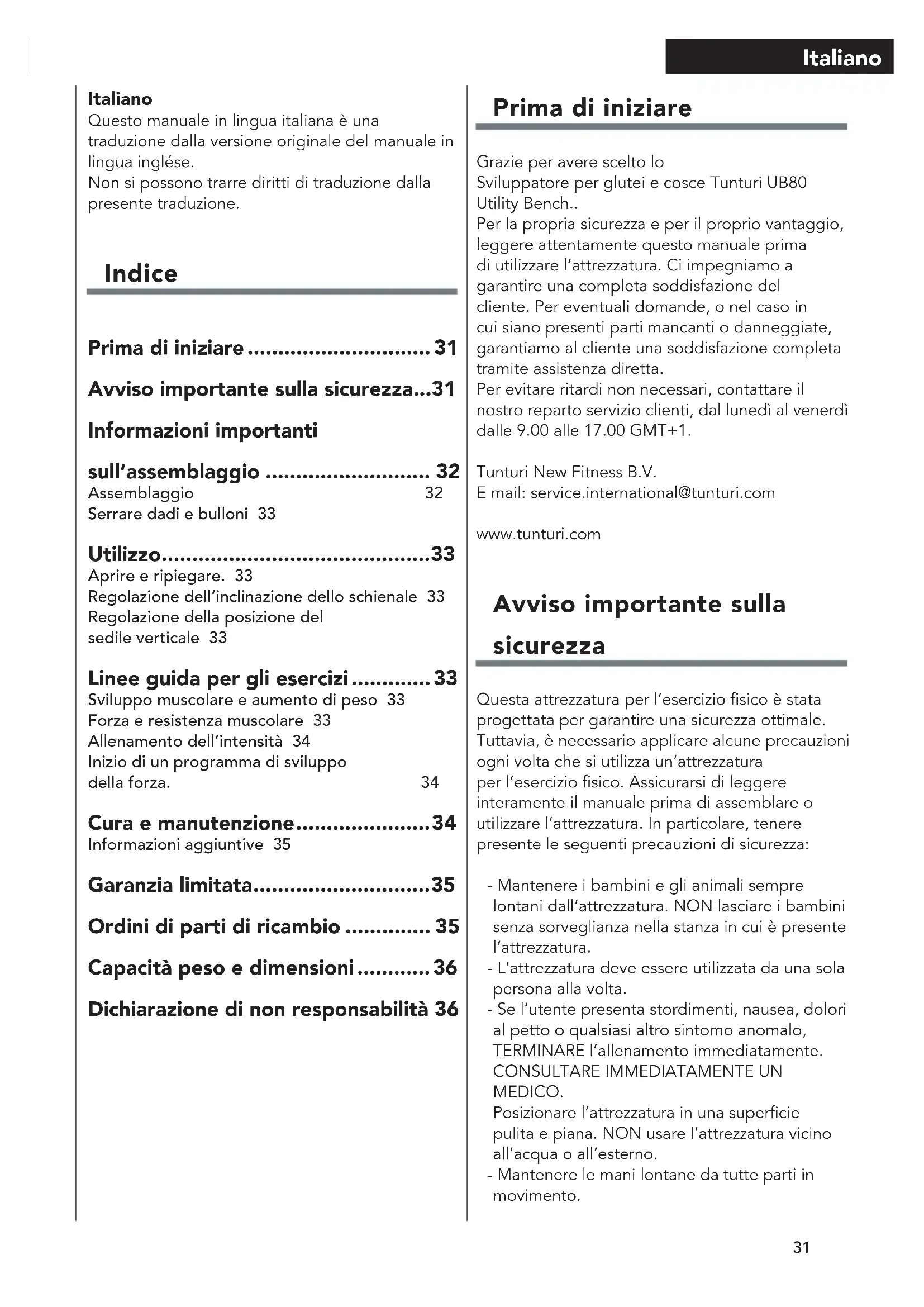 - Capacità peso e dimensioni Dichiarazione di non responsabilità 3632 Italiano - Indossare sempre un abbigliamento appropriato per l’esercizio fisico durante l’allenamento. NON indossare accappatoi o altro tipo di abbigliamento che potrebbe impigliarsi nell’attrezzatura. Quando si utilizza l’attrezzatura è richiesto l’uso di scarpe da corsa o aerobica. Utilizzare l’attrezzatura solo per lo scopo previsto come descritto in questo manuale. NON utilizzare allegati non consigliati dal produttore. - Non posizionare oggetti appuntiti vicino all’attrezzatura. - I disabili non devono usare l’attrezzatura. - Prima di utilizzare l’attrezzatura per l’allenamento, eseguire sempre esercizi di stretching per il riscaldamento. - Non utilizzare mai l’attrezzatura se non funziona correttamente. - Durante la sessione di allenamento è consigliata la presenza di un osservatore. - Questa attrezzatura è stata progettata e pensata solo per l’uso in casa e da parte del consumatore, non per l’uso commerciale. Avviso: Prima di iniziare qualsiasi programma di allenamento, consultare il proprio medico. Ciò risulta particolarmente importante per gli individui di età superiore ai 35 anni o per le persone con problemi di salute preesistenti. Leggere tutte le istruzioni prima di utilizzare una qualsiasi attrezzatura per l'allenamento. Tunturi New fitness bv. non si assume alcuna responsabilità per ferite personali o per danni alle proprietà causati dal prodotto o dal suo utilizzo. Conservare queste istruzioni! Informazioni importanti sull’assemblaggio Strumenti richiesti per assemblare la panca: Due chiavi regolabili. ‼ NOTA p. 36