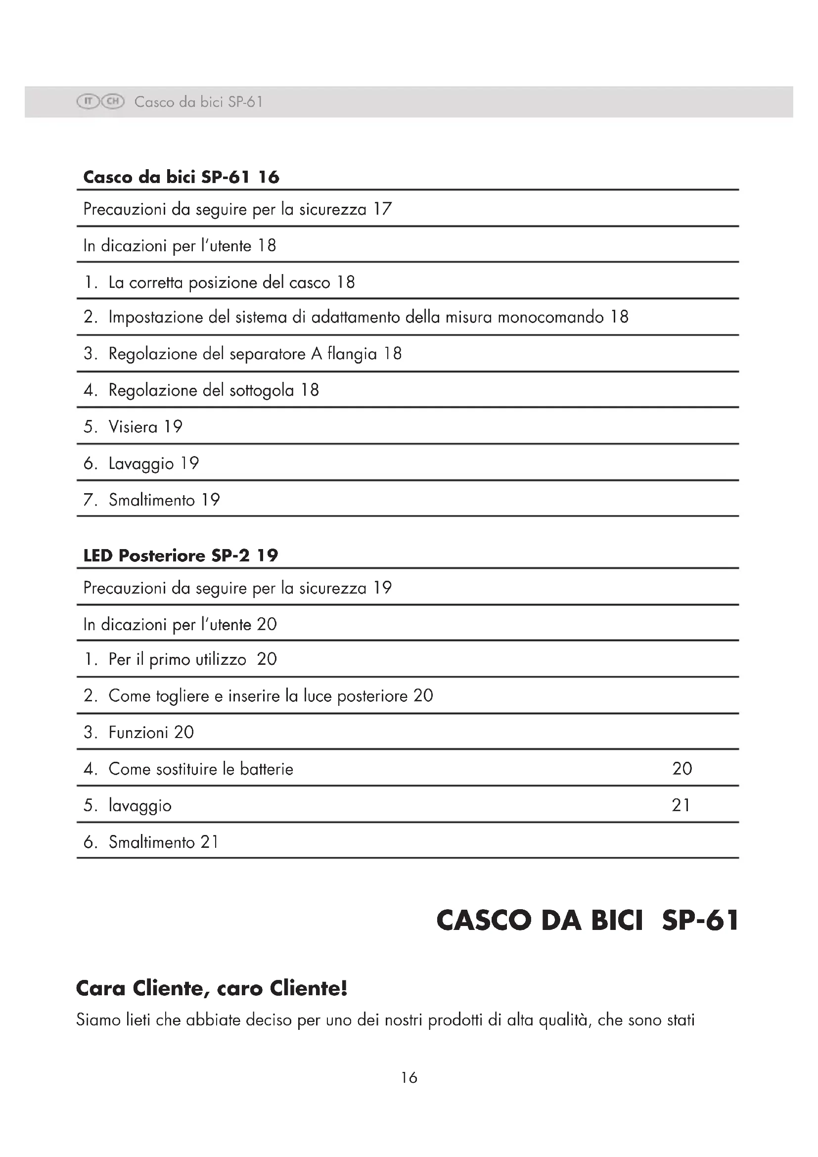 Cara Cliente, caro Cliente! Siamo lieti che abbiate deciso per uno dei nostri prodotti di alta qualità, che sono stati Casco da bici SP-61 Casco da bici SP-61 16 Precauzioni da seguire per la sicurezza 17 In dicazioni per l‘utente 18