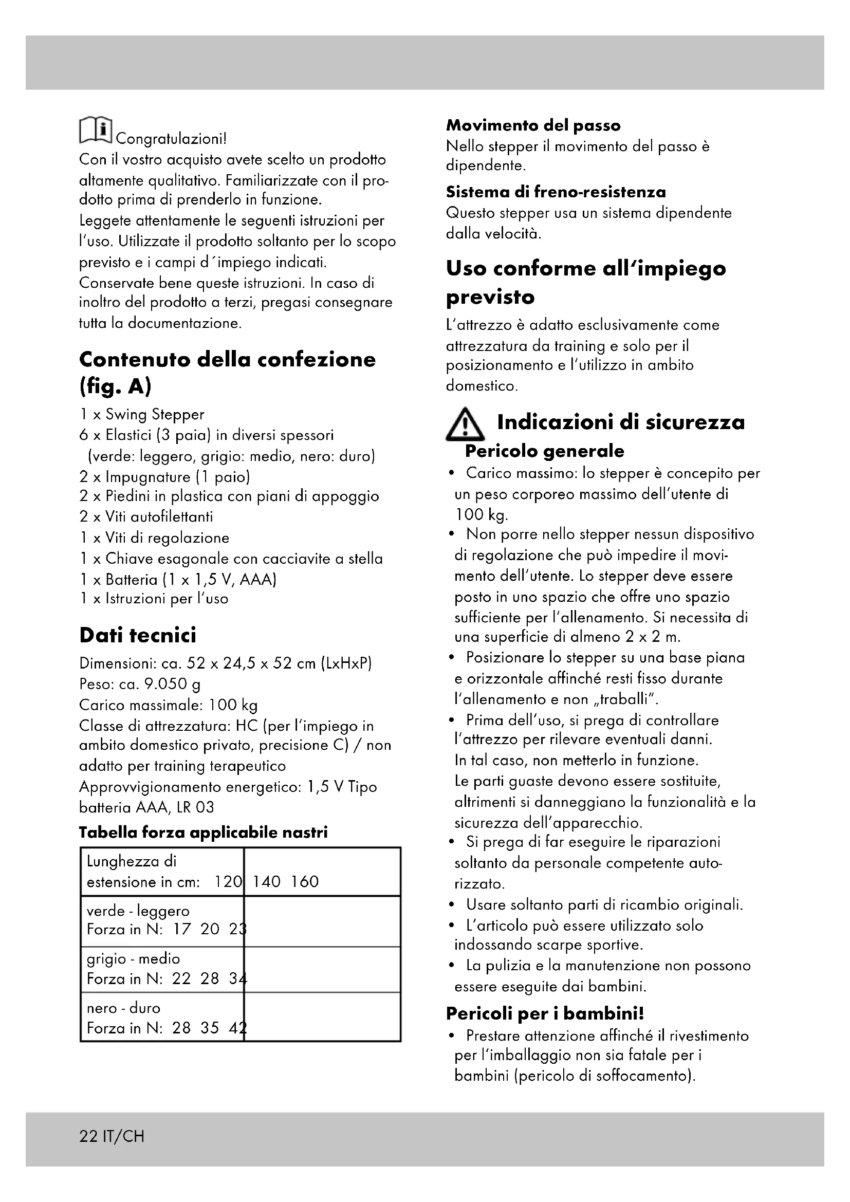 - Prestare attenzione affinché il rivestimento per l‘imballaggio non sia fatale per i bambini (pericolo di soffocamento). Congratulazioni! Con il vostro acquisto avete scelto un prodotto altamente qualitativo. Familiarizzate con il pro- dotto prima di prenderlo in funzione. Leggete attentamente le seguenti istruzioni per l‘uso. Utilizzate il prodotto soltanto per lo scopo previsto e i campi d´impiego indicati. Conservate bene queste istruzioni. In caso di inoltro del prodotto a terzi, pregasi consegnare tutta la documentazione. Contenuto della confezione (fig. A) 1 x Swing Stepper 6 x Elastici (3 paia) in diversi spessori (verde: leggero, grigio: medio, nero: duro) 2 x Impugnature (1 paio) 2 x Piedini in plastica con piani di appoggio 2 x Viti autofilettanti 1 x Viti di regolazione 1 x Chiave esagonale con cacciavite a stella 1 x Batteria (1 x 1,5 V, AAA) 1 x Istruzioni per l‘uso Dati tecnici Dimensioni: ca. 52 x 24,5 x 52 cm (LxHxP) Peso: ca. 9.050 g Carico massimale: 100 kg Classe di attrezzatura: HC (per l‘impiego in ambito domestico privato, precisione C) / non adatto per training terapeutico Approvvigionamento energetico: 1,5 V Tipo batteria AAA, LR 03 Tabella forza applicabile nastri Lunghezza di estensione in cm: 120 140 160 verde - leggero Forza in N: 17 20 23 grigio - medio Forza in N: 22 28 34 nero - duro Forza in N: 28 35 4223IT/CH Montaggio dello stepper Fase 1: Inserire entrambi i piedini in plastica nel tubo nella parte posteriore del supporto. I piani di appoggio sono rivolti verso l‘interno (fig. C). Per il fissaggio, avvitare le viti autofilet- tanti nel foro previsto sulla base del supporto. Fase 2: Avvitare la vite di regolazione nella filettatura sulla parte anteriore dello stepper. Con l‘impiego di questa vite è possibile regolare l‘altezza in salita delle superfici di calpestio. Per aumentare l‘altezza in salita ruotare la vite di regolazione in senso orario. Per ridurre l‘altezza in salita ruotare la vite di regolazione in senso orario. Fase 3: Allontanare il computer dallo stepper sollevan- dolo verso l‘alto. Inserire le batterie fornite in dotazione nel rispettivo vano nella parte inferi- ore del computer. Fare attenzione alla polarità corretta. Collegare il computer con la spina della custo- dia e inserirla nuovamente. Fare in modo che il cavo non si incastri. Fase 4: Decidere quali elastici si desidera utilizzare e fissare le impugnature ai rispettivi elastici. Agganciare i ganci di metallo negli occhi- elli sul supporto dello stepper e avvitare la chiusura nel gancio (fig. D): controllare prima dell‘allenamento il montaggio sicuro degli elasti- ci e che il gancio sia ben serrato. Attenzione! Gli occhielli sono orientati verso l‘alto esclusivamente per i carichi di trazione e non devono essere caricati eccessivamente. Sussiste, infatti, il pericolo di lesione e di danni allo stepper. Se non ci si allena con gli elastici, sganciarli dagli occhielli per evitare il pericolo di inciam- po. Controllare il corretto avvitamento di tutte le viti e dei dadi.