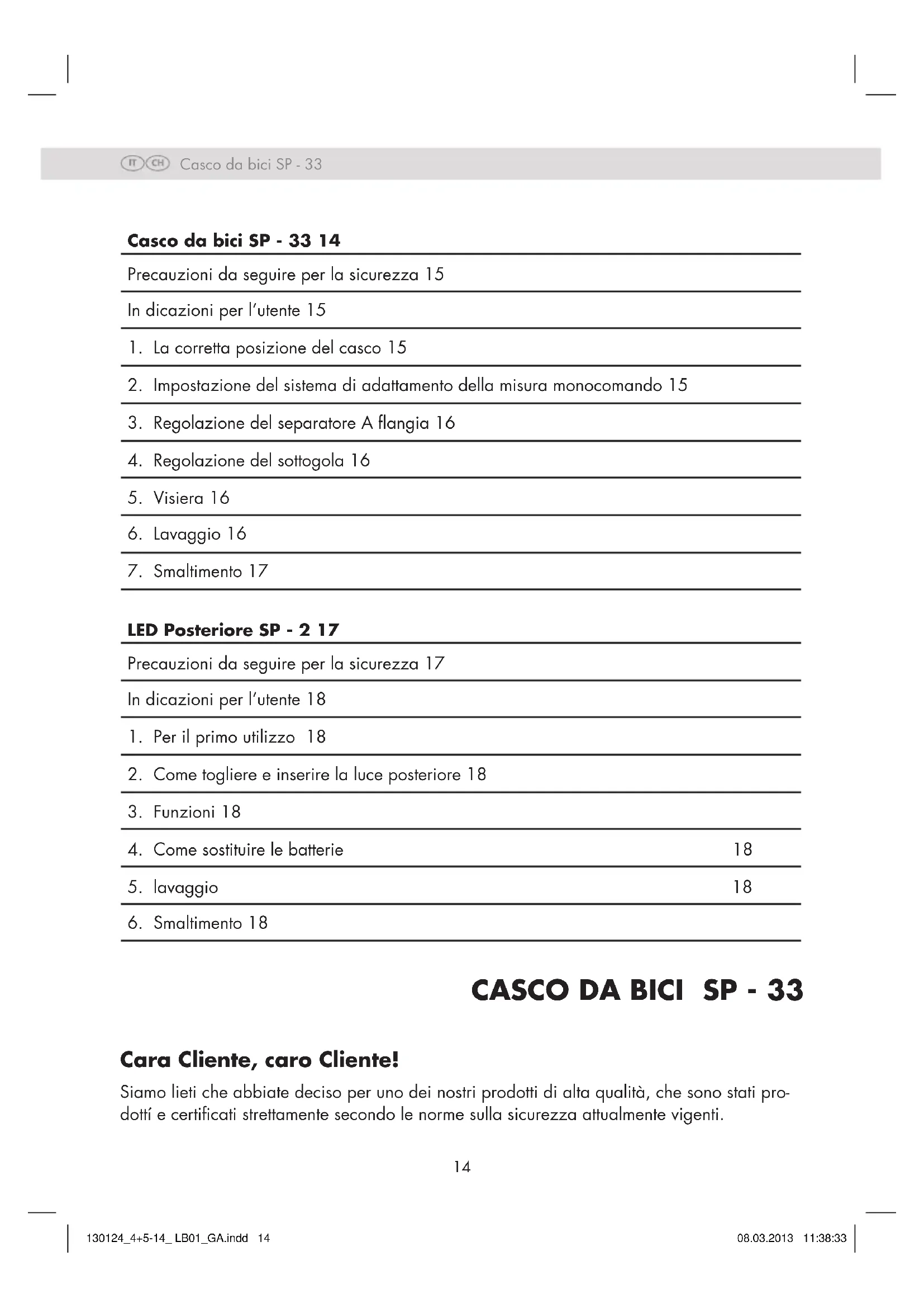 Cara Cliente, caro Cliente! Siamo lieti che abbiate deciso per uno dei nostri prodotti di alta qualità, che sono stati pro- dottí e certicati strettamente secondo le norme sulla sicurezza attualmente vigenti. Casco da bici SP - 33 Casco da bici SP - 33 14 Precauzioni da seguire per la sicurezza 15 In dicazioni per l‘utente 15