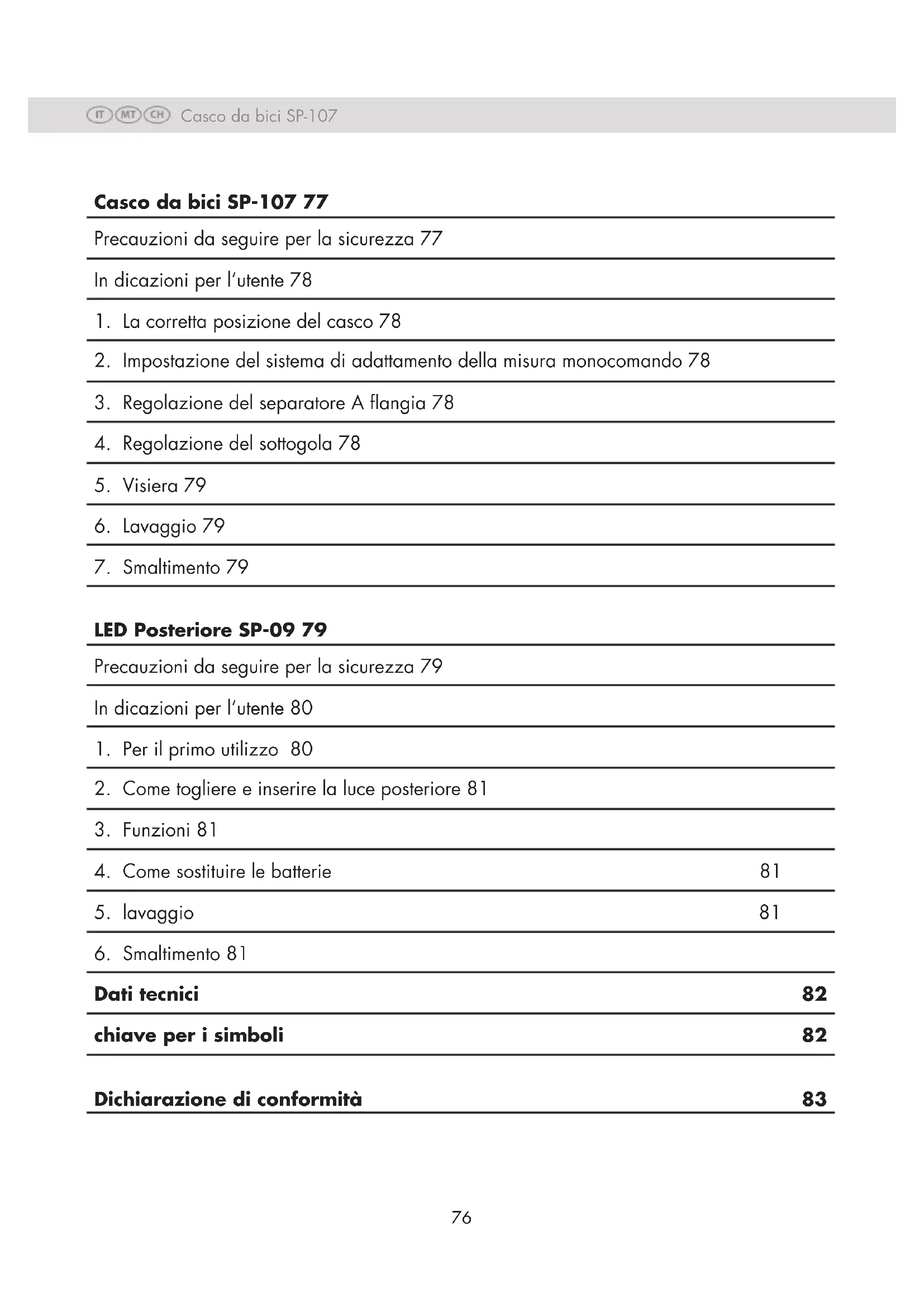 Dati tecnici 82 chiave per i simboli 82 Dichiarazione di conformità 83 Casco da bici SP-10777 Casco da bici SP-107
