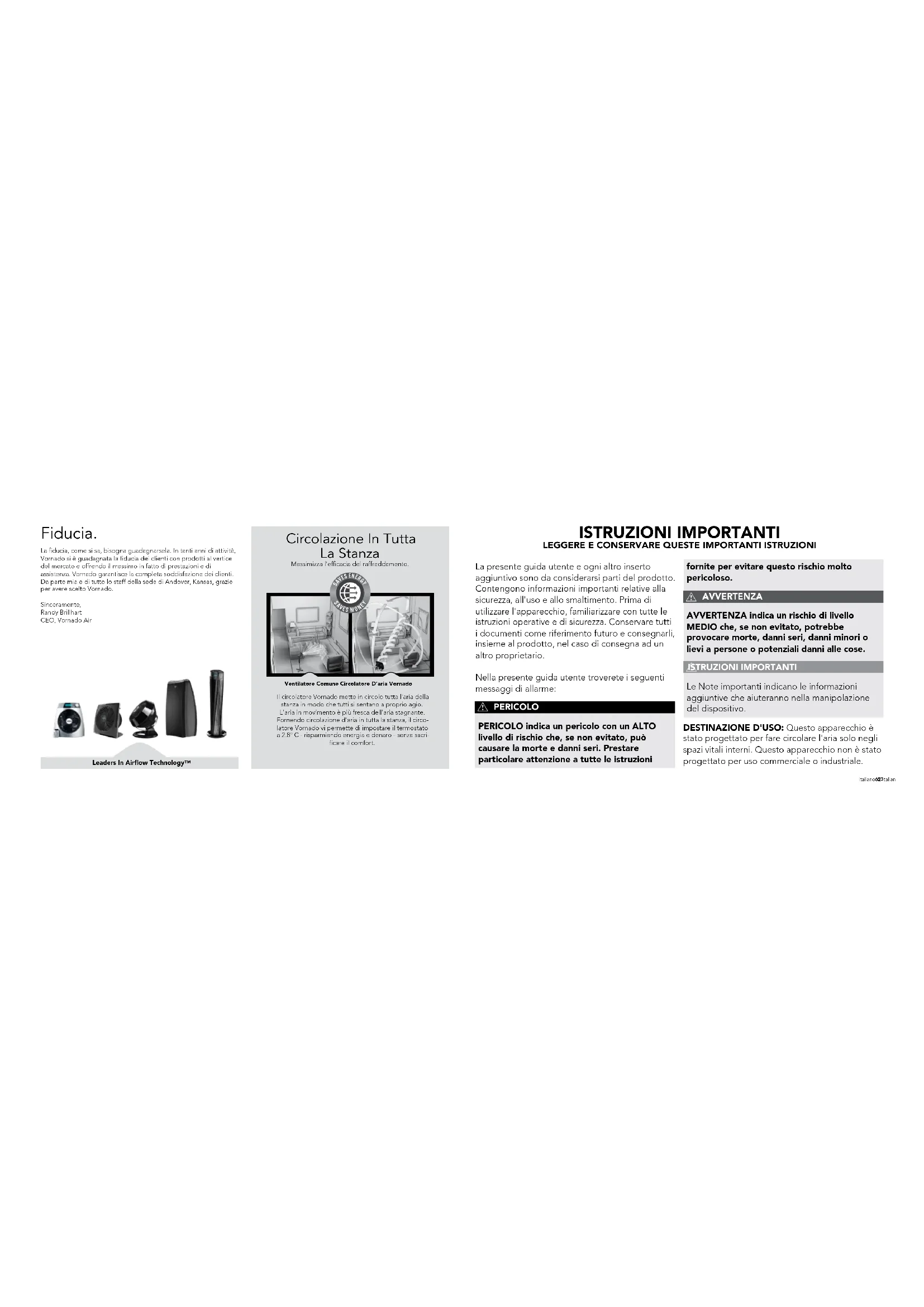 La presente guida utente e ogni altro inserto aggiuntivo sono da considerarsi parti del prodotto. Contengono informazioni importanti relative alla sicurezza, all'uso e allo smaltimento. Prima di utilizzare l'apparecchio, familiarizzare con tutte le istruzioni operative e di sicurezza. Conservare tutti i documenti come riferimento futuro e consegnarli, insieme al prodotto, nel caso di consegna ad un altro proprietario. Nella presente guida utente troverete i seguenti messaggi di allarme: PERICOLO PERICOLO indica un pericolo con un ALTO livello di rischio che, se non evitato, può causare la morte e danni seri. Prestare particolare attenzione a tutte le istruzioni fornite per evitare questo rischio molto pericoloso. AVVERTENZA AVVERTENZA indica un rischio di livello MEDIO che, se non evitato, potrebbe provocare morte, danni seri, danni minori o lievi a persone o potenziali danni alle cose. ISTRUZIONI IMPORTANTI Le Note importanti indicano le informazioni aggiuntive che aiuteranno nella manipolazione del dispositivo. DESTINAZIONE D'USO: Questo apparecchio è stato progettato per fare circolare l'aria solo negli spazi vitali interni. Questo apparecchio non è stato progettato per uso commerciale o industriale.65 Italiano64 Italiano Il produttore non si assume alcuna responsabilità per danni causati dal mancato rispetto delle istruzioni o da un uso improprio dell'apparecchio. Una qualsiasi di tali azioni invaliderà la garanzia del prodotto. AVVERTENZA - Durante l'utilizzo di apparecchi elettrici, devono essere seguite delle precauzioni di base per ridurre il rischio di incendio, scossa elettrica e danni alle persone, incluso quanto segue: AVVERTENZA Rischio da uso e manipolazione non intenzionali. Prestare attenzione a queste linee guida per evitare rischi a persone o cose. Non utilizzare questo apparecchio all'esterno o esposto direttamente alle diverse condizioni atmosferiche. Non utilizzare questo dispositivo in climi tropicali umidi. Se l'apparecchio passa da una zona fredda ad una zona calda (es. durante il trasporto), è possibile che si formi della condensa all'interno dell'unità. Lasciare che il dispositivo raggiunga la temperatura ambiente, prima di utilizzarlo. Non utilizzare l'apparecchio su superfici bagnate. Non utilizzare l'apparecchio in una vasca da bagno, una doccia o in una zona dove possa cadere in una vasca da bagno, una lavanderia, una piscina o in altro contenitore di acqua. Non immergere l'apparecchio in acqua e non permettere che l'acqua goccioli nell'alloggiamento del motore. Non utilizzare nei pressi di forni, camini, stufe o altre fonti di calore ad alta temperatura. Non posizionare l'apparecchio troppo vicino ISTRUZIONI IMPORTANTI
