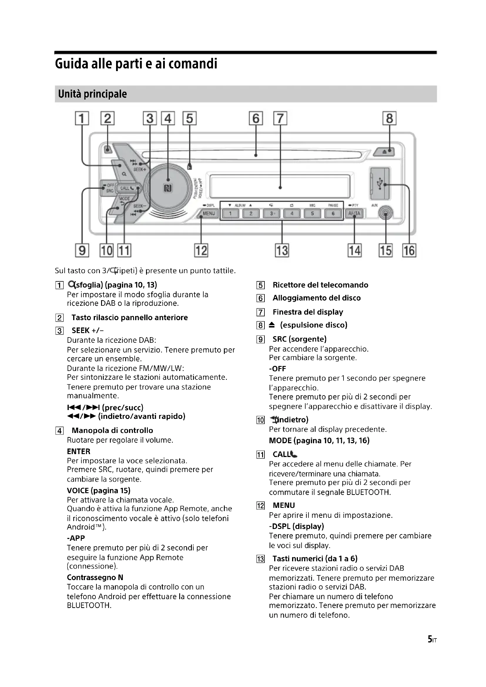 - Guida alla soluzione dei problemi IT Guida alle parti e ai comandi Sul tasto con 3/ (ripeti) è presente un punto tattile. (sfoglia) (pagina 10, 13) Per impostare il modo sfoglia durante la ricezione DAB o la riproduzione. Tasto rilascio pannello anteriore SEEK +/– Durante la ricezione DAB: Per selezionare un servizio. Tenere premuto per cercare un ensemble. Durante la ricezione FM/MW/LW: Per sintonizzare le stazioni automaticamente. Tenere premuto per trovare una stazione manualmente. / (prec/succ) / (indietro/avanti rapido) Manopola di controllo Ruotare per regolare il volume. ENTER Per impostare la voce selezionata. Premere SRC, ruotare, quindi premere per cambiare la sorgente. VOICE (pagina 15) Per attivare la chiamata vocale. Quando è attiva la funzione App Remote, anche il riconoscimento vocale è attivo (solo telefoni Android™). -APP Tenere premuto per più di 2 secondi per eseguire la funzione App Remote (connessione). Contrassegno N Toccare la manopola di controllo con un telefono Android per effettuare la connessione BLUETOOTH. Ricettore del telecomando Alloggiamento del disco Finestra del display (espulsione disco) SRC (sorgente) Per accendere l’apparecchio. Per cambiare la sorgente. -OFF Tenere premuto per 1 secondo per spegnere l’apparecchio. Tenere premuto per più di 2 secondi per spegnere l’apparecchio e disattivare il display. (indietro) Per tornare al display precedente. MODE (pagina 10, 11, 13, 16) CALL Per accedere al menu delle chiamate. Per ricevere/terminare una chiamata. Tenere premuto per più di 2 secondi per commutare il segnale BLUETOOTH. MENU Per aprire il menu di impostazione. -DSPL (display) Tenere premuto, quindi premere per cambiare le voci sul display. Tasti numerici (da 1 a 6) Per ricevere stazioni radio o servizi DAB memorizzati. Tenere premuto per memorizzare stazioni radio o servizi DAB. Per chiamare un numero di telefono memorizzato. Tenere premuto per memorizzare un numero di telefono. Unità principale6IT ALBUM /Per saltare un album per un apparecchio audio. Tenere premuto per saltare gli album in modo continuo. (ripeti) (ordine casuale)MIC (pagina 16)PAUSE AF (frequenze alternative)/TA (notiziari sul traffico)Per impostare i modi AF e TA.-PTY (tipo di programma)Tenere premuto per selezionare PTY nel modo RDS o DAB. Presa di ingresso AUX Porta USB Rimozione del pannello anteriore Per evitare il furto dell’apparecchio, è possibile rimuoverne il pannello anteriore. 1 Tenere premuto OFF . L’apparecchio si spegne. 2 Premere il tasto rilascio pannello anteriore , quindi estrarre il pannello tirandolo verso di sé. Segnale di avvertimentoSe la chiave di accensione viene impostata sulla posizione OFF senza che il pannello anteriore sia stato rimosso, viene emesso per alcuni secondi un segnale acustico di avvertimento. Tale segnale viene emesso solo se è in uso l’amplificatore incorporato.Numeri di serieControllare che i numeri di serie posizionati sul fondo dell’apparecchio e sul retro del pannello anteriore corrispondano correttamente. In caso contrario, non sarà possibile effettuare l’associazione BLUETOOTH, né la connessione e la disconnessione NFC. Operazioni preliminari Installazione del pannello anteriore7IT Impostazione dell’orologio 1 Premere MENU, ruotare la manopola di controllo per selezionare [GENERAL], quindi premere la manopola. 2 Ruotare la manopola di controllo per selezionare [CLOCK-ADJ], quindi premere la manopola. L’indicazione dell’ora lampeggia. 3 Ruotare la manopola di controllo per impostare l’ora e i minuti. Per passare da una cifra all’altra dell’indicazione digitale, premere SEEK +/–. 4 Dopo aver impostato i minuti, premere MENU. L’impostazione è completata e l’orologio viene attivato.Per visualizzare l’orologio, premere DSPL. Preparazione di un dispositivo BLUETOOTH È possibile ascoltare musica o effettuare chiamate in vivavoce collegandosi a un dispositivo BLUETOOTH appropriato. Per ulteriori informazioni sulla connessione, consultare le istruzioni per l’uso in dotazione con il dispositivo.Prima di collegare il dispositivo, abbassare il volume dell’apparecchio; in caso contrario, potrebbe verificarsi un aumento improvviso del volume.Quando si stabilisce per la prima volta la connessione a un dispositivo BLUETOOTH (telefono cellulare, dispositivo audio ecc.), è necessario che l’apparecchio e il dispositivo si registrino reciprocamente (la procedura è definita “associazione”). L’associazione consente a questo apparecchio e ad altri dispositivi di riconoscersi reciprocamente. 1 Posizionare il dispositivo BLUETOOTH a distanza massima di 1 m da questo apparecchio. 2 Premere CALL ruotare la manopola di controllo per selezionare [PAIRING], quindi premere la manopola. lampeggia.L’apparecchio entra nel modo standby per l’associazione. 3 Eseguire l’associazione sul dispositivo BLUETOOTH in modo tale che quest’ultimo rilevi l’apparecchio. 4 Selezionare [Sony Car Audio] visualizzato sul display del dispositivo BLUETOOTH. Se [Sony Car Audio] non viene visualizzato sul display, ripetere la procedura dal punto 2. 5 Se è richiesto l’inserimento di un codice di protezione* sul dispositivo BLUETOOTH, digitare [0000]. p. 255