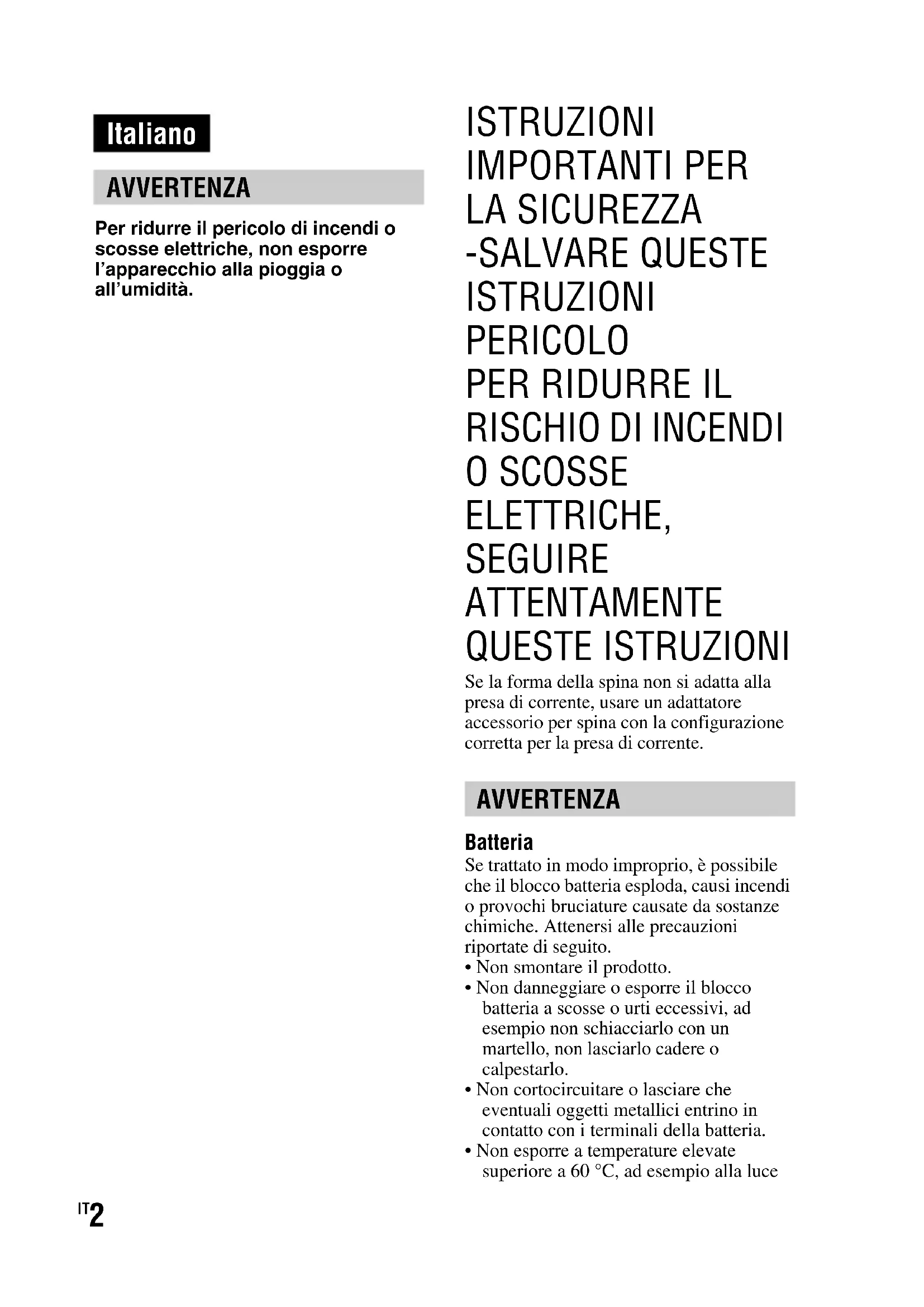 O SCOSSE ELETTRICHE, SEGUIRE ATTENTAMENTE QUESTE ISTRUZIONI Se la forma della spina non si adatta alla presa di corrente, usare un adattatore accessorio per spina con la configurazione corretta per la presa di corrente. Batteria Se trattato in modo improprio, è possibile che il blocco batteria esploda, causi incendi o provochi bruciature causate da sostanze chimiche. Attenersi alle precauzioni riportate di seguito.• Non smontare il prodotto.• Non danneggiare o esporre il blocco batteria a scosse o urti eccessivi, ad esempio non schiacciarlo con un martello, non lasciarlo cadere o calpestarlo.• Non cortocircuitare o lasciare che eventuali oggetti metallici entrino in contatto con i terminali della batteria.• Non esporre a temperature elevate superiore a 60 °C, ad esempio alla luce Italiano AVVERTENZA AVVERTENZA3