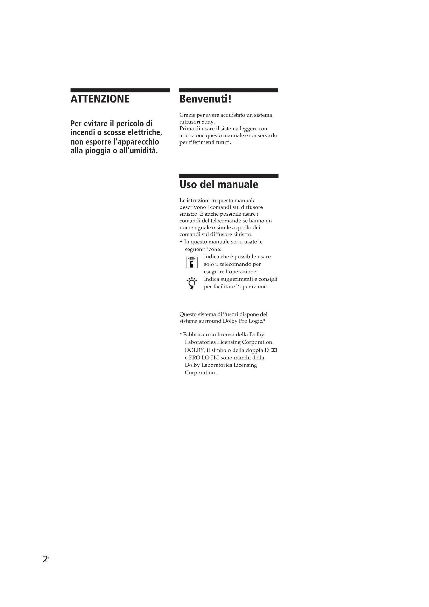 - In questo manuale sono usate le seguenti icone: Indica che è possibile usare solo il telecomando per eseguire l’operazione. Indica suggerimenti e consigli per facilitare l’operazione. Questo sistema diffusori dispone del sistema surround Dolby Pro Logic.*
