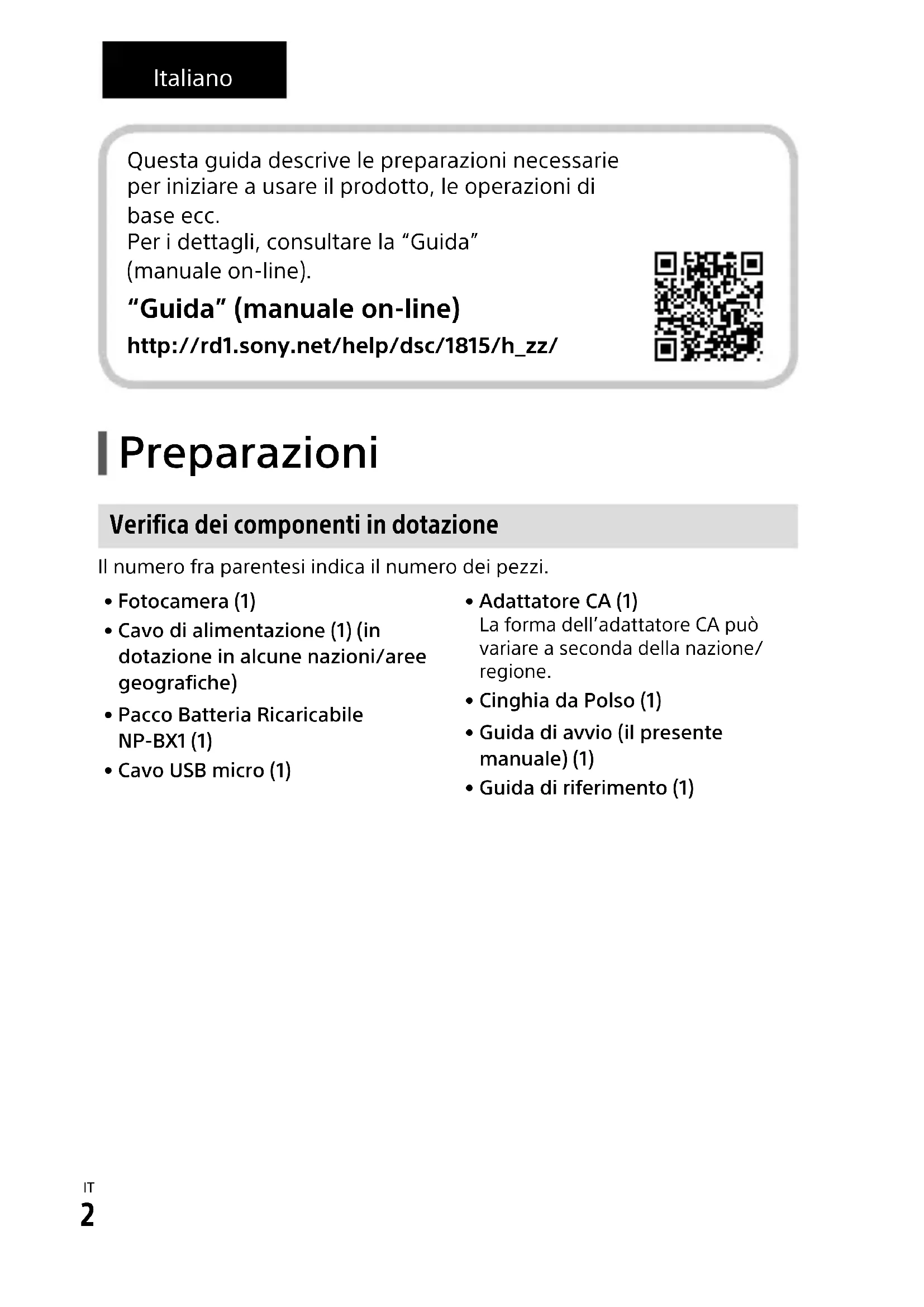 \\Win-473\camera\CX64400(ZLC)\Multi\06_Compose\4746011311_15lang\4746011311DSCHX99CE3\04IT-DSCHX99CE3\04IT.indd DTP data saved: 2018/08/14 13:57 PDF file created: 2018/08/30 10:25 Italiano Preparazioni Verifica dei componenti in dotazione Il numero fra parentesi indica il numero dei pezzi.• Fotocamera (1)• Cavo di alimentazione (1) (in dotazione in alcune nazioni/aree geografiche)• Pacco Batteria Ricaricabile NP-BX1 (1)• Cavo USB micro (1)• Adattatore CA (1)La forma dell’adattatore CA può variare a seconda della nazione/regione.• Cinghia da Polso (1)• Guida di avvio (il presente manuale) (1)• Guida di riferimento (1) Questa guida descrive le preparazioni necessarie per iniziare a usare il prodotto, le operazioni di base ecc. Per i dettagli, consultare la “Guida” (manuale on-line). “Guida” (manuale on-line) http://rd1.sony.net/help/dsc/1815/h_zz/DSC-HX99/DSC-HX95/DSC-WX800/DSC-WX700 4-746-011-31(1)