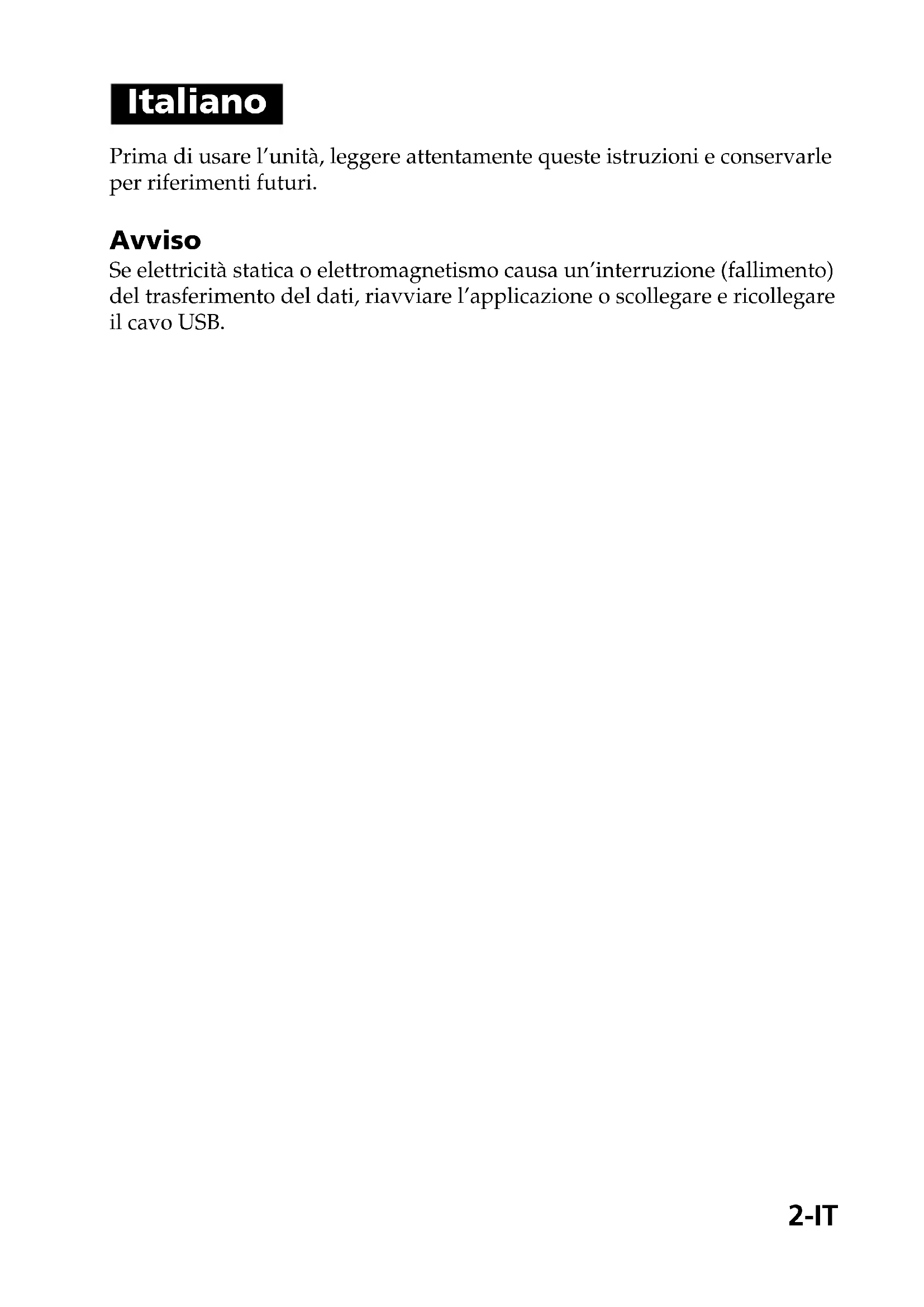 - Creare sempre copie di riserva dei dati importanti. Sony non si assume alcuna responsabilità per danni ai dati. Non ci assumiamo alcuna responsabilità nel caso in cui i dati siano perduti o danneggiati o l’unità sia danneggiata durante l’uso di questa unità.