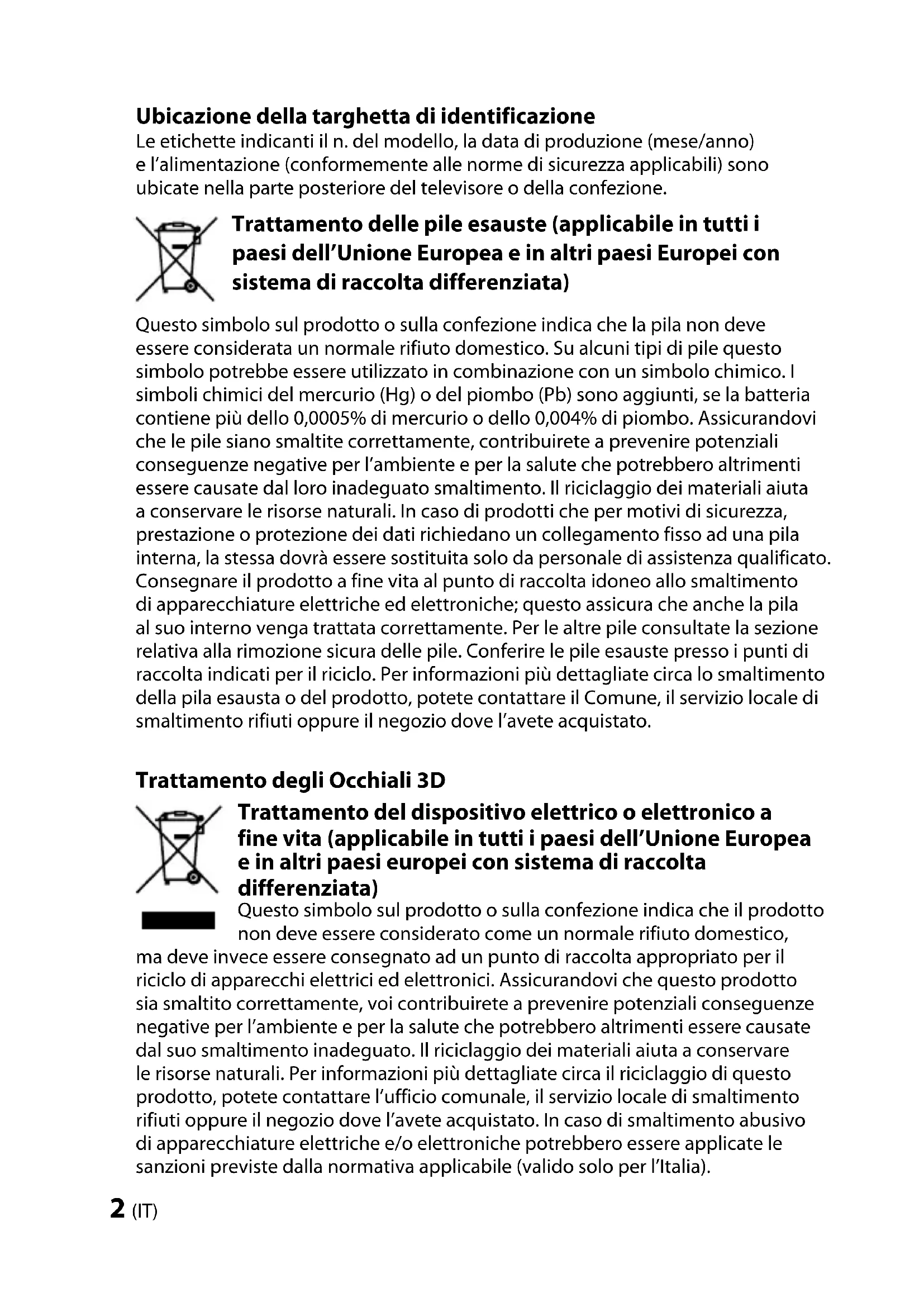2 (IT) TDG-BR750 4-417-747-22(1) TDG-BR750 4-417-747-22(1) Ubicazione della targhetta di identificazione Le etichette indicanti il n. del modello, la data di produzione (mese/anno) e l’alimentazione (conformemente alle norme di sicurezza applicabili) sono ubicate nella parte posteriore del televisore o della confezione. Trattamento delle pile esauste (applicabile in tutti i paesi dell’Unione Europea e in altri paesi Europei con sistema di raccolta differenziata) Questo simbolo sul prodotto o sulla confezione indica che la pila non deve essere considerata un normale rifiuto domestico. Su alcuni tipi di pile questo simbolo potrebbe essere utilizzato in combinazione con un simbolo chimico. I simboli chimici del mercurio (Hg) o del piombo (Pb) sono aggiunti, se la batteria contiene più dello 0,0005% di mercurio o dello 0,004% di piombo. Assicurandovi che le pile siano smaltite correttamente, contribuirete a prevenire potenziali conseguenze negative per l’ambiente e per la salute che potrebbero altrimenti essere causate dal loro inadeguato smaltimento. Il riciclaggio dei materiali aiuta a conservare le risorse naturali. In caso di prodotti che per motivi di sicurezza, prestazione o protezione dei dati richiedano un collegamento fisso ad una pila interna, la stessa dovrà essere sostituita solo da personale di assistenza qualificato. Consegnare il prodotto a fine vita al punto di raccolta idoneo allo smaltimento di apparecchiature elettriche ed elettroniche; questo assicura che anche la pila al suo interno venga trattata correttamente. Per le altre pile consultate la sezione relativa alla rimozione sicura delle pile. Conferire le pile esauste presso i punti di raccolta indicati per il riciclo. Per informazioni più dettagliate circa lo smaltimento della pila esausta o del prodotto, potete contattare il Comune, il servizio locale di smaltimento rifiuti oppure il negozio dove l’avete acquistato. Trattamento degli Occhiali 3D Trattamento del dispositivo elettrico o elettronico a fine vita (applicabile in tutti i paesi dell’Unione Europea e in altri paesi europei con sistema di raccolta differenziata) Questo simbolo sul prodotto o sulla confezione indica che il prodotto non deve essere considerato come un normale rifiuto domestico, ma deve invece essere consegnato ad un punto di raccolta appropriato per il riciclo di apparecchi elettrici ed elettronici. Assicurandovi che questo prodotto sia smaltito correttamente, voi contribuirete a prevenire potenziali conseguenze negative per l’ambiente e per la salute che potrebbero altrimenti essere causate dal suo smaltimento inadeguato. Il riciclaggio dei materiali aiuta a conservare le risorse naturali. Per informazioni più dettagliate circa il riciclaggio di questo prodotto, potete contattare l’ufficio comunale, il servizio locale di smaltimento rifiuti oppure il negozio dove l’avete acquistato. In caso di smaltimento abusivo di apparecchiature elettriche e/o elettroniche potrebbero essere applicate le sanzioni previste dalla normativa applicabile (valido solo per l’Italia).TDG-BR750 4-417-747-22(1) 3 (IT) TDG-BR750 4-417-747-22(1) Il fabbricante di questo prodotto è Sony Corporation, 1-7-1 Konan Minato-ku Tokyo, 108-0075, Giappone. Il rappresentante autorizzato ai fini della Compatibilità Elettromagnetica e della sicurezza del prodotto è Sony Deutschland GmbH, Hedelfinger Strasse 61, 70327, Stoccarda Germania. Per qualsiasi problema relativo all’assistenza o alla garanzia, si prega di fare riferimento agli indirizzi indicati nei documenti di assistenza e garanzia forniti con il prodotto. Attenzione Leggere le presenti istruzioni per la sicurezza per garantire la sicurezza delle persone ed evitare danni ai beni. Avviso Non gettare gli Occhiali 3D nel fuoco. Non smontare gli Occhiali 3D. Non utilizzare, caricare, conservare o lasciare gli Occhiali 3D vicino al fuoco o in luoghi con temperature elevate, per es. alla luce diretta del sole o all’interno di auto esposte ai raggi solari. Usare solo il cavo USB in dotazione. Caricare gli Occhiali 3D esclusivamente con un televisore 3D Sony o con un alimentatore CA per carica USB consigliato. Per ulteriori informazioni sui dispositivi Sony compatibili la tecnologia 3D, consultare le istruzioni per l’uso in dotazione con il dispositivo. Evitare l’ingresso di acqua e sostanze estranee negli Occhiali 3D. Precauzioni per l’uso Gli Occhiali 3D ricevono segnali infrarossi dal Trasmettitore Sincronizzato 3D. Possono verificarsi malfunzionamenti se: Gli Occhiali 3D non sono posizionati frontalmente rispetto al Trasmettitore Sincronizzato 3D Degli oggetti si interpongono tra gli Occhiali 3D e il Trasmettitore Sincronizzato 3D Se nelle vicinanze sono presenti altri dispositivi di comunicazione a infrarossi o apparecchi per l’illuminazione, apparecchi per il riscaldamento residenziale, ecc., questi potrebbero influenzare le prestazioni degli occhiali 3D. Posizionarsi davanti al televisore in linea retta indossando gli Occhiali 3D. L’effetto 3D può risultare inadeguato e i colori dello schermo possono essere falsati se ci si trova sdraiati o con la testa inclinata. Precauzioni per la sicurezza Il prodotto deve essere utilizzato esclusivamente per la visione di immagini video 3D su un televisore Sony compatibile.