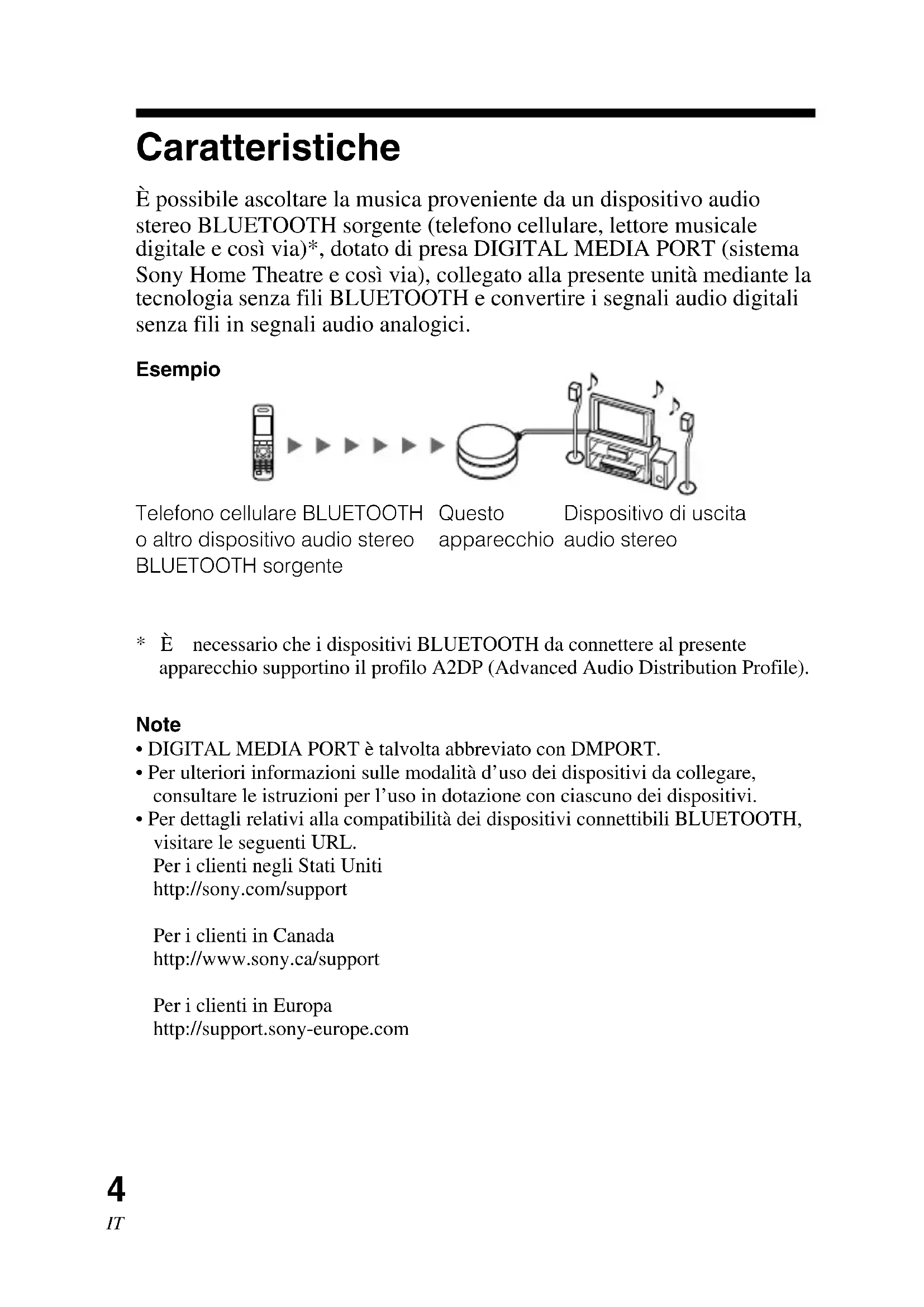 - Per dettagli relativi alla compatibilità dei dispositivi connettibili BLUETOOTH, visitare le seguenti URL. Per i clienti negli Stati Uniti http://sony.com/support Per i clienti in Canada http://www.sony.ca/support Per i clienti in Europa http://support.sony-europe.com Questo apparecchio Dispositivo di uscita audio stereo Telefono cellulare BLUETOOTH o altro dispositivo audio stereo BLUETOOTH sorgente EsempioTDM-BT1 [IT] 3-095-404-11(1)