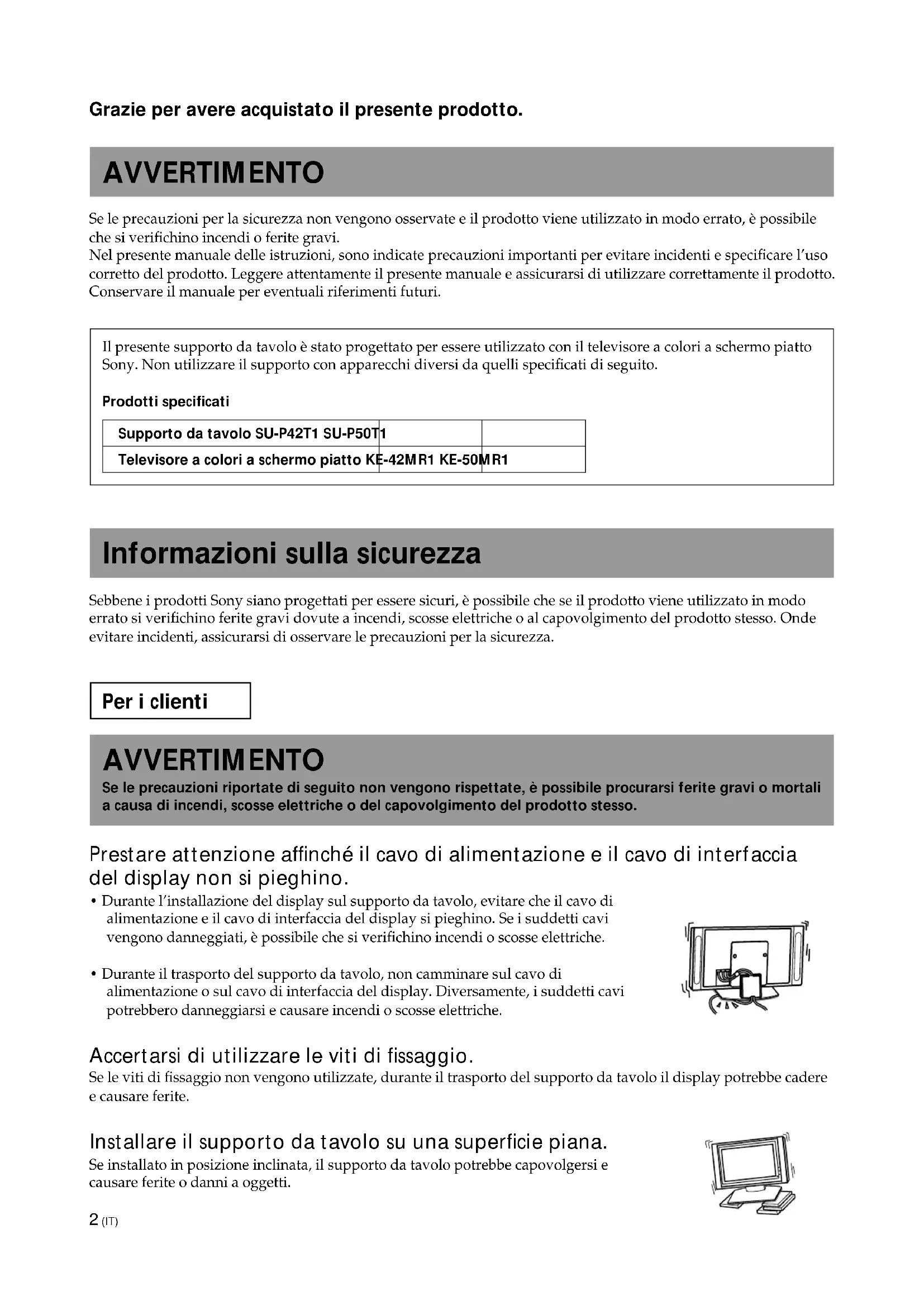 - Durante il trasporto del supporto da tavolo, non camminare sul cavo di alimentazione o sul cavo di interfaccia del display. Diversamente, i suddetti cavi potrebbero danneggiarsi e causare incendi o scosse elettriche. Accertarsi di utilizzare le viti di fissaggio. Se le viti di fissaggio non vengono utilizzate, durante il trasporto del supporto da tavolo il display potrebbe cadere e causare ferite. Installare il supporto da tavolo su una superficie piana. Se installato in posizione inclinata, il supporto da tavolo potrebbe capovolgersi e causare ferite o danni a oggetti.3 (IT) Installare il supporto da tavolo su una superficie stabile. Se il supporto da tavolo viene installato su una superficie instabile potrebbeperdere l’equilibrio e capovolgersi o cadere, causando ferite o danni a oggetti. Assicurarsi di prendere le dovute precauzioni in modo che il supporto non si capovolga. Diversamente, è possibile che, ad esempio durante un terremoto, il supporto da tavolo si capovolga causando feriteo danni a oggetti. Fare passare un cavo o un filo attraverso i fori degli attacchi di sicurezza situati nella partesuperiore della staffa principale e fissarne l’altra estremità alla parete per bloccare il supporto da tavolo ed evitareche si capovolga. Non appoggiarsi né aggrapparsi al supporto da tavolo. Il supporto da tavolo potrebbe capovolgersi e causare ferite. Non bloccare i fori di ventilazione del display. Se tali fori vengono bloccati coprendo la parte superiore del supporto da tavolo conun panno o simile, l’apparecchio potrebbe surriscaldarsi e causare incendi. Accertarsi di trasportare il supporto secondo quanto indicato nel presente manuale. Se trasportato in modo non corretto, il supporto da tavolo potrebbe capovolgersi e causare ferite. Prestare attenzione a non inciampare nel cavo di alimentazione o nel cavo di interfaccia del display. Se si inciampa sul cavo di alimentazione o sul cavo di interfaccia del display, il supporto potrebbe capovolgersicausando ferite. Non trasportare il supporto da tavolo con il display installato. Prima di trasportare il supporto da tavolo, rimuovere il display, diversamente, ildisplay potrebbe cadere e causare ferite a persone. ATTENZIONE Se le precauzioni riportate di seguito non vengono rispettate, è possibile procurarsi ferite o che siverifichino danni a oggetti. Non installare sul supporto apparecchi diversi da quelli specificati. Il presente supporto da tavolo è stato progettato per essere utilizzato con il prodotto specificato. Se vengonoutilizzati altri prodotti, questi potrebbero cadere e causare ferite o danni a oggetti. Italiano IT4 (IT) Precauzioni Per mantenere pulito il supporto, di tanto in tanto pulirlo con un panno morbido asciutto. Rimuovere le macchie persistenti con un panno leggermente inumidito con un detersivo per piatti diluito con acqua. Quindi asciugare l’area con un panno morbido asciutto. Non utilizzare sostanze chimiche quali solventi o benzene, onde evitare di danneggiare la finitura del supporto. Montare il supporto da tavolo Per gli installatori Sony Le seguenti istruzioni sono rivolte esclusivamente agli installatori Sony. Assicurarsi di leggere le precauzioni per la sicurezza di cui sopra e di prestare particolare attenzione durante l’installazione, la manutenzione e i controlli del presente prodotto. Assicurarsi che l’installazione venga effettuata da due o più persone. Assicurarsi che l’installazione del display sul supporto da tavolo venga effettuata da due o più persone. Diversamente, è possibile che si verifichino incidenti o si causino ferite. Accertarsi di montare il supporto da tavolo seguendo le istruzioni indicate nel presente manuale. Se le viti sono lenti o non avvitate, il supporto da tavolo potrebbe inclinarsi o capovolgersi oppure il display potrebbe cadere causando ferite o danni a oggetti. Installare saldamente il display seguendo la procedura appropriata. Accertarsi di stringere in modo saldo le viti. Se il display non viene installato in modo corretto, potrebbe cadere e causare ferite. Prestare attenzione a non ferirsi le mani o le dita durante il montaggio del supporto da tavolo. Durante il montaggio del supporto da tavolo o durante l’installazione del display, prestare attenzione a non ferirsi le mani o le dita. Precauzioni relative all’installazione
