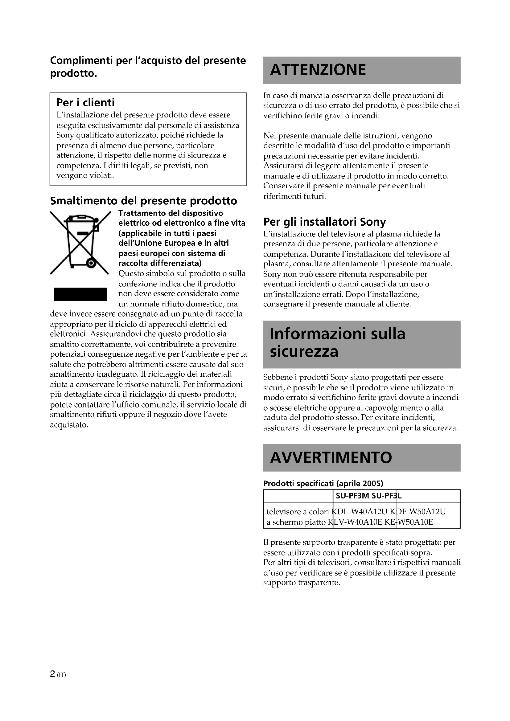 Chaîne ou corde solide (non fourni) Support d’ancrage mural (non fourni)2 (IT) Complimenti per l’acquisto del presente prodotto. Per i clienti L’installazione del presente prodotto deve essere eseguita esclusivamente dal personale di assistenza Sony qualificato autorizzato, poiché richiede la presenza di almeno due persone, particolare attenzione, il rispetto delle norme di sicurezza e competenza. I diritti legali, se previsti, non vengono violati. Smaltimento del presente prodotto Trattamento del dispositivo elettrico od elettronico a fine vita (applicabile in tutti i paesi dell’Unione Europea e in altri paesi europei con sistema di raccolta differenziata) Questo simbolo sul prodotto o sulla confezione indica che il prodotto non deve essere considerato come un normale rifiuto domestico, ma deve invece essere consegnato ad un punto di raccolta appropriato per il riciclo di apparecchi elettrici ed elettronici. Assicurandovi che questo prodotto sia smaltito correttamente, voi contribuirete a prevenire potenziali conseguenze negative per l’ambiente e per la salute che potrebbero altrimenti essere causate dal suo smaltimento inadeguato. Il riciclaggio dei materiali aiuta a conservare le risorse naturali. Per informazioni più dettagliate circa il riciclaggio di questo prodotto, potete contattare l’ufficio comunale, il servizio locale di smaltimento rifiuti oppure il negozio dove l’avete acquistato. ATTENZIONE In caso di mancata osservanza delle precauzioni di sicurezza o di uso errato del prodotto, è possibile che si verifichino ferite gravi o incendi. Nel presente manuale delle istruzioni, vengono descritte le modalità d’uso del prodotto e importanti precauzioni necessarie per evitare incidenti. Assicurarsi di leggere attentamente il presente manuale e di utilizzare il prodotto in modo corretto. Conservare il presente manuale per eventuali riferimenti futuri. Per gli installatori Sony L’installazione del televisore al plasma richiede la presenza di due persone, particolare attenzione e competenza. Durante l’installazione del televisore al plasma, consultare attentamente il presente manuale. Sony non può essere ritenuta responsabile per eventuali incidenti o danni causati da un uso o un’installazione errati. Dopo l’installazione, consegnare il presente manuale al cliente. Informazioni sulla sicurezza Sebbene i prodotti Sony siano progettati per essere sicuri, è possibile che se il prodotto viene utilizzato in modo errato si verifichino ferite gravi dovute a incendi o scosse elettriche oppure al capovolgimento o alla caduta del prodotto stesso. Per evitare incidenti, assicurarsi di osservare le precauzioni per la sicurezza. AVVERTIMENTO Prodotti specificati (aprile 2005) SU-PF3M SU-PF3L televisore a colori KDL-W40A12U KDE-W50A12U a schermo piatto KLV-W40A10E KE-W50A10E Il presente supporto trasparente è stato progettato per essere utilizzato con i prodotti specificati sopra. Per altri tipi di televisori, consultare i rispettivi manuali d’uso per verificare se è possibile utilizzare il presente supporto trasparente.3 (IT) ATTENZIONE Se le precauzioni riportate di seguito nonvengono rispettate, è possibile procurarsi feritegravi o mortali a causa di incendi o scosseelettriche oppure in seguito al capovolgimentoo alla caduta del prodotto. L’installazione del presente prodotto deve essere eseguita esclusivamente da personale di assistenza Sony qualificato. Se l’installazione non viene eseguita da personale Sonyqualificato, è possibile procurarsi ferite gravi in quantoil televisore e il supporto sono estremamente pesanti. Non appoggiarsi né aggrapparsi al supporto. Il supporto potrebbecapovolgersi e causare ferite. Assicurarsi di prendere le dovute precauzioni in modo che il supporto non si capovolga. Diversamente, è possibile che il televisore si capovolgacausando ferite. Fissare saldamente il televisore a unaparete, colonna e simili onde evitare che si capovolga. Assicurarsi di installare il supporto su un pavimento solido e piano. Non installare il supporto in modo che penda da unlato, onde evitare che il supporto stesso si capovolga oche il televisore cada causando ferite.Se il supporto viene installato su una superficiemorbida quale un tappeto, prima appoggiarvi sopra unpannello. Non utilizzare il supporto se danneggiato. Non utilizzare il supportotrasparente se presentaincrinature.Diversamente, è possibile che ilvetro si rompa e che il televisorecada oppure che il supporto sicapovolga causando ferite. Non appoggiarsi né aggrapparsi al televisore quando è installato sul supporto trasparente. Il supporto trasparentepotrebbe capovolgersi oppure iltelevisore potrebbe caderecausando ferite gravi o mortali. Non coprire la presa di ventilazione del televisore. Se la presa di ventilazione vienecoperta, ad esempio con unpanno e simili, il televisorepotrebbe surriscaldarsiprovocando incendi. Evitare che il cavo di alimentazione o il cavo di collegamento rimangano incastrati.
