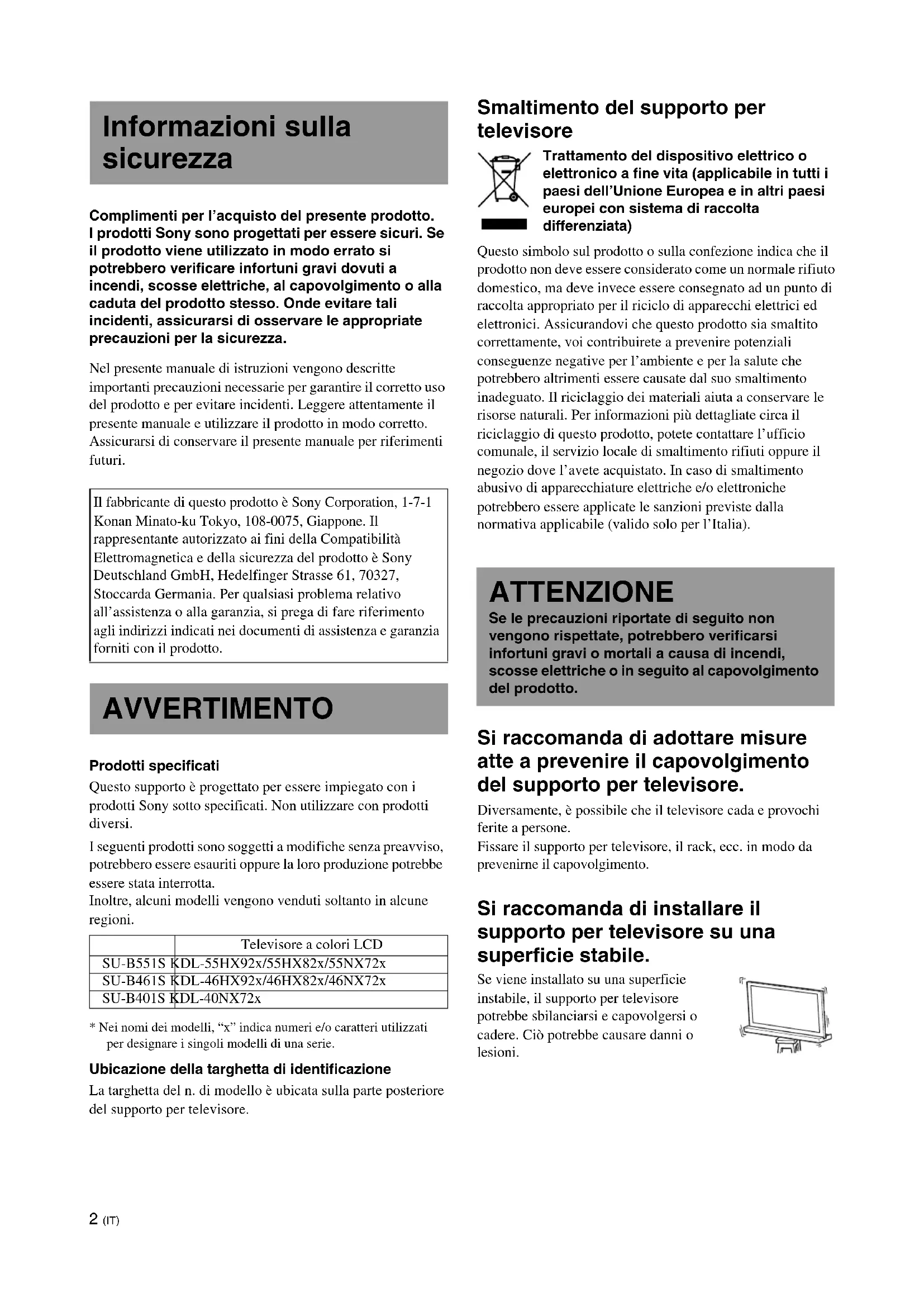 - Nei nomi dei modelli, “x” indica numeri e/o caratteri utilizzati per designare i singoli modelli di una serie. Ubicazione della targhetta di identificazione La targhetta del n. di modello è ubicata sulla parte posteriore del supporto per televisore. Smaltimento del supporto per televisore Trattamento del dispositivo elettrico o elettronico a fine vita (applicabile in tutti i paesi dell’Unione Europea e in altri paesi europei con sistema di raccolta differenziata) Questo simbolo sul prodotto o sulla confezione indica che il prodotto non deve essere considerato come un normale rifiuto domestico, ma deve invece essere consegnato ad un punto di raccolta appropriato per il riciclo di apparecchi elettrici ed elettronici. Assicurandovi che questo prodotto sia smaltito correttamente, voi contribuirete a prevenire potenziali conseguenze negative per l’ambiente e per la salute che potrebbero altrimenti essere causate dal suo smaltimento inadeguato. Il riciclaggio dei materiali aiuta a conservare le risorse naturali. Per informazioni più dettagliate circa il riciclaggio di questo prodotto, potete contattare l’ufficio comunale, il servizio locale di smaltimento rifiuti oppure il negozio dove l’avete acquistato. In caso di smaltimento abusivo di apparecchiature elettriche e/o elettroniche potrebbero essere applicate le sanzioni previste dalla normativa applicabile (valido solo per l’Italia). Si raccomanda di adottare misure atte a prevenire il capovolgimento del supporto per televisore. Diversamente, è possibile che il televisore cada e provochi ferite a persone. Fissare il supporto per televisore, il rack, ecc. in modo da prevenirne il capovolgimento. Si raccomanda di installare il supporto per televisore su una superficie stabile. Se viene installato su una superficie instabile, il supporto per televisore potrebbe sbilanciarsi e capovolgersi o cadere. Ciò potrebbe causare danni o lesioni. Informazioni sulla sicurezza Il fabbricante di questo prodotto è Sony Corporation, 1-7-1 Konan Minato-ku Tokyo, 108-0075, Giappone. Il rappresentante autorizzato ai fini della Compatibilità Elettromagnetica e della sicurezza del prodotto è Sony Deutschland GmbH, Hedelfinger Strasse 61, 70327, Stoccarda Germania. Per qualsiasi problema relativo all’assistenza o alla garanzia, si prega di fare riferimento agli indirizzi indicati nei documenti di assistenza e garanzia forniti con il prodotto. AVVERTIMENTO Televisore a colori LCD SU-B551S KDL-55HX92x/55HX82x/55NX72x SU-B461S KDL-46HX92x/46HX82x/46NX72x SU-B401S KDL-40NX72x ATTENZIONE Se le precauzioni riportate di seguito non vengono rispettate, potrebbero verificarsi infortuni gravi o mortali a causa di incendi, scosse elettriche o in seguito al capovolgimento del prodotto.3 (IT) Non appoggiarsi né aggrapparsi al televisore quando è installato sul supporto per televisore. Il supporto per televisore potrebbe capovolgersi, oppure il televisore potrebbe cadere provocando infortuni gravi o mortali. Non ostruire la presa di ventilazione del televisore. Le prese di ventilazione nel televisore sono necessarie per garantire il funzionamento affidabile del televisore e proteggerlo dal surriscaldamento.