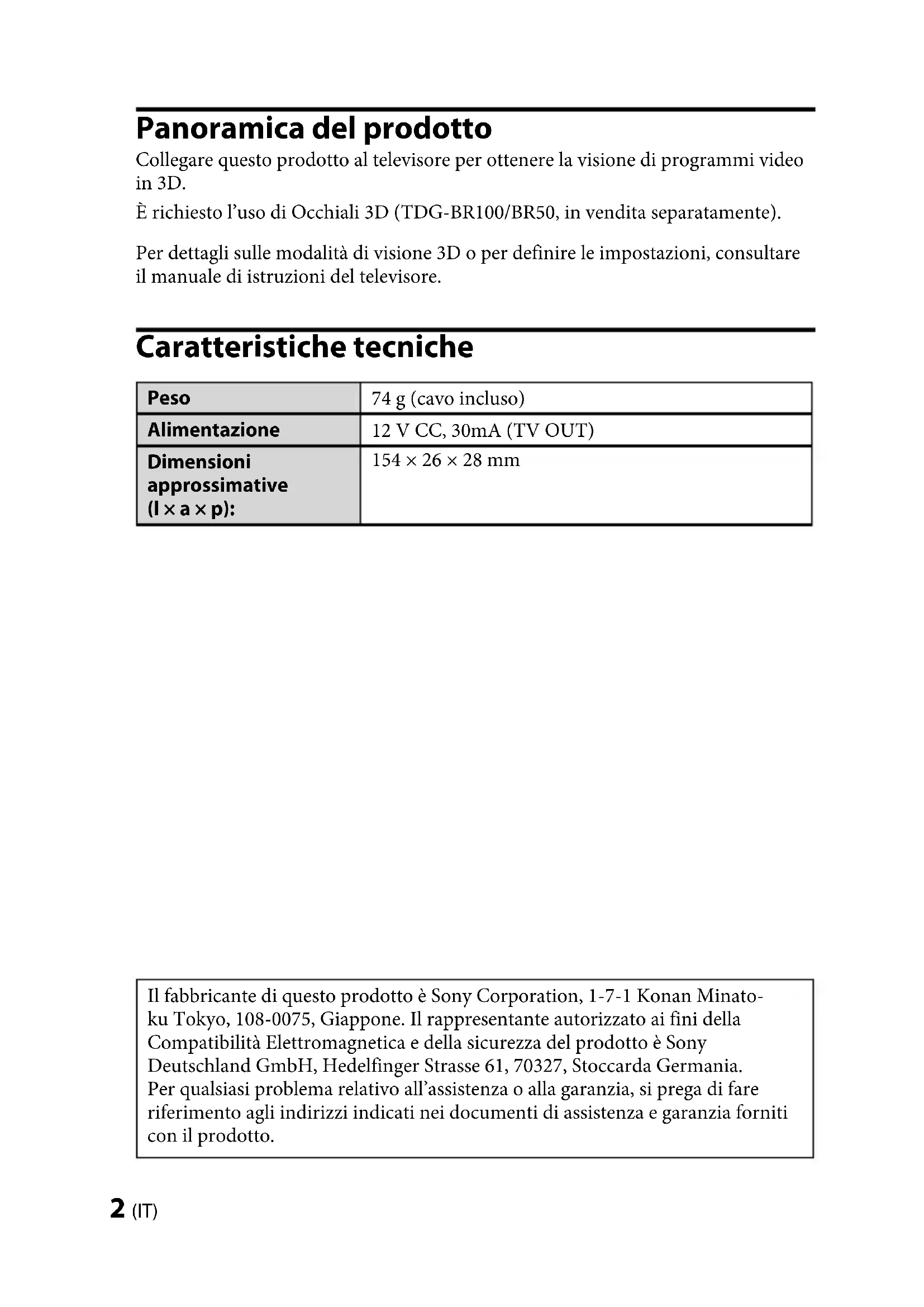 Non posizionare il trasmettitore sincronizzato 3D vicino al sensore del telecomando . (Continua)TMR-BR100 4-180-471-26(1) 6 (IT) TMR-BR100 4-180-471-26(1) 120˚ Se il televisore è appoggiato su un mobile o su un tavolo: Posizionare il trasmettitore sincronizzato 3D nella posizione centrale rispetto al televisore lungo il bordo anteriore del supporto da tavolo o del supporto del televisore. 120˚ Se il televisore è stato montato su una parete, applicare il trasmettitore sincronizzato 3D al televisore (lato centrale superiore o parte inferiore destra del centro), utilizzando del nastro biadesivo. Regolare l’angolo del trasmettitore sincronizzato 3D sulla base dell’installazione. +10˚ –10˚ 120˚ 120˚ 120˚TMR-BR100 4-180-471-26(1) TMR-BR100 4-180-471-26(1) 7 (IT) Intervallo di comunicazione del Trasmettitore Sincronizzato 3D e degli Occhiali 3D Sistemare il trasmettitore sincronizzato 3D di fronte al televisore e accertarsi che non vi siano ostacoli tra il trasmettitore sincronizzato 3D e gli occhiali 3D. 120˚ 1 m ~ 6 m tipico 1 m ~ 6 m tipico 120˚ Vista dall’alto Vista laterale Collegamenti Spegnere il televisore e collegare il trasmettitore sincronizzato 3D al terminale 3D SYNC sul televisore. Accendere il televisore e controllare che le voci del menu 3D vengano visualizzate nell’elenco del menu OPTIONS. Spegnere il televisore una volta per consentire il riconoscimento del Trasmettitore Sincronizzato 3D da parte del televisore. Fare riferimento al manuale di istruzioni del televisore per ulteriori informazioni sulla visione 3D. Risoluzione dei problemi Se si verifica un problema, consultare il manuale di istruzioni del televisore.TMR-BR100 4-180-471-26(1) 2 (SE) TMR-BR100 4-180-471-26(1) Produktöversikt Anslut denna produkt till din TV för att uppleva program i 3D. Du behöver 3D-glasögon (TDG-BR100/BR50, säljs separat). Mer information om hur man spelar upp 3D-video eller gör inställningar finns i TV:ns bruksanvisning. Specifikationer Vikt 74 g (inklusive kabel) Strömförsörjning DC 12V, 30mA (TV OUT) Dimensioner (cirka) (b × h × d) 154 × 26 × 28 mm Tillverkare av denna produkt är Sony Corporation, 1-7-1 Konan Minato- ku Tokyo, 108-0075 Japan. Auktoriserad representant för EMC och produktsäkerhet är Sony Deutschland GmbH, Hedelfinger Strasse 61, 70327 Stuttgart, Germany. För service- och garantiärenden, var vänlig se separat service- och garantidokument.TMR-BR100 4-180-471-26(1) TMR-BR100 4-180-471-26(1) 3 (SE)