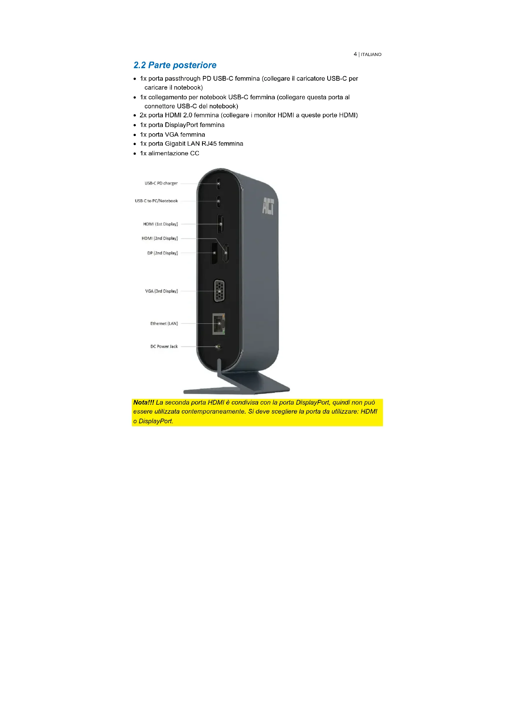 1x porta passthrough PD USB-C femmina (collegare il caricatore USB-C per caricare il notebook) 1x collegamento per notebook USB-C femmina (collegare questa porta al connettore USB-C del notebook) 2x porta HDMI 2.0 femmina (collegare i monitor HDMI a queste porte HDMI) 1x porta DisplayPort femmina 1x porta VGA femmina 1x porta Gigabit LAN RJ45 femmina 1x alimentazione CC