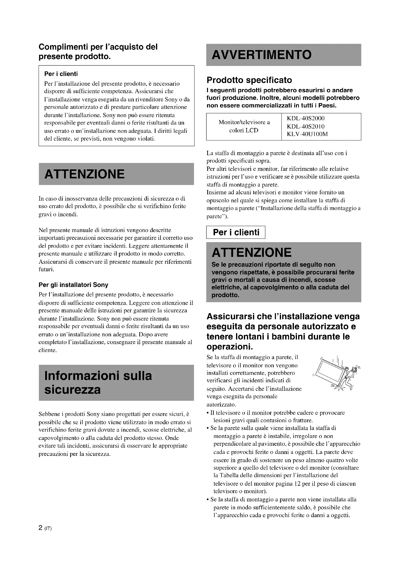 - Se la staffa di montaggio a parete non viene installata alla parete in modo sufficientemente saldo, è possibile che l’apparecchio cada e provochi ferite o danni a oggetti. Per i clienti Per l’installazione del presente prodotto, è necessario disporre di sufficiente competenza. Assicurarsi che l’installazione venga eseguita da un rivenditore Sony o da personale autorizzato e di prestare particolare attenzione durante l’installazione. Sony non può essere ritenuta responsabile per eventuali danni o ferite risultanti da un uso errato o un’installazione non adeguata. I diritti legali del cliente, se previsti, non vengono violati. ATTENZIONE Informazioni sulla sicurezza AVVERTIMENTO Monitor/televisore a colori LCD KDL-40S2000 KDL-40S2010