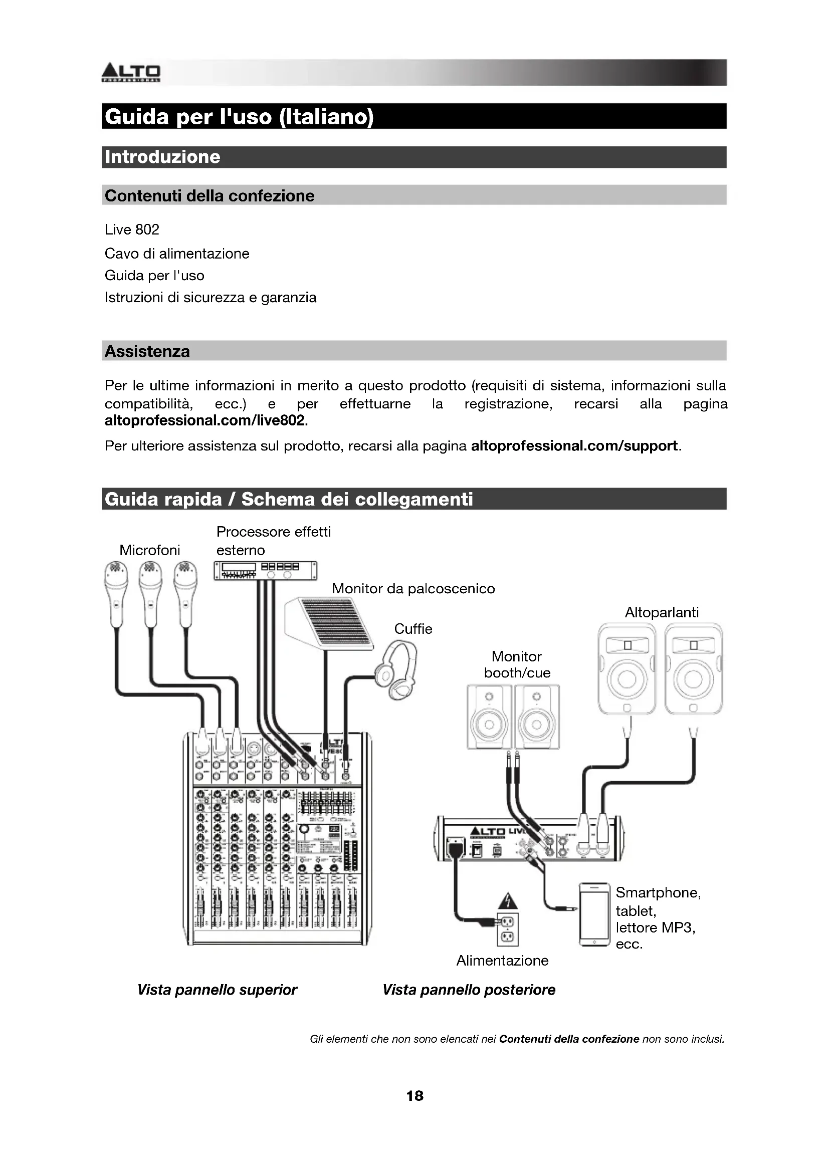 Assistenza Per le ultime informazioni in merito a questo prodotto (requisiti di sistema, informazioni sulla compatibilità, ecc.) e per effettuarne la registrazione, recarsi alla pagina altoprofessional.com/live802. Per ulteriore assistenza sul prodotto, recarsi alla pagina altoprofessional.com/support.