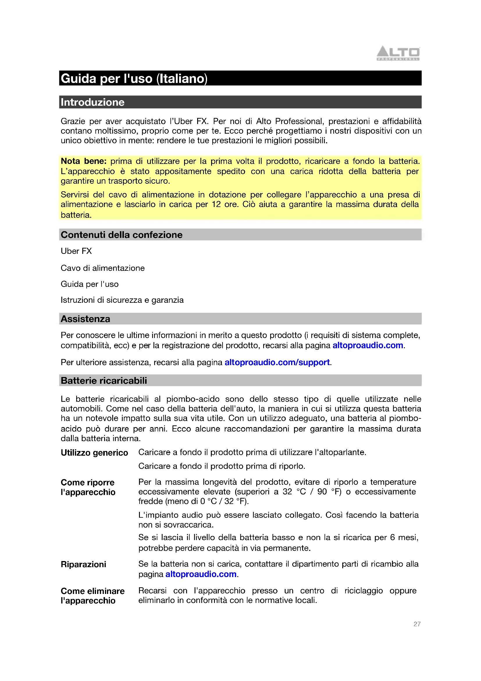 Scarica le istruzioni per il tuo Altoparlante in formato PDF gratuitamente! Trova il tuo manuale Uber FX - ALTO e riprendi in mano il tuo dispositivo elettronico. In questa pagina sono pubblicati tutti i documenti necessari per l'utilizzo del tuo dispositivo. Uber FX del marchio ALTO.