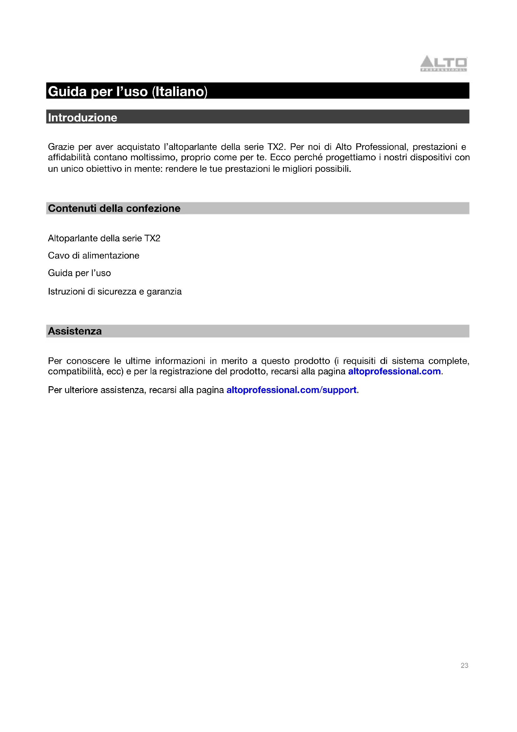 Guida per l’uso (Italiano) Introduzione Grazie per aver acquistato l’altoparlante della serie TX2. Per noi di Alto Professional, prestazioni e affidabilità contano moltissimo, proprio come per te. Ecco perché progettiamo i nostri dispositivi con un unico obiettivo in mente: rendere le tue prestazioni le migliori possibili.