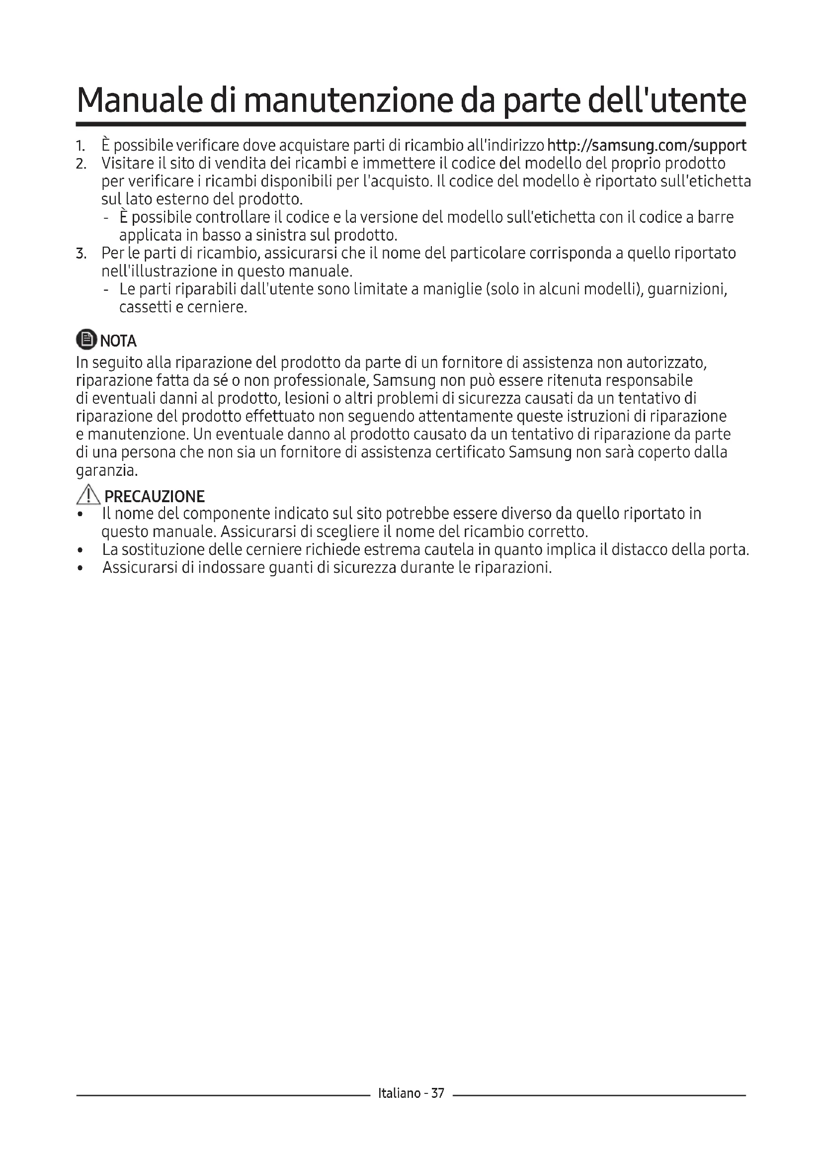 nell'illustrazione in questo manuale. ‐ Le parti riparabili dall'utente sono limitate a maniglie (solo in alcuni modelli), guarnizioni, cassetti e cerniere. NOTA In seguito alla riparazione del prodotto da parte di un fornitore di assistenza non autorizzato, riparazione fatta da sé o non professionale, Samsung non può essere ritenuta responsabile di eventuali danni al prodotto, lesioni o altri problemi di sicurezza causati da un tentativo di riparazione del prodotto effettuato non seguendo attentamente queste istruzioni di riparazione e manutenzione. Un eventuale danno al prodotto causato da un tentativo di riparazione da parte di una persona che non sia un fornitore di assistenza certificato Samsung non sarà coperto dalla garanzia. PRECAUZIONE
