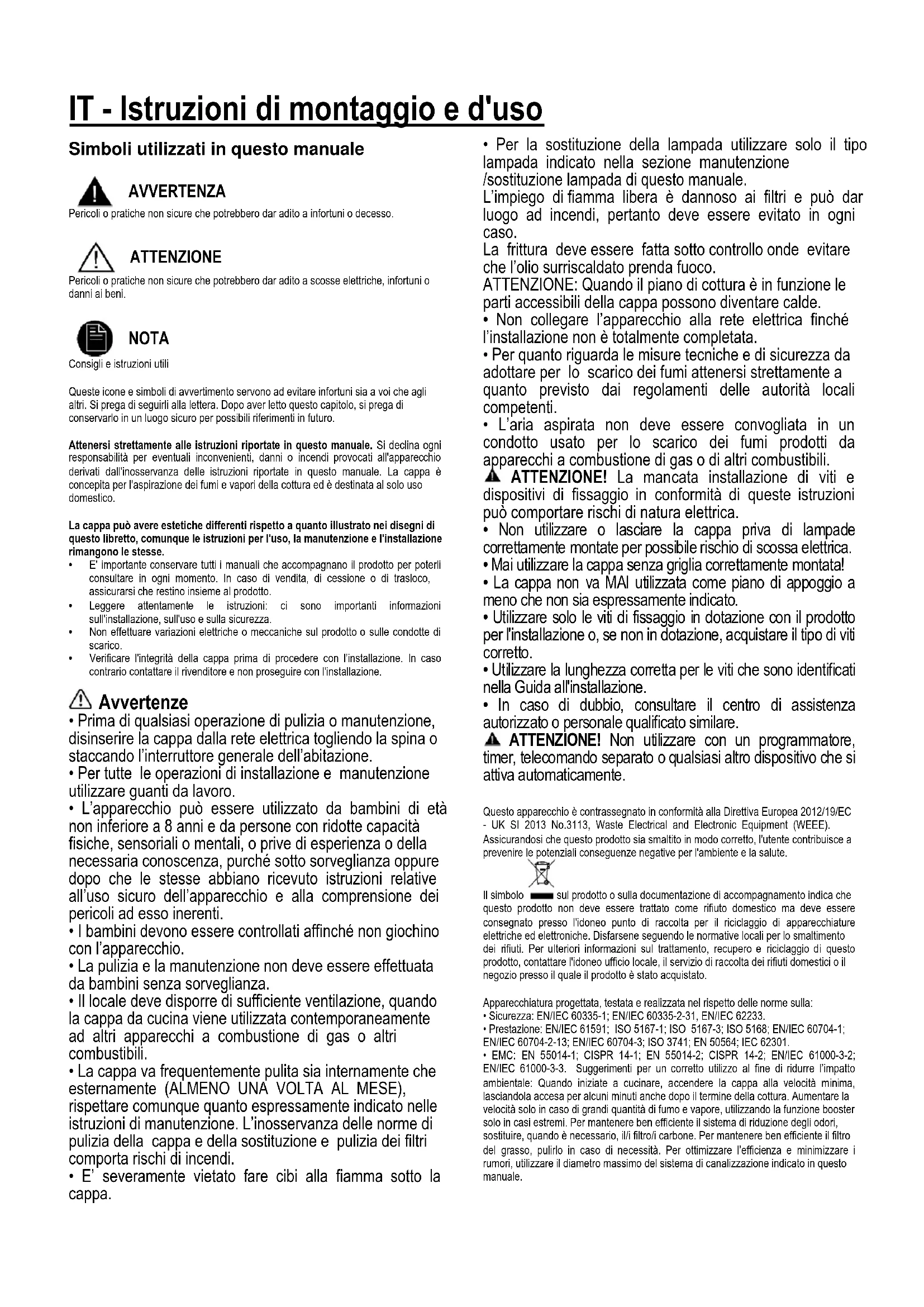 NOTA Consigli e istruzioni utili Queste icone e simboli di avvertimento servono ad evitare infortuni sia a voi che agli altri. Si prega di seguirli alla lettera. Dopo aver letto questo capitolo, si prega di conservarlo in un luogo sicuro per possibili riferimenti in futuro. Attenersi strettamente alle istruzioni riportate in questo manuale. Si declina ogni responsabilità per eventuali inconvenienti, danni o incendi provocati all'apparecchio derivati dall'inosservanza delle istruzioni riportate in questo manuale. La cappa è concepita per l'aspirazione dei fumi e vapori della cottura ed è destinata al solo uso domestico. La cappa può avere estetiche differenti rispetto a quanto illustrato nei disegni di questo libretto, comunque le istruzioni per l'uso, la manutenzione e l'installazione rimangono le stesse.