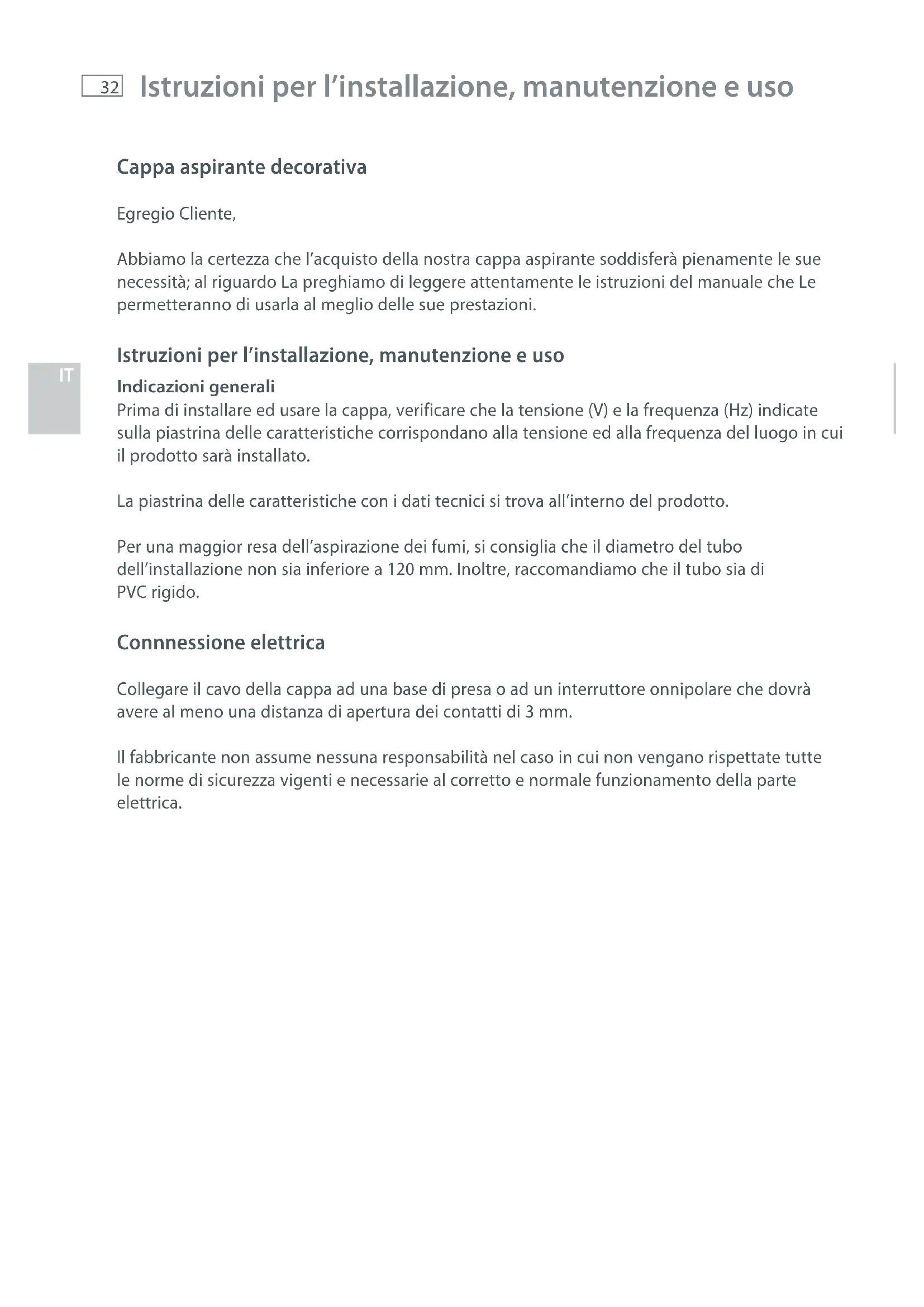 Istruzioni per l’installazione, manutenzione e uso Cappa aspirante decorativa Egregio Cliente, Abbiamo la certezza che l’acquisto della nostra cappa aspirante soddisferà pienamente le sue necessità; al riguardo La preghiamo di leggere attentamente le istruzioni del manuale che Le permetteranno di usarla al meglio delle sue prestazioni. Istruzioni per l’installazione, manutenzione e uso Indicazioni generali Prima di installare ed usare la cappa, verificare che la tensione (V) e la frequenza (Hz) indicate sulla piastrina delle caratteristiche corrispondano alla tensione ed alla frequenza del luogo in cui il prodotto sarà installato. La piastrina delle caratteristiche con i dati tecnici si trova all’interno del prodotto. Per una maggior resa dell’aspirazione dei fumi, si consiglia che il diametro del tubo dell’installazione non sia inferiore a 120 mm. Inoltre, raccomandiamo che il tubo sia di PVC rigido. Connnessione elettrica Collegare il cavo della cappa ad una base di presa o ad un interruttore onnipolare che dovrà avere al meno una distanza di apertura dei contatti di 3 mm. Il fabbricante non assume nessuna responsabilità nel caso in cui non vengano rispettate tutte le norme di sicurezza vigenti e necessarie al corretto e normale funzionamento della parte elettrica.33