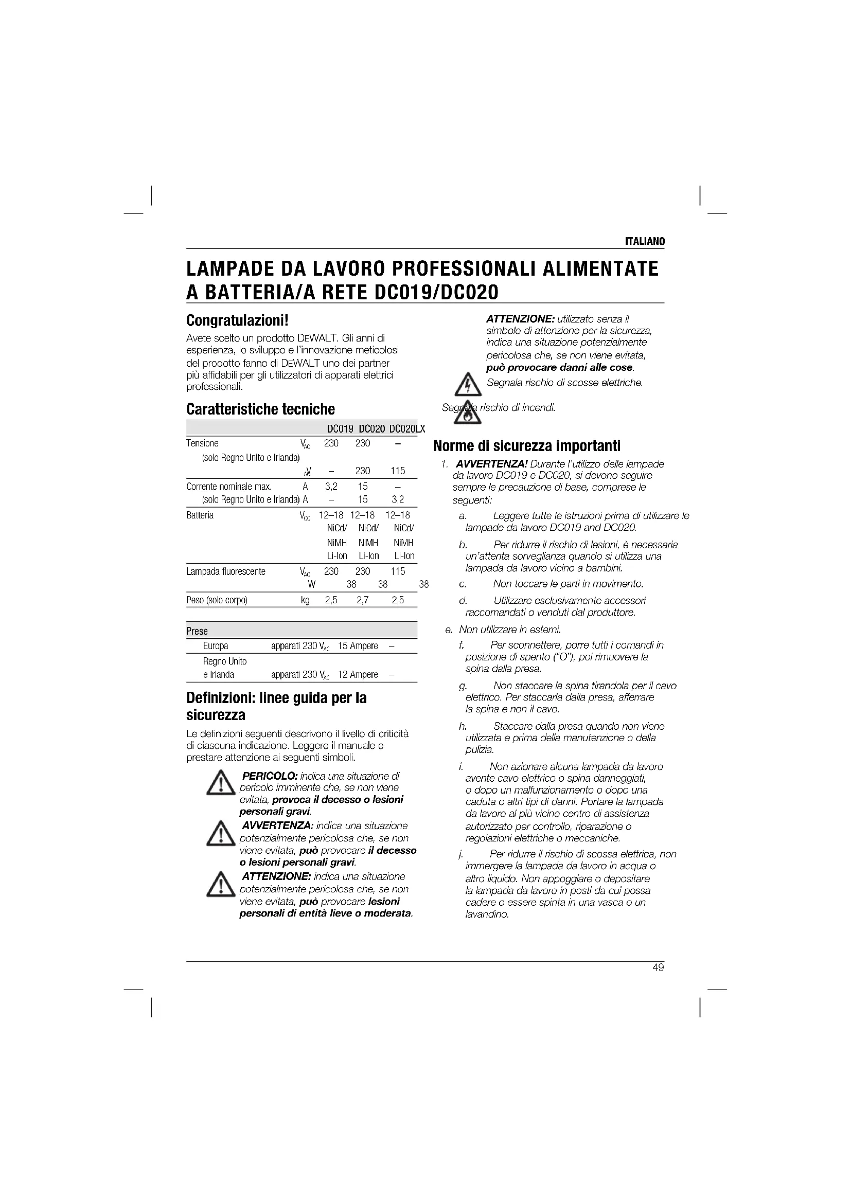 avente cavo elettrico o spina danneggiati, o dopo un malfunzionamento o dopo una caduta o altri tipi di danni. Portare la lampada da lavoro al più vicino centro di assistenza autorizzato per controllo, riparazione o regolazioni elettriche o meccaniche. j. Per ridurre il rischio di scossa elettrica, non immergere la lampada da lavoro in acqua o altro liquido. Non appoggiare o depositare la lampada da lavoro in posti da cui possa cadere o essere spinta in una vasca o un lavandino. Congratulazioni! Avete scelto un prodotto DEWALT. Gli anni di esperienza, lo sviluppo e l’innovazione meticolosi del prodotto fanno di DEWALT uno dei partner più affidabili per gli utilizzatori di apparati elettrici professionali. Caratteristiche tecniche DC019 DC020 DC020LX Tensione V