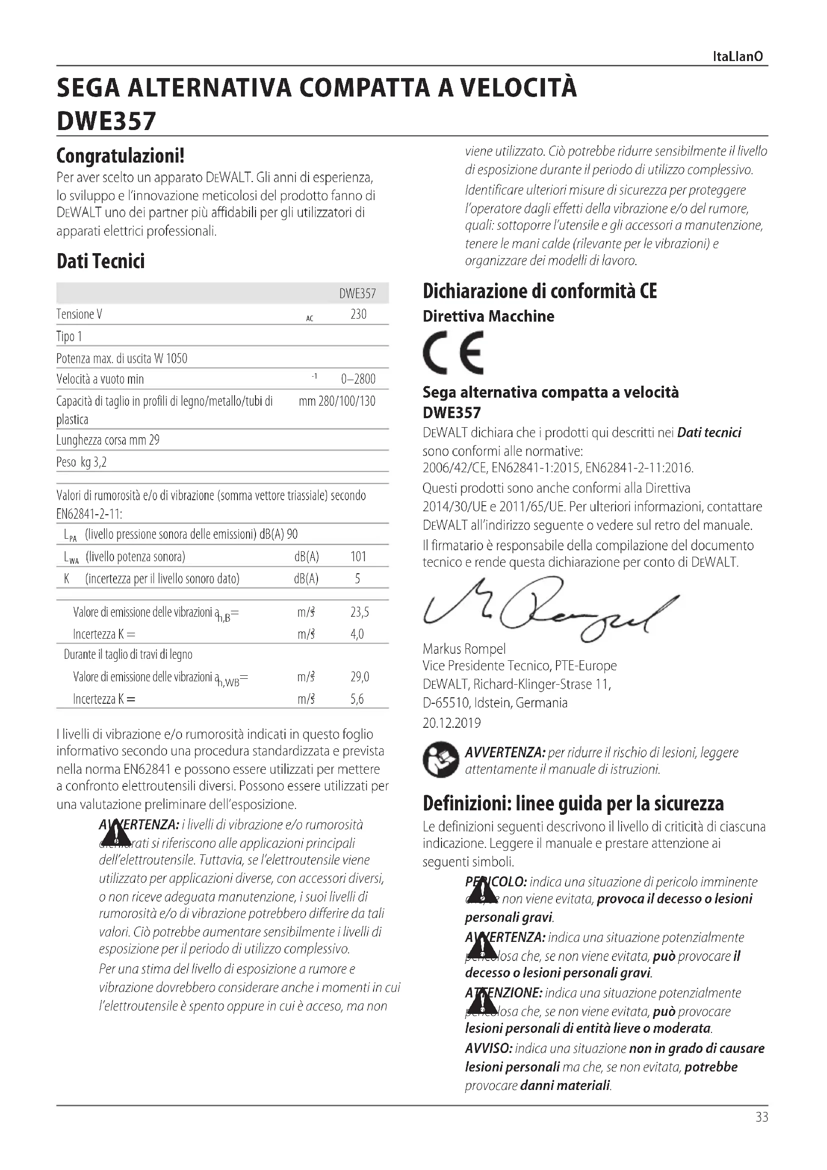 ATTENZIONE: indica una situazione potenzialmente pericolosa che, se non viene evitata, può provocare lesioni personali di entità lieve omoderata. AVVISO: indica una situazione non in grado di causare lesioni personali ma che, se non evitata, potrebbe provocare dannimateriali. Dichiarazione di conformità CE Direttiva Macchine Sega alternativa compatta a velocità DWE357 DeWALT dichiara che i prodotti qui descritti nei Dati tecnici sono conformi alle normative: 2006/42/CE, EN62841-1:2015, EN62841-2-11:2016. Questi prodotti sono anche conformi alla Direttiva 2014/30/UE e 2011/65/UE. Per ulteriori informazioni, contattare DeWALT all’indirizzo seguente o vedere sul retro delmanuale. Il firmatario è responsabile della compilazione del documento tecnico e rende questa dichiarazione per conto diDeWALT. Markus Rompel Vice Presidente Tecnico, PTE-Europe DeWALT, Richard-Klinger-Strase 11, D-65510, Idstein, Germania