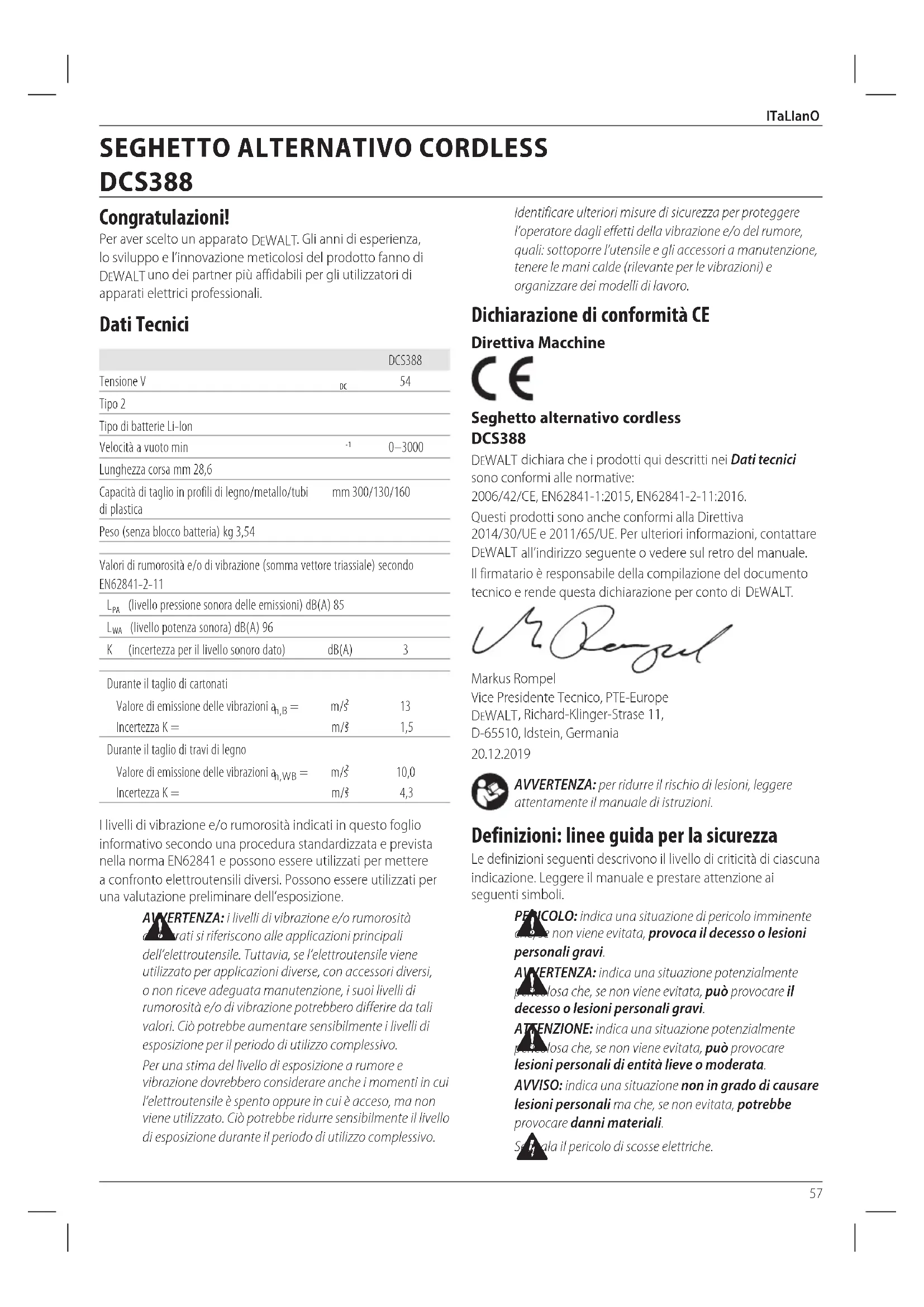 Segnala il pericolo di scosseelettriche. Dichiarazione di conformità CE Direttiva Macchine Seghetto alternativo cordless DCS388 DeWALT dichiara che i prodotti qui descritti nei Dati tecnici sono conformi alle normative: 2006/42/CE, EN62841-1:2015, EN62841-2-11:2016. Questi prodotti sono anche conformi alla Direttiva 2014/30/UE e 2011/65/UE. Per ulteriori informazioni, contattare DeWALT all’indirizzo seguente o vedere sul retro delmanuale. Il firmatario è responsabile della compilazione del documento tecnico e rende questa dichiarazione per conto di DeWALT