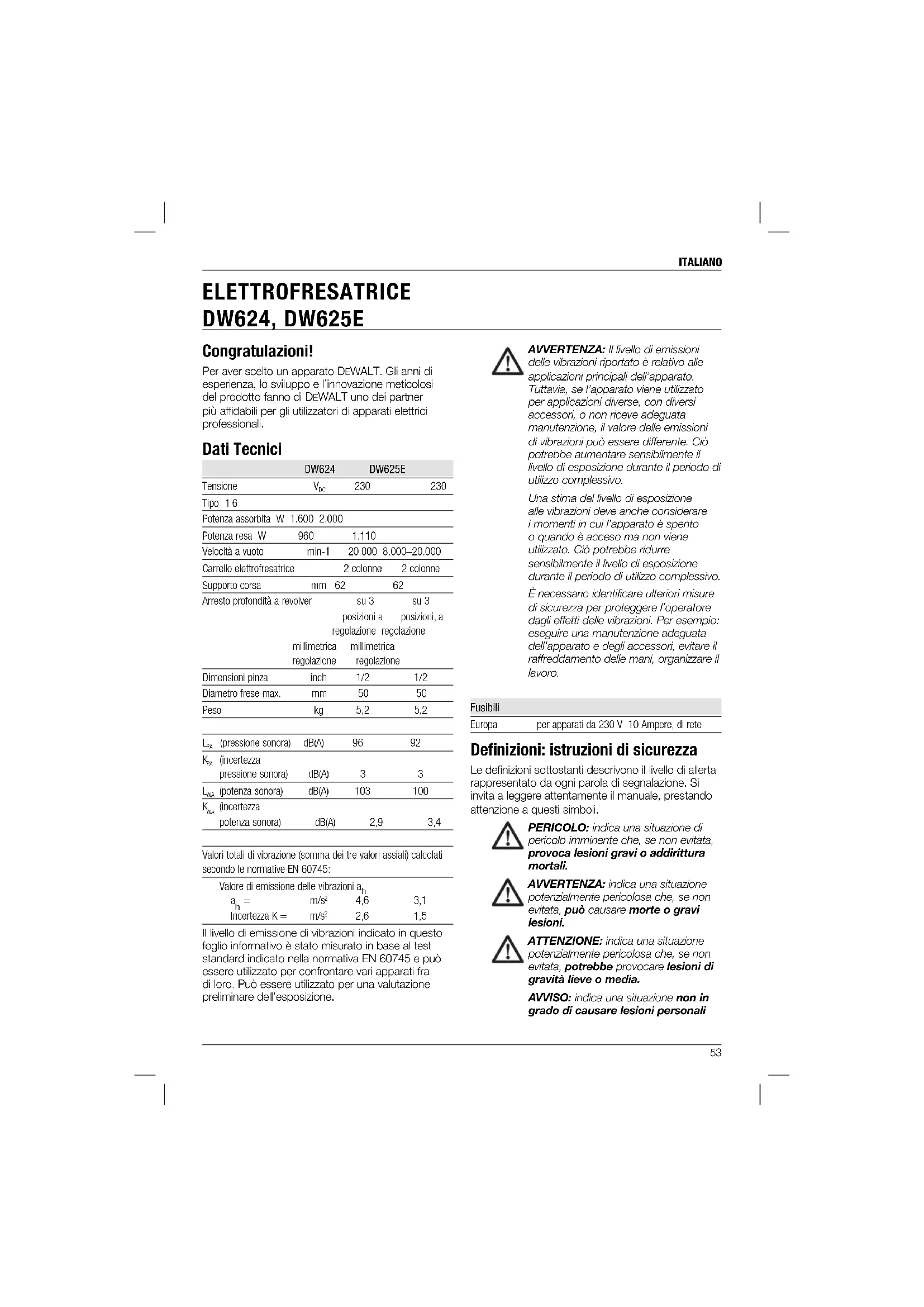 ELETTROFRESATRICE DW624, DW625E Congratulazioni! Per aver scelto un apparato DEWALT. Gli anni di esperienza, lo sviluppo e l’innovazione meticolosi del prodotto fanno di DEWALT uno dei partner più affidabili per gli utilizzatori di apparati elettrici professionali. Dati Tecnici DW624 DW625E Tensione V