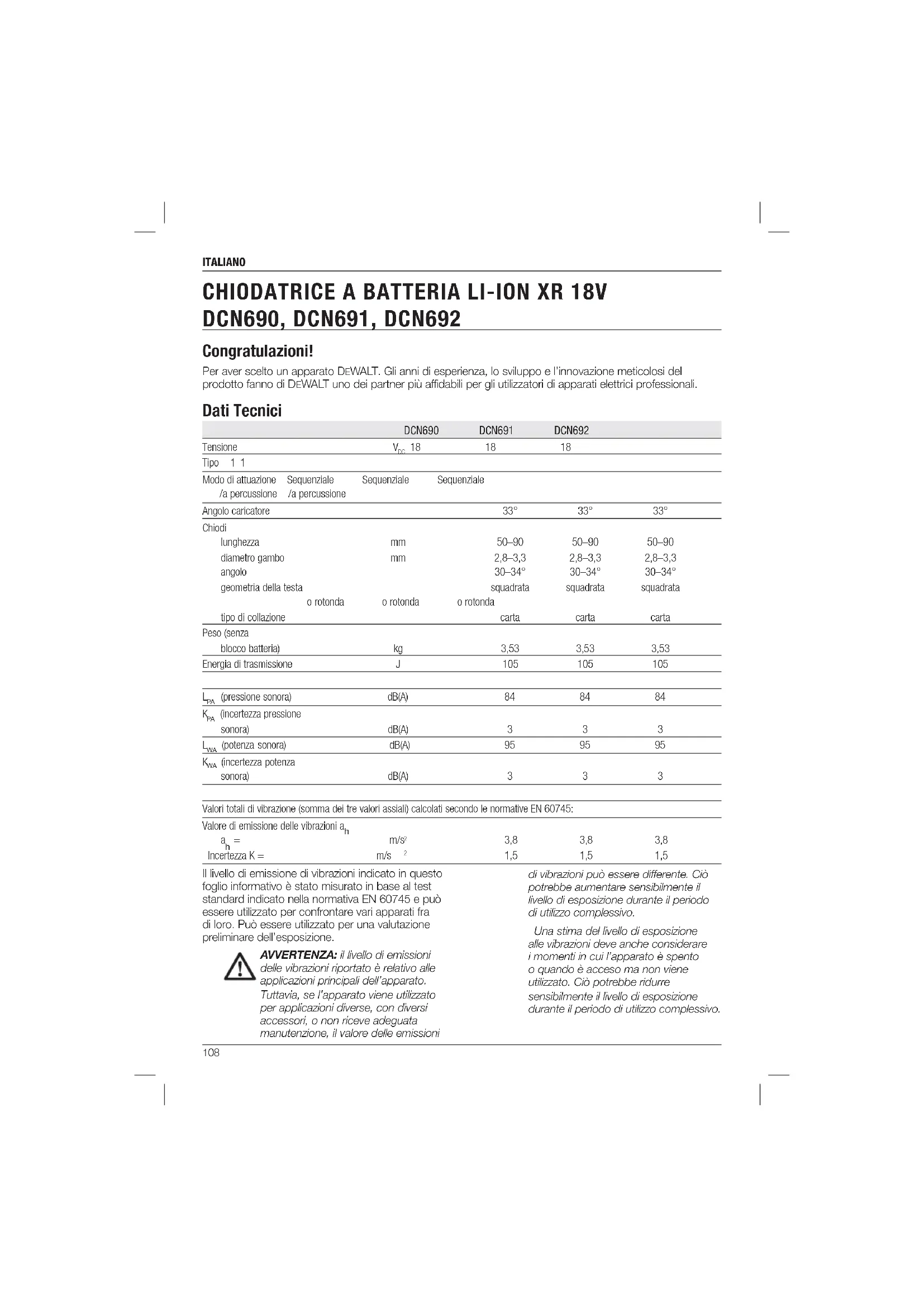 Congratulazioni! Per aver scelto un apparato DEWALT. Gli anni di esperienza, lo sviluppo e l’innovazione meticolosi del prodotto fanno di D EWALT uno dei partner più affidabili per gli utilizzatori di apparati elettrici professionali. Dati Tecnici