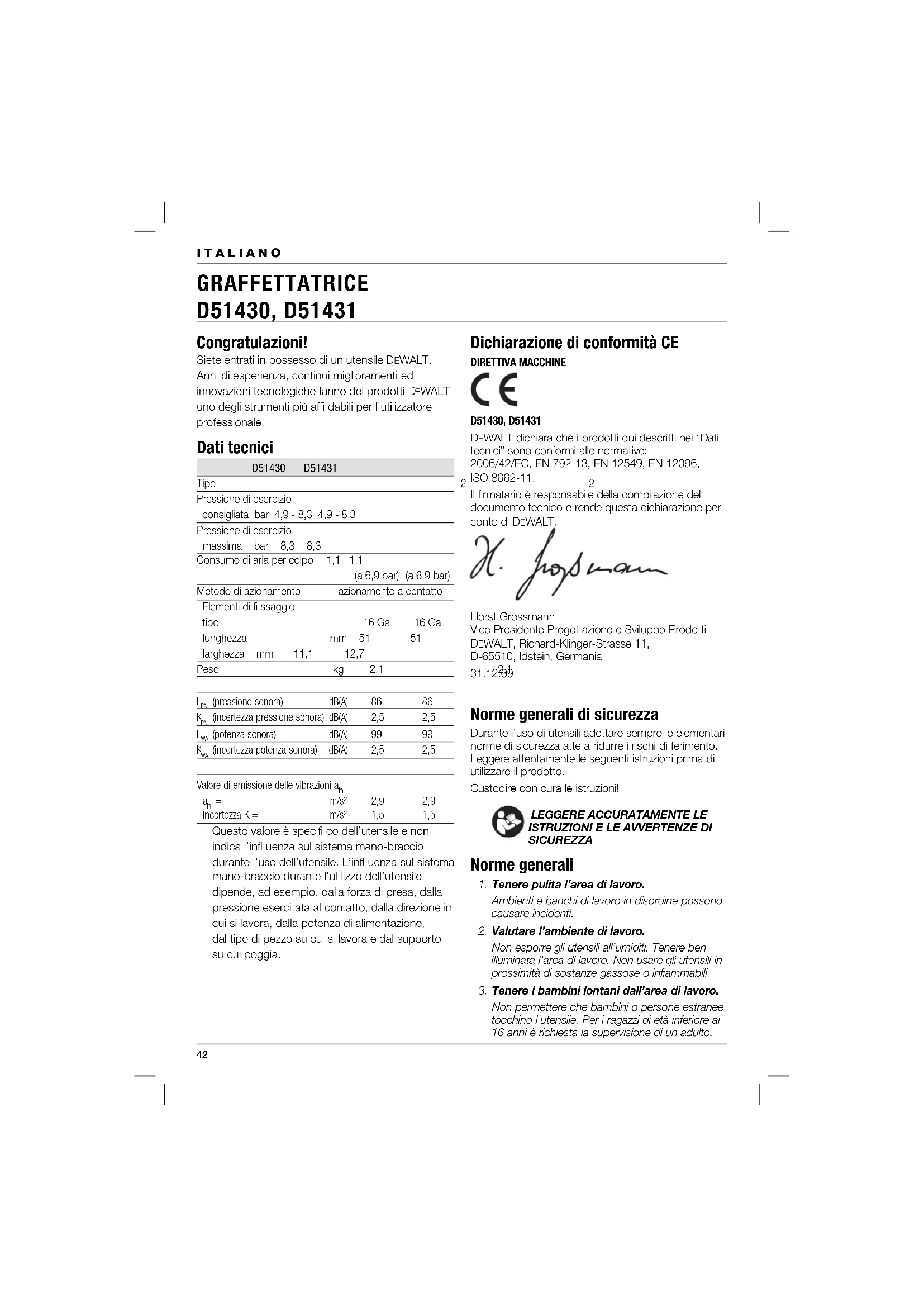 m/s² 2,9 2,9 Incertezza K = m/s² 1,5 1,5 Questo valore è specifi co dell’utensile e non indica l’infl uenza sul sistema mano-braccio durante l’uso dell’utensile. L’infl uenza sul sistema mano-braccio durante l’utilizzo dell’utensile dipende, ad esempio, dalla forza di presa, dalla pressione esercitata al contatto, dalla direzione in cui si lavora, dalla potenza di alimentazione, dal tipo di pezzo su cui si lavora e dal supporto su cui poggia. Dichiarazione di conformità CE DIRETTIVA MACCHINE D51430, D51431 DEWALT dichiara che i prodotti qui descritti nei “Dati tecnici” sono conformi alle normative: 2006/42/EC, EN 792-13, EN 12549, EN 12096, ISO 8662-11. Il firmatario è responsabile della compilazione del documento tecnico e rende questa dichiarazione per conto di DEWALT. Horst Grossmann Vice Presidente Progettazione e Sviluppo Prodotti DEWALT, Richard-Klinger-Strasse 11, D-65510, Idstein, Germania
