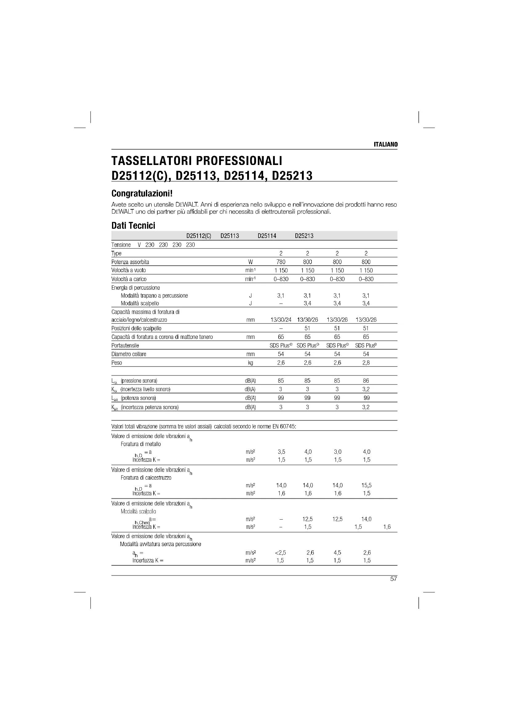 TASSELLATORI PROFESSIONALI D25112(C), D25113, D25114, D25213 Congratulazioni! Avete scelto un utensile DEWALT. Anni di esperienza nello sviluppo e nell’innovazione dei prodotti hanno reso DEWALT uno dei partner più affidabili per chi necessita di elettroutensili professionali. Dati Tecnici D25112(C) D25113 D25114 D25213 Tensione V 230 230 230 230 Type 2 2 2 2 Potenza assorbita W 780 800 800 800 Velocità a vuoto min
