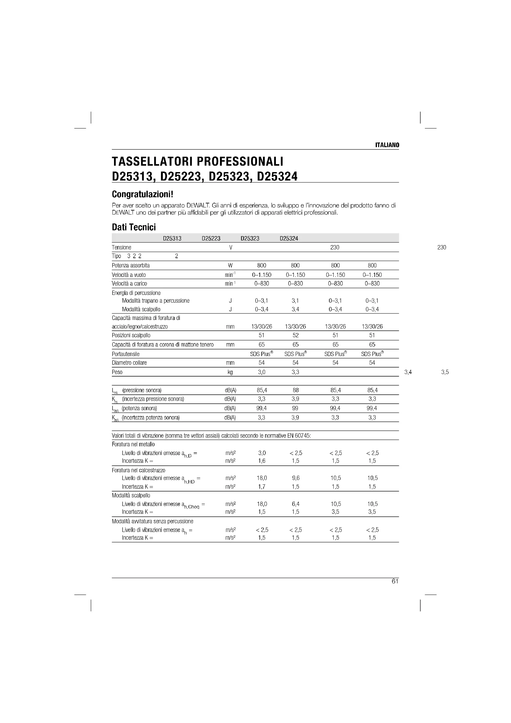 TASSELLATORI PROFESSIONALI D25313, D25223, D25323, D25324 Congratulazioni! Per aver scelto un apparato DEWALT. Gli anni di esperienza, lo sviluppo e l’innovazione del prodotto fanno di DEWALT uno dei partner più affidabili per gli utilizzatori di apparati elettrici professionali. Dati Tecnici D25313 D25223 D25323 D25324 Tensione V 230 230 230 230 Tipo 3 2 2 2 Potenza assorbita W 800 800 800 800 Velocità a vuoto min