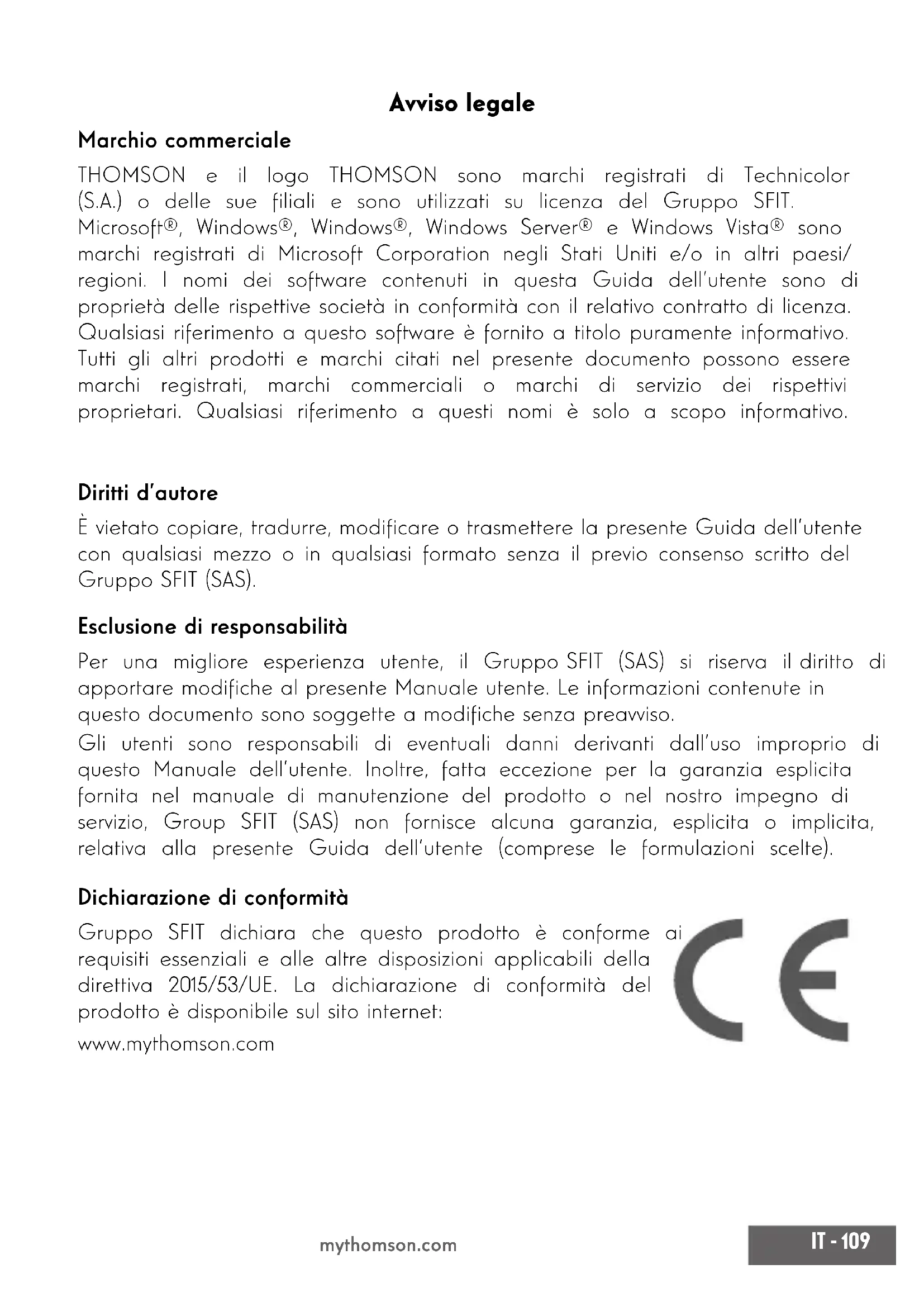 - La batteria del dispositivo Thomson può presentare un rischio di incendio o di ustione se viene rimossa o smontata.