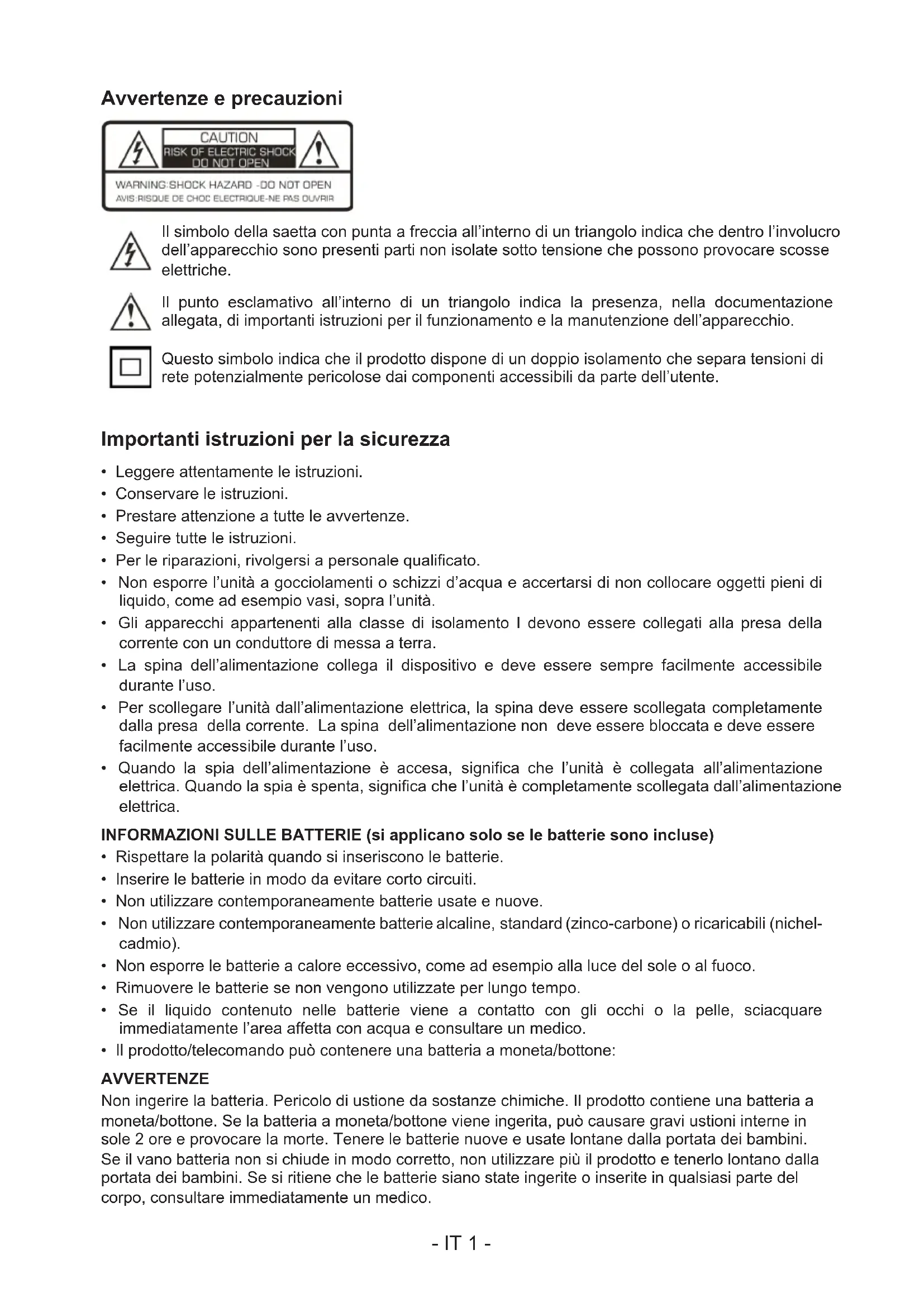 PRIMA DI UTILIZZARE IL PRODOTTO, LEGGERE ATTENTAMENTE LE ISTRUZIONI PER L’USO E CONSERVARLE PER CONSULTAZIONI FUTURE. IT- IT 1 - Avvertenze e precauzioni Il simbolo della saetta con punta a freccia all’interno di un triangolo indica che dentro l’involucro dell’apparecchio sono presenti parti non isolate sotto tensione che possono provocare scosse elettriche. Il punto esclamativo all’interno di un triangolo indica la presenza, nella documentazione allegata, di importanti istruzioni per il funzionamento e la manutenzione dell’apparecchio. Questo simbolo indica che il prodotto dispone di un doppio isolamento che separa tensioni di rete potenzialmente pericolose dai componenti accessibili da parte dell’utente. Importanti istruzioni per la sicurezza