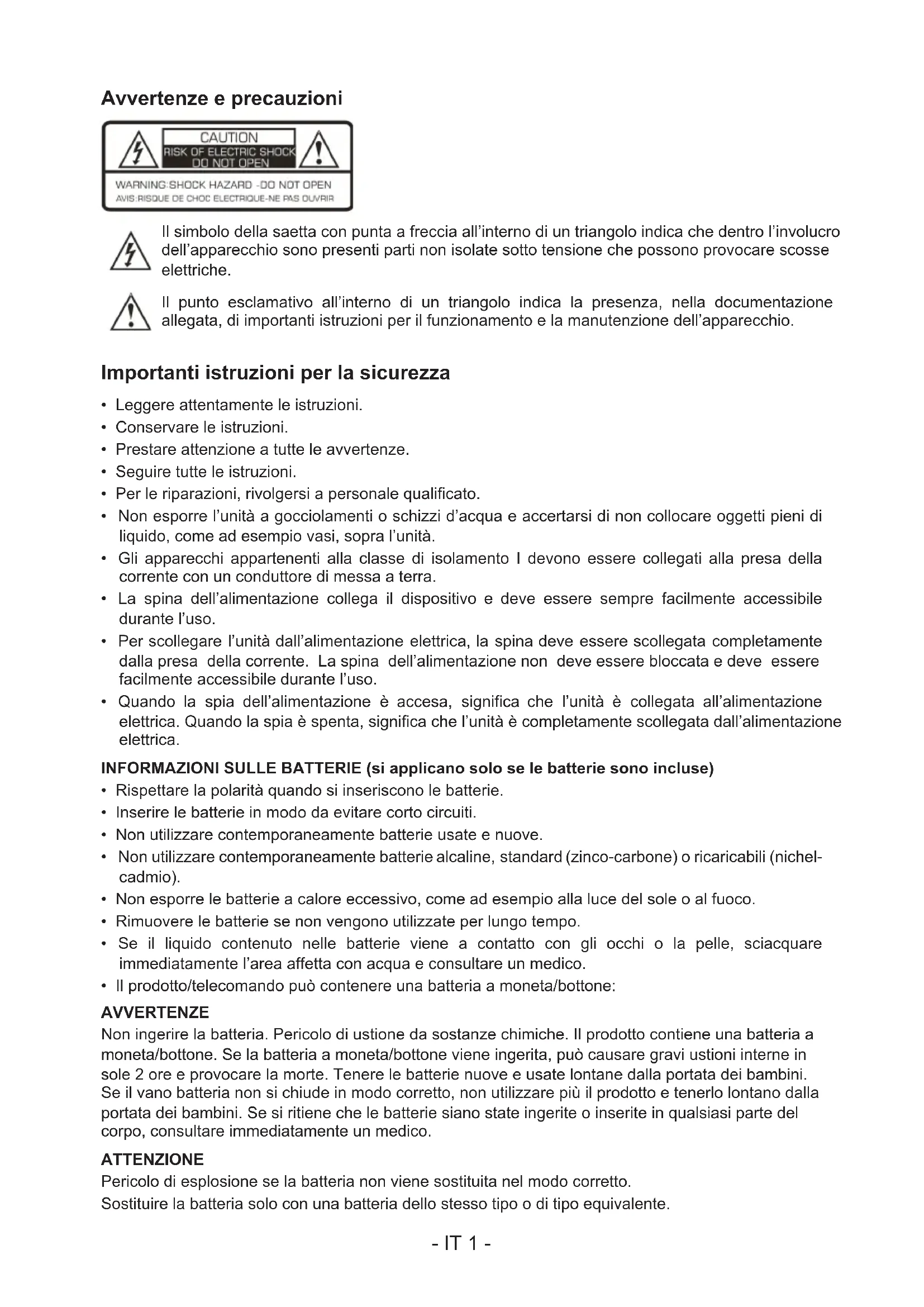 PRIMA DI UTILIZZARE IL PRODOTTO, LEGGERE ATTENTAMENTE LE ISTRUZIONI PER L’USO E CONSERVARLE PER CONSULTAZIONI FUTURE. IT- IT 1 - Avvertenze e precauzioni Il simbolo della saetta con punta a freccia all’interno di un triangolo indica che dentro l’involucro dell’apparecchio sono presenti parti non isolate sotto tensione che possono provocare scosse elettriche. Il punto esclamativo all’interno di un triangolo indica la presenza, nella documentazione allegata, di importanti istruzioni per il funzionamento e la manutenzione dell’apparecchio. Importanti istruzioni per la sicurezza