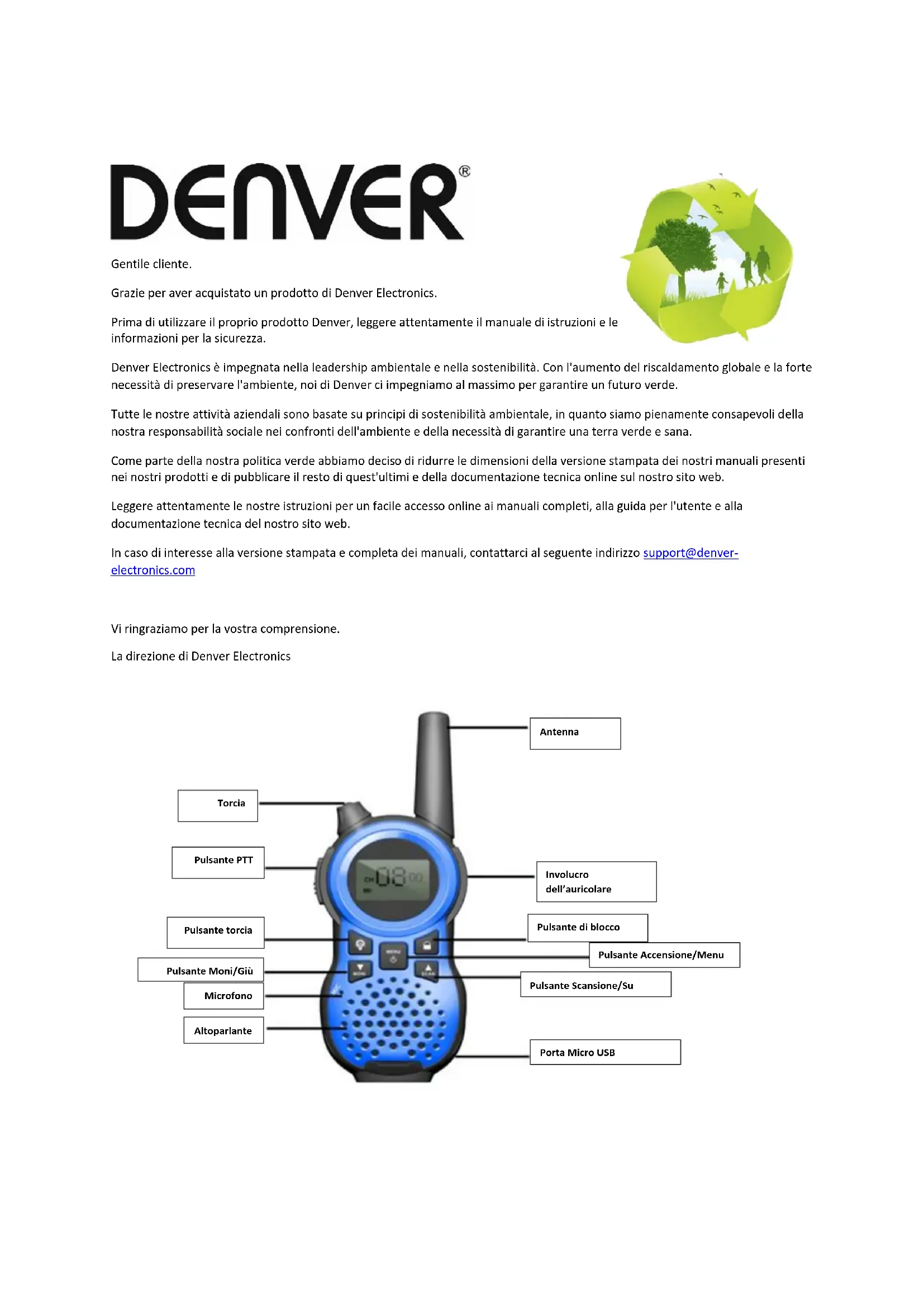 Omega 5A, Soeften DK-8382 Hinnerup Danemark www.facebook.com/denverelectronicsGentile cliente. Grazie per aver acquistato un prodotto di Denver Electronics. Prima di utilizzare il proprio prodotto Denver, leggere attentamente il manuale di istruzioni e le informazioni per la sicurezza. Denver Electronics è impegnata nella leadership ambientale e nella sostenibilità. Con l'aumento del riscaldamento globale e la forte necessità di preservare l'ambiente, noi di Denver ci impegniamo al massimo per garantire un futuro verde. Tutte le nostre attività aziendali sono basate su principi di sostenibilità ambientale, in quanto siamo pienamente consapevoli della nostra responsabilità sociale nei confronti dell'ambiente e della necessità di garantire una terra verde e sana. Come parte della nostra politica verde abbiamo deciso di ridurre le dimensioni della versione stampata dei nostri manuali presenti nei nostri prodotti e di pubblicare il resto di quest'ultimi e della documentazione tecnica online sul nostro sito web. Leggere attentamente le nostre istruzioni per un facile accesso online ai manuali completi, alla guida per l'utente e alla documentazione tecnica del nostro sito web. In caso di interesse alla versione stampata e completa dei manuali, contattarci al seguente indirizzo support@denver- electronics.com Vi ringraziamo per la vostra comprensione. La direzione di Denver Electronics