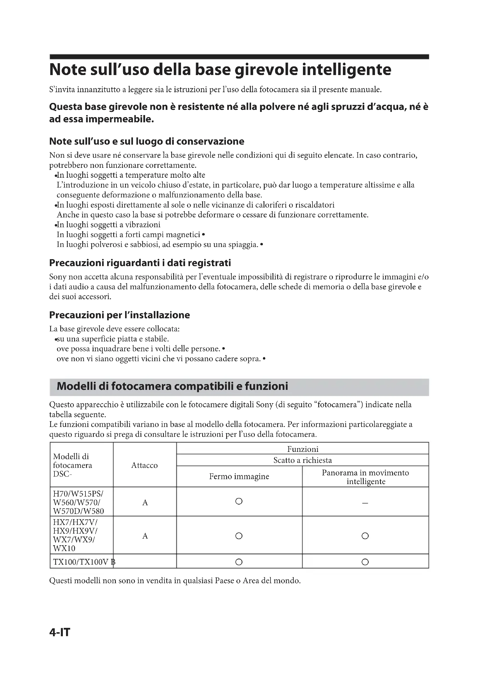- Caratteristiche tecniche -IT Note sull’uso della base girevole intelligente S’invita innanzitutto a leggere sia le istruzioni per l’uso della fotocamera sia il presente manuale. Questa base girevole non è resistente né alla polvere né agli spruzzi d’acqua, né è ad essa impermeabile. Note sull’uso e sul luogo di conservazione Non si deve usare né conservare la base girevole nelle condizioni qui di seguito elencate. In caso contrario, potrebbero non funzionare correttamente. In luoghi soggetti a temperature molto alte L’introduzione in un veicolo chiuso d’estate, in particolare, può dar luogo a temperature altissime e alla conseguente deformazione o malfunzionamento della base. In luoghi esposti direttamente al sole o nelle vicinanze di caloriferi o riscaldatori Anche in questo caso la base si potrebbe deformare o cessare di funzionare correttamente. In luoghi soggetti a vibrazioni In luoghi soggetti a forti campi magnetici ˎ In luoghi polverosi e sabbiosi, ad esempio su una spiaggia. ˎ Precauzioni riguardanti i dati registrati Sony non accetta alcuna responsabilità per l’eventuale impossibilità di registrare o riprodurre le immagini e/o i dati audio a causa del malfunzionamento della fotocamera, delle schede di memoria o della base girevole e dei suoi accessori. Precauzioni per l’installazione La base girevole deve essere collocata: su una superficie piatta e stabile. ove possa inquadrare bene i volti delle persone. ˎ ove non vi siano oggetti vicini che vi possano cadere sopra. ˎ Modelli di fotocamera compatibili e funzioni Questo apparecchio è utilizzabile con le fotocamere digitali Sony (di seguito “fotocamera”) indicate nella tabella seguente. Le funzioni compatibili variano in base al modello della fotocamera. Per informazioni particolareggiate a questo riguardo si prega di consultare le istruzioni per l’uso della fotocamera. Modelli di fotocamera DSC- Attacco Funzioni Scatto a richiesta Fermo immagine Panorama in movimento intelligente H70/W515PS/ W560/W570/ W570D/W580 p. 154