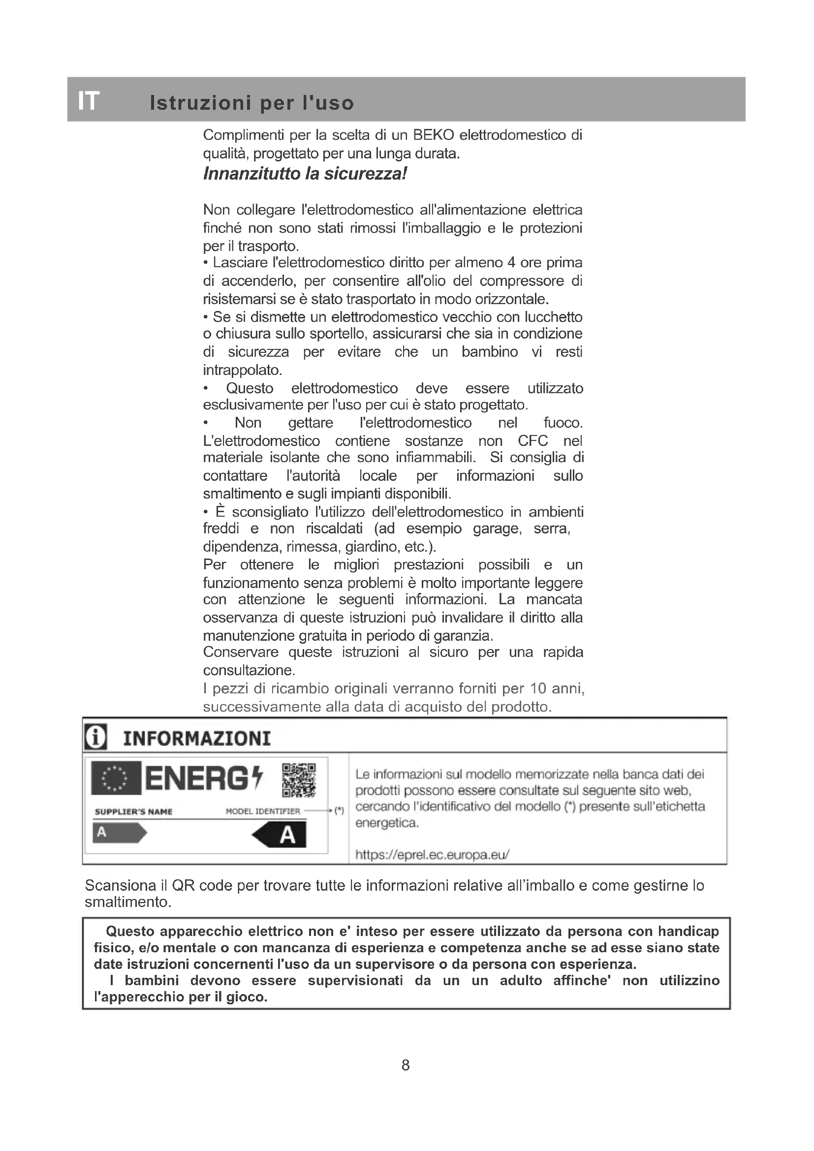 IT Istruzioni per l'uso Questo apparecchio elettrico non e' inteso per essere utilizzato da persona con handicap fisico, e/o mentale o con mancanza di esperienza e competenza anche se ad esse siano state date istruzioni concernenti l'uso da un supervisore o da persona con esperienza. I bambini devono essere supervisionati da un un adulto affinche' non utilizzino l'apperecchio per il gioco.