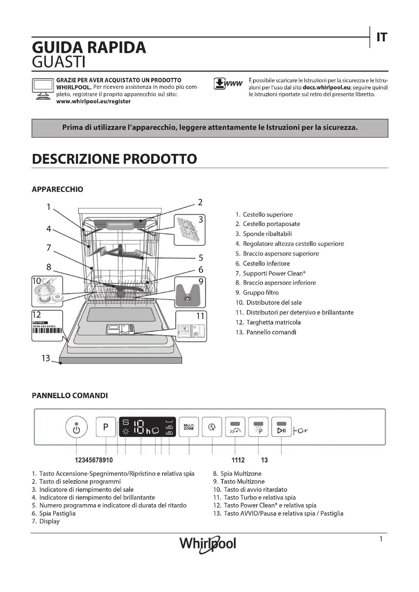 Prima di utilizzare l’apparecchio, leggere attentamente le Istruzioni per la sicurezza. APPARECCHIO DESCRIZIONE PRODOTTO 1. Cestello superiore2. Cestello portaposate3. Sponde ribaltabili4. Regolatore altezza cestello superiore5. Braccio aspersore superiore6. Cestello inferiore7. Supporti Power Clean® 8. Braccio aspersore inferiore9. Gruppo ltro10. Distributore del sale11. Distributori per detersivo e brillantante12. Targhetta matricola13. Pannello comandi1. Tasto Accensione-Spegnimento/Ripristino e relativa spia2. Tasto di selezione programmi3. Indicatore di riempimento del sale4. Indicatore di riempimento del brillantante5. Numero programma e indicatore di durata del ritardo6. Spia Pastiglia7. Display8. Spia Multizone9. Tasto Multizone10. Tasto di avvio ritardato11. Tasto Turbo e relativa spia12. Tasto Power Clean® e relativa spia13. Tasto AVVIO/Pausa e relativa spia / Pastiglia GUIDA RAPIDA GUASTI PANNELLO COMANDI GRAZIE PER AVER ACQUISTATO UN PRODOTTO WHIRLPOOL Per ricevere assistenza in modo più com-pleto, registrare il proprio apparecchio sul sito: www.whirlpool.eu/registerÈ possibile scaricare le Istruzioni per la sicurezza e le Istru-zioni per l’uso dal sito docs.whirlpool.eu; seguire quindi le istruzioni riportate sul retro del presente libretto.0000 000 00000 Service: