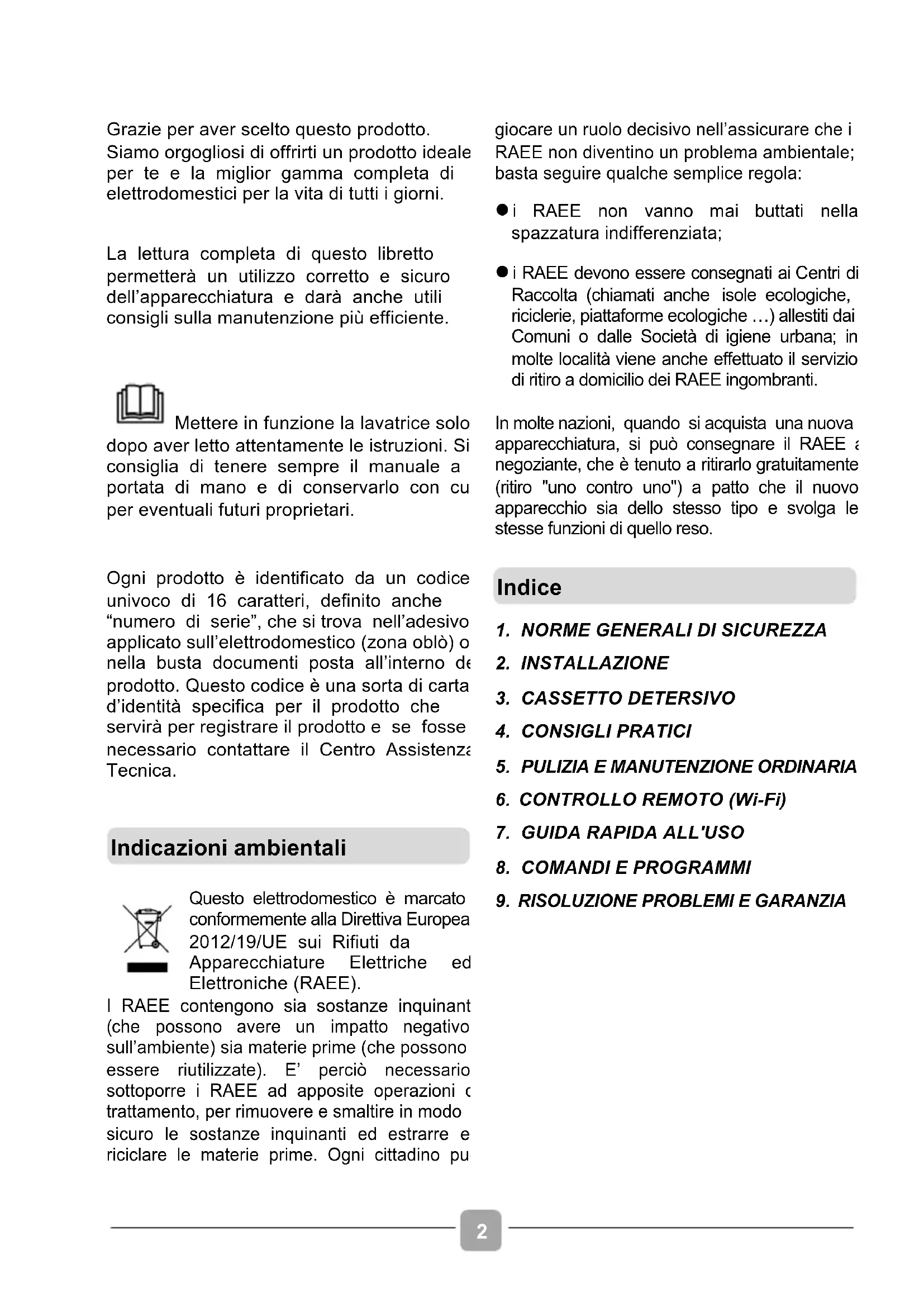 Grazie per aver scelto questo prodotto. Siamo orgogliosi di offrirti un prodotto ideale per te e la miglior gamma completa di elettrodomestici per la vita di tutti i giorni. La lettura completa di questo libretto permetterà un utilizzo corretto e sicuro dell’apparecchiatura e darà anche utili consigli sulla manutenzione più efficiente. Mettere in funzione la lavatrice solo dopo aver letto attentamente le istruzioni. Si consiglia di tenere sempre il manuale a portata di mano e di conservarlo con cura per eventuali futuri proprietari. Ogni prodotto è identificato da un codice univoco di 16 caratteri, definito anche “numero di serie”, che si trova nell’adesivo applicato sull’elettrodomestico (zona oblò) o nella busta documenti posta all’interno del prodotto. Questo codice è una sorta di carta d’identità specifica per il prodotto che servirà per registrare il prodotto e se fosse necessario contattare il Centro Assistenza Tecnica.