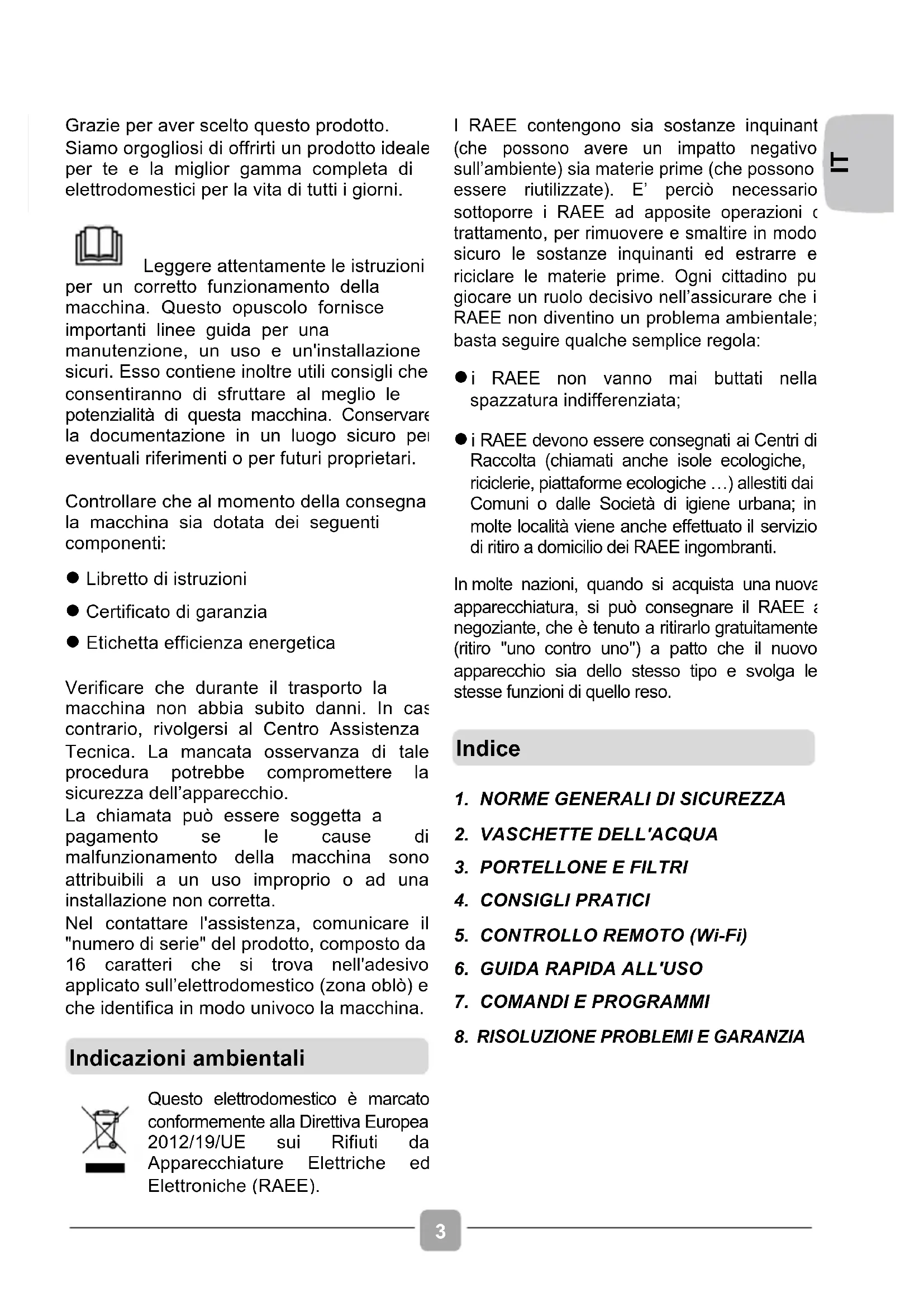 Grazie per aver scelto questo prodotto. Siamo orgogliosi di offrirti un prodotto ideale per te e la miglior gamma completa di elettrodomestici per la vita di tutti i giorni. Leggere attentamente le istruzioni per un corretto funzionamento della macchina. Questo opuscolo fornisce importanti linee guida per una manutenzione, un uso e un'installazione sicuri. Esso contiene inoltre utili consigli che consentiranno di sfruttare al meglio le potenzialità di questa macchina. Conservare la documentazione in un luogo sicuro per eventuali riferimenti o per futuri proprietari. Controllare che al momento della consegna la macchina sia dotata dei seguenti componenti: ! Libretto di istruzioni ! Certificato di garanzia ! Etichetta efficienza energetica Verificare che durante il trasporto la macchina non abbia subito danni. In caso contrario, rivolgersi al Centro Assistenza Tecnica. La mancata osservanza di tale procedura potrebbe compromettere la sicurezza dell’apparecchio. La chiamata può essere soggetta a pagamento se le cause di malfunzionamento della macchina sono attribuibili a un uso improprio o ad una installazione non corretta. Nel contattare l'assistenza, comunicare il "numero di serie" del prodotto, composto da 16 caratteri che si trova nell'adesivo applicato sull’elettrodomestico (zona oblò) e che identifica in modo univoco la macchina.